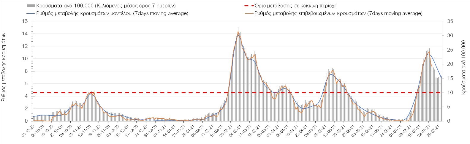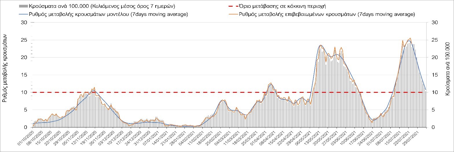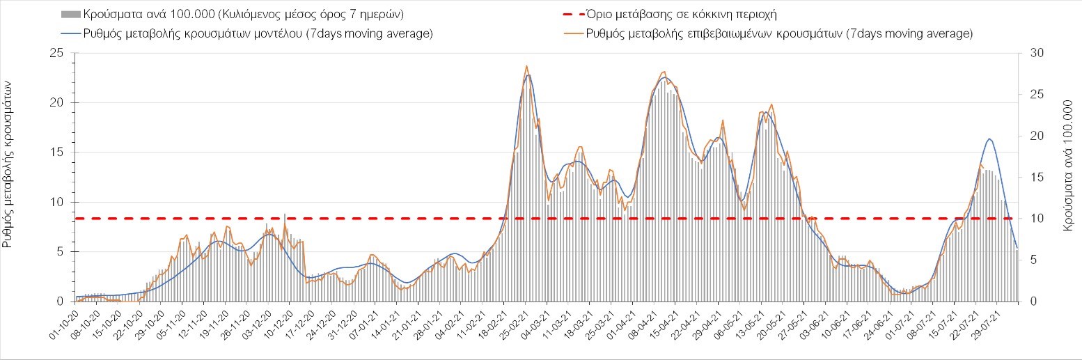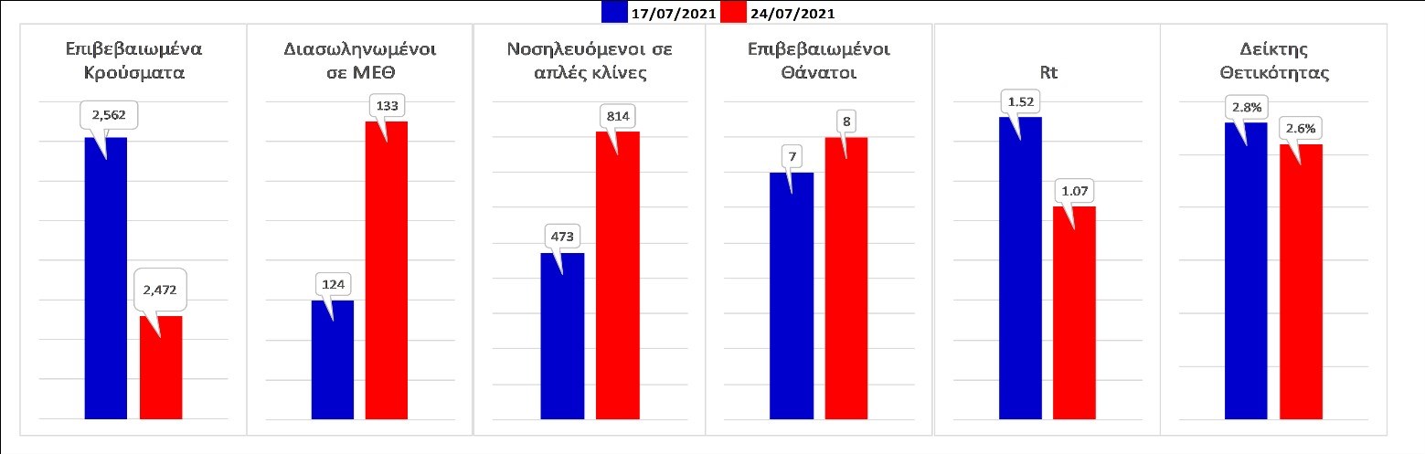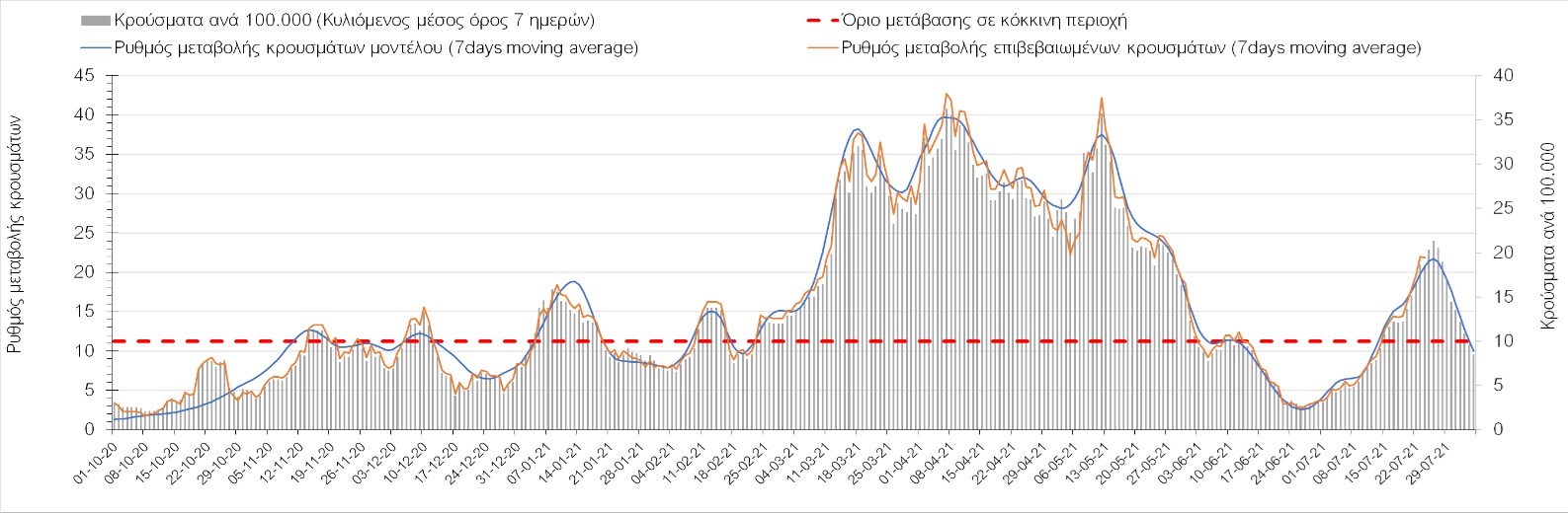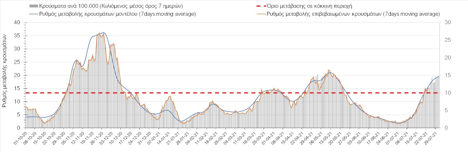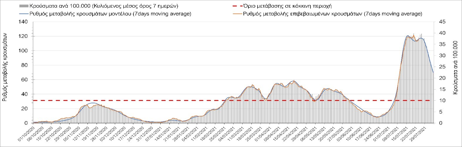 Σχήμα 58. Συγκριτικά αποτελέσματα της επιδημιολογικής εικόνας του σημερινού Σαββάτου (24/07/2021) σε σχέση με την προηγούμενη (27/07/2021) Όσον αφορά επιμέρους περιοχές, αρκετές πλέον βρίσκονται πάνω από το όριο χαρακτηρισμού ως κόκκινες, όπως η Αθήνα, η Θεσσαλονίκη η Λάρισα, η Μαγνησία, η Καρδίτσα, τα Τρίκαλα, η Αχαΐα, η Αργολίδα, η Αρκαδία, η Ηλεία, η Κορινθία, η Μεσσηνία, η Εύβοια, η Βοιωτία, τη Φωκίδα, τα Ιωάννινα, η Θεσπρωτία, τα Γρεβενά, η Κοζάνη, η Φλώρινα, η Χαλκιδική, ο Έβρος, το Ηράκλειο, τα Χανιά, το Ρέθυμνο, το Λασίθι, η Κέρκυρα, η Λέσβος, η Πάρος, η Ζάκυνθος, η Μύκονος, η Σαντορίνη και η Ρόδος, ενώ παρατηρούνται έντονα ανοδικές τάσεις στην Άρτα, στην Καβάλα, στη Πιερία, στη Ξάνθη και στη Χίο. Ιδιαίτερα στην Αθήνα (παρά την πτωτική πορεία), προβληματίζει ο βαθμός που αυτή σχετίζεται με την εξάπλωση μεταλλαγμένων και ταχύτερα μεταδιδόμενων στελεχών (κυρίως το Β.1.1.318 και το Β.1.167). Χαρακτηριστικό παράδειγμα της αυξημένης μεταδοτικότητας του στελέχους Δ (Β.1.167) αποτελεί η Κρήτη. Συνολικά η Κρήτη είναι η περιοχή με τη χειρότερη επιδημιολογική εικόνα και η ταχύτητα μετάδοσης (και το αντίστοιχο ύψος του 4ου κύματος που έχει διαμορφωθεί) είναι ενδεικτική της αυξημένης μεταδοτικότητας του στελέχους Δ. Επίσης, καταδεικνύει τον αρνητικό ρόλο που παίζουν οι διαπεριφερειακές μετακινήσεις στη φάση ανάπτυξης της πανδημίας, καθώς η αρχική αύξηση κρουσμάτων στο Ρέθυμνο πρώτα και στο Ηράκλειο έπειτα, ακολουθήθηκε από αυξητική πορεία της διασποράς στα Χανιά και στο Λασίθι. Στην πράξη, η Κρήτη είναι μια περιοχή οδικά απομονωμένη από την υπόλοιπη Ελλάδα, στην οποία, οι διαπεριφερειακές μετακινήσεις επέτρεψαν τη γρήγορη διασπορά του στελέχους Δ. Παρόμοια φαινόμενα διαπεριφερειακής μετάδοσης παρατηρούνται στη Θεσσαλία, αλλά σε πιο ήπια έκταση, όπου η έντονα αυξητική τάση στη Μαγνησία, μεταφέρθηκε σε κάποιο βαθμό και στη Λάρισα, ενώ ακολουθεί και η Καρδίτσα. Αντίστοιχη είναι η διάχυση της διασποράς στην Ήπειρο και πιο συγκεκριμένα από τα Ιωάννινα προς τα εγγύς τουριστικά θέρετρα (Πρέβεζα και Θεσπρωτία). Συνεπώς, ακόμα και για περιοχές που για την ώρα είναι κάτω από το όριο (ή πολύ κοντά στο όριο), οι ανοδικές τάσεις που παρατηρούνται χρήζουν αυξημένης επιδημιολογικής επιτήρησης με εντατικοποίηση του γονιδιωματικού ελέγχου ώστε να ληφθούν εγκαίρως μέτρα περιορισμού της διασποράς του ιού.Επίσης, σύμφωνα με τα πιο πρόσφατα στοιχεία που έγιναν διαθέσιμα, ανησυχία πλέον δημιουργεί η αύξηση του ποσοστού διασποράς του μεταλλαγμένου στελέχους Β.1.617.2 (μετάλλαξη Δέλτα) σε συγκεκριμένες περιοχές για το 15νθήμερο από 04/07/2021 έως 18/07/2021, όπου οι αντίστοιχες ποσοστώσεις είναι 25.13% για την Αττική, 6.67% για τη Δυτική Ελλάδα, 33.33% για τις Ιόνιες Νήσους, 24.32% για την Πελοπόννησο, 79.59% για την Κρήτη και 50% για την Ήπειρο. Με δεδομένα τα υπάρχοντα ανοίγματα, την παρουσία των μεταλλάξεων και την έλευση των τουριστικών ροών είναι ακόμα πιο σημαντική η τήρηση των μέτρων, με κυριότερη την ορθή και μαζική εφαρμογή των self-test, με ταυτόχρονη αύξηση της ιχνηλασίας των επαφών των ανιχνευθέντων ως θετικοί και καραντίνα 14 ημερών για τους συμπολίτες μας που θα επιβεβαιωθεί ότι είναι θετικοί στην μόλυνση με SARS-CoV-2 ακόμη και αν είναι ασυμπτωματικοί. Η σημασία και η αποτελεσματικότητα των self-test και του εμβολιασμού έχει ήδη φανεί τις προηγούμενες 12 εβδομάδες. Με δεδομένη την εμφάνιση της μετάλλαξης Β.1.617 ο πλήρ