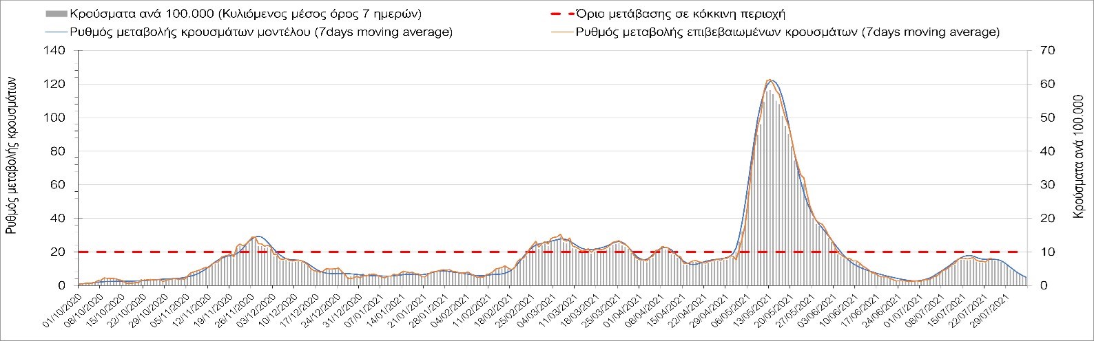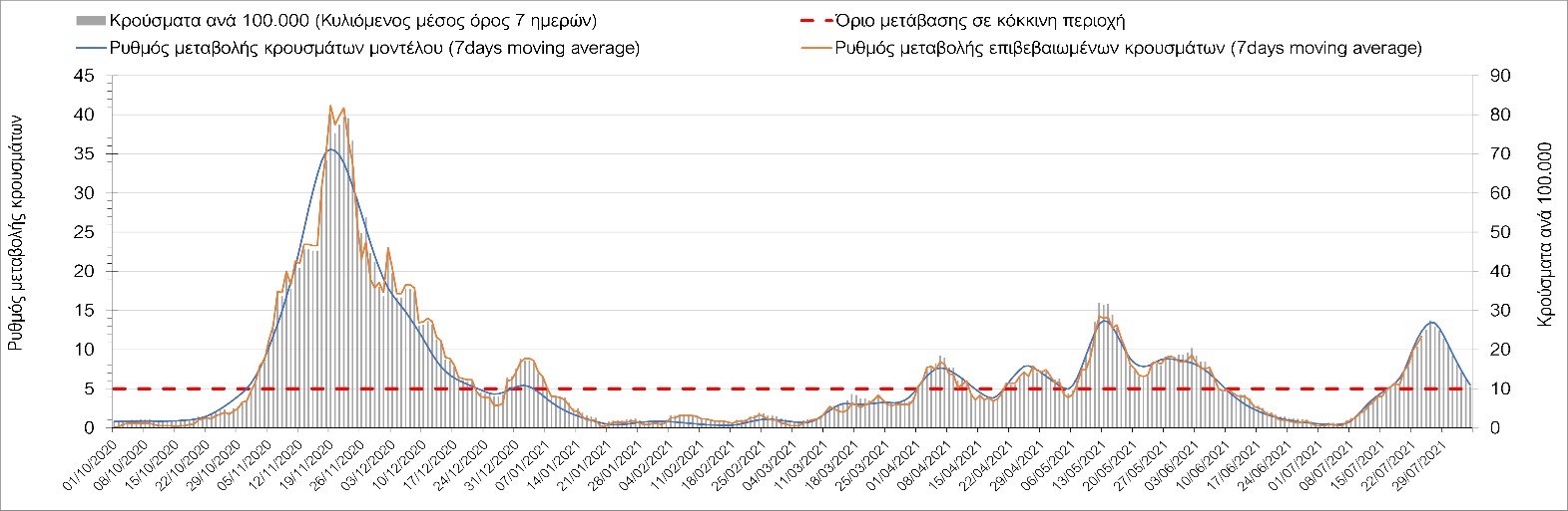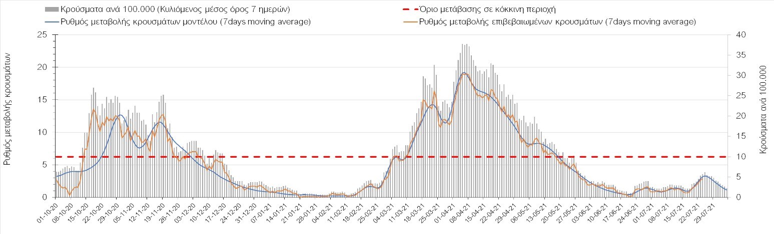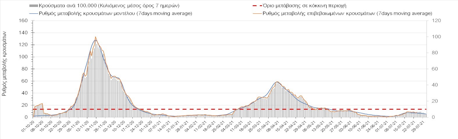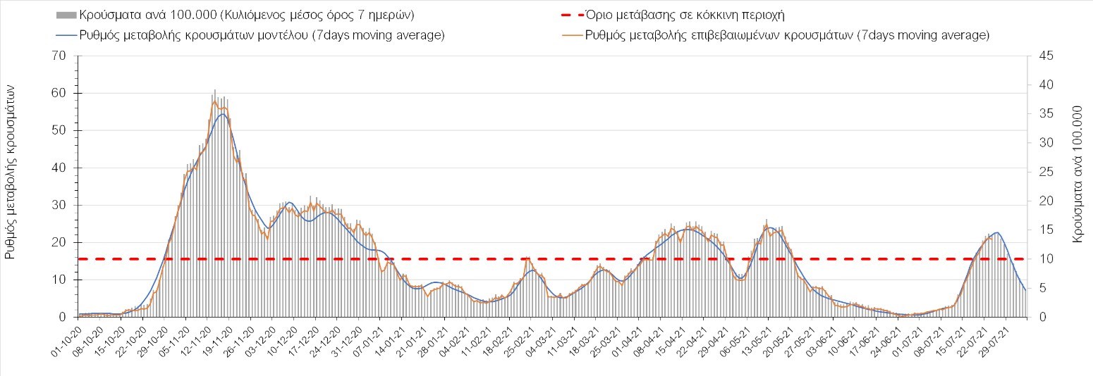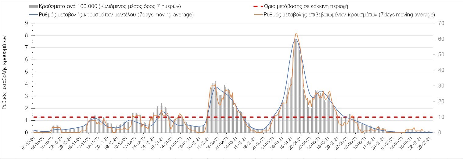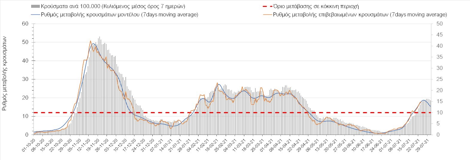 Σχήμα 58. Συγκριτικά αποτελέσματα της επιδημιολογικής εικόνας του σημερινού Σαββάτου (24/07/2021) σε σχέση με την προηγούμενη (27/07/2021) Όσον αφορά επιμέρους περιοχές, αρκετές πλέον βρίσκονται πάνω από το όριο χαρακτηρισμού ως κόκκινες, όπως η Αθήνα, η Θεσσαλονίκη η Λάρισα, η Μαγνησία, η Καρδίτσα, τα Τρίκαλα, η Αχαΐα, η Αργολίδα, η Αρκαδία, η Ηλεία, η Κορινθία, η Μεσσηνία, η Εύβοια, η Βοιωτία, τη Φωκίδα, τα Ιωάννινα, η Θεσπρωτία, τα Γρεβενά, η Κοζάνη, η Φλώρινα, η Χαλκιδική, ο Έβρος, το Ηράκλειο, τα Χανιά, το Ρέθυμνο, το Λασίθι, η Κέρκυρα, η Λέσβος, η Πάρος, η Ζάκυνθος, η Μύκονος, η Σαντορίνη και η Ρόδος, ενώ παρατηρούνται έντονα ανοδικές τάσεις στην Άρτα, στην Καβάλα, στη Πιερία, στη Ξάνθη και στη Χίο. Ιδιαίτερα στην Αθήνα (παρά την πτωτική πορεία), προβληματίζει ο βαθμός που αυτή σχετίζεται με την εξάπλωση μεταλλαγμένων και ταχύτερα μεταδιδόμενων στελεχών (κυρίως το Β.1.1.318 και το Β.1.167). Χαρακτηριστικό παράδειγμα της αυξημένης μεταδοτικότητας του στελέχους Δ (Β.1.167) αποτελεί η Κρήτη. Συνολικά η Κρήτη είναι η περιοχή με τη χειρότερη επιδημιολογική εικόνα και η ταχύτητα μετάδοσης (και το αντίστοιχο ύψος του 4ου κύματος που έχει διαμορφωθεί) είναι ενδεικτική της αυξημένης μεταδοτικότητας του στελέχους Δ. Επίσης, καταδεικνύει τον αρνητικό ρόλο που παίζουν οι διαπεριφερειακές μετακινήσεις στη φάση ανάπτυξης της πανδημίας, καθώς η αρχική αύξηση κρουσμάτων στο Ρέθυμνο πρώτα και στο Ηράκλειο έπειτα, ακολουθήθηκε από αυξητική πορεία της διασποράς στα Χανιά και στο Λασίθι. Στην πράξη, η Κρήτη είναι μια περιοχή οδικά απομονωμένη από την υπόλοιπη Ελλάδα, στην οποία, οι διαπεριφερειακές μετακινήσεις επέτρεψαν τη γρήγορη διασπορά του στελέχους Δ. Παρόμοια φαινόμενα διαπεριφερειακής μετάδοσης παρατηρούνται στη Θεσσαλία, αλλά σε πιο ήπια έκταση, όπου η έντονα αυξητική τάση στη Μαγνησία, μεταφέρθηκε σε κάποιο βαθμό και στη Λάρισα, ενώ ακολουθεί και η Καρδίτσα. Αντίστοιχη είναι η διάχυση της διασποράς στην Ήπειρο και πιο συγκεκριμένα από τα Ιωάννινα προς τα εγγύς τουριστικά θέρετρα (Πρέβεζα και Θεσπρωτία). Συνεπώς, ακόμα και για περιοχές που για την ώρα είναι κάτω από το όριο (ή πολύ κοντά στο όριο), οι ανοδικές τάσεις που παρατηρούνται χρήζουν αυξημένης επιδημιολογικής επιτήρησης με εντατικοποίηση του γονιδιωματικού ελέγχου ώστε να ληφθούν εγκαίρως μέτρα περιορισμού της διασποράς του ιού.Επίσης, σύμφωνα με τα πιο πρόσφατα στοιχεία που έγιναν διαθέσιμα, ανησυχία πλέον δημιουργεί η αύξηση του ποσοστού διασποράς του μεταλλαγμένου στελέχους Β.1.617.2 (μετάλλαξη Δέλτα) σε συγκεκριμένες περιοχές για το 15νθήμερο από 04/07/2021 έως 18/07/2021, όπου οι αντίστοιχες ποσοστώσεις είναι 25.13% για την Αττική, 6.67% για τη Δυτική Ελλάδα, 33.33% για τις Ιόνιες Νήσους, 24.32% για την Πελοπόννησο, 79.59% για την Κρήτη και 50% για την Ήπειρο. Με δεδομένα τα υπάρχοντα ανοίγματα, την παρουσία των μεταλλάξεων και την έλευση των τουριστικών ροών είναι ακόμα πιο σημαντική η τήρηση των μέτρων, με κυριότερη την ορθή και μαζική εφαρμογή των self-test, με ταυτόχρονη αύξηση της ιχνηλασίας των επαφών των ανιχνευθέντων ως θετικοί και καραντίνα 14 ημερών για τους συμπολίτες μας που θα επιβεβαιωθεί ότι είναι θετικοί στην μόλυνση με SARS-CoV-2 ακόμη και αν είναι ασυμπτωματικοί. Η σημασία και η αποτελεσματικότητα των self-test και του εμβολιασμού έχει ήδη φανεί τις προηγούμενες 12 εβδομάδες. Με δεδομένη την εμφάνιση της μετάλλαξης Β.1.617 ο πλήρ