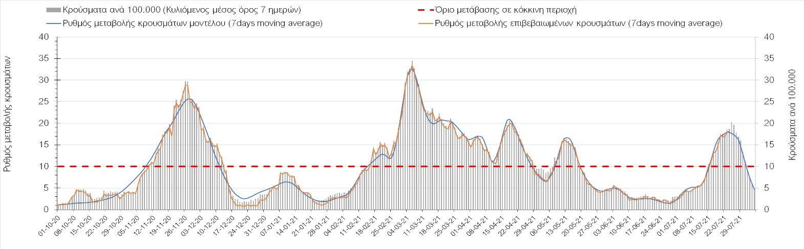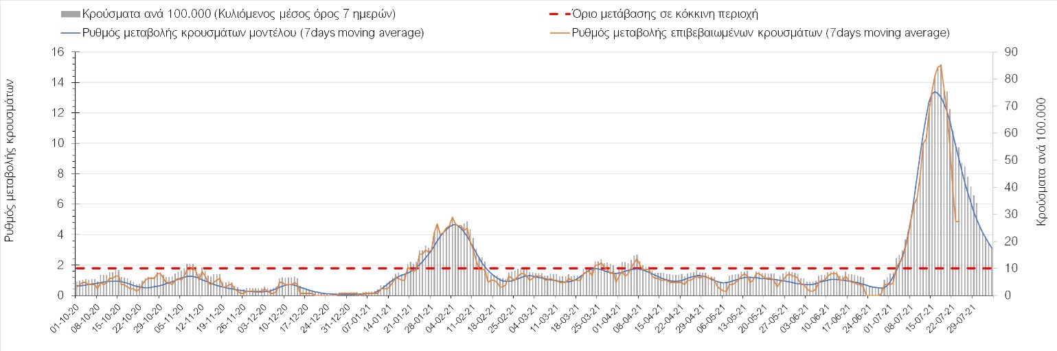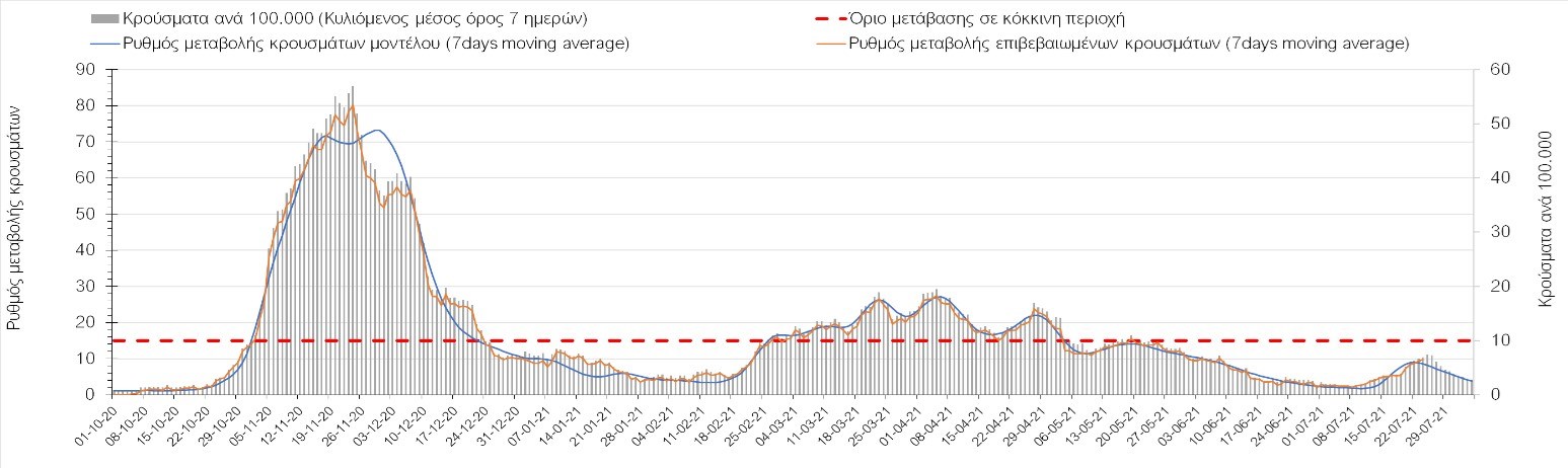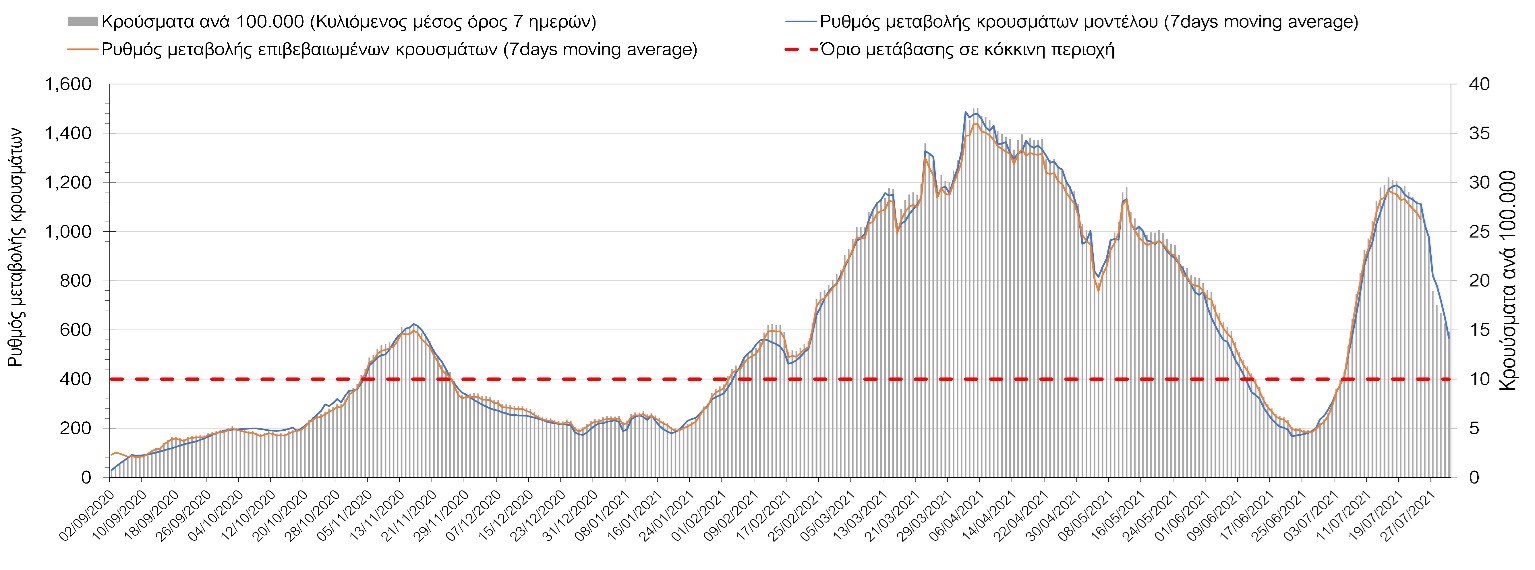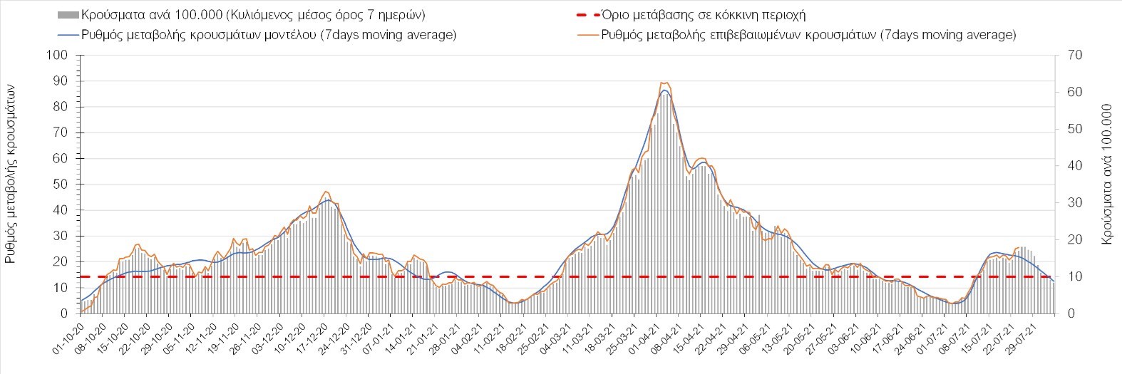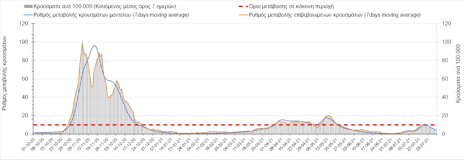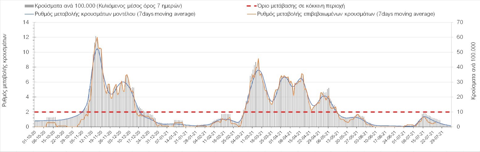 Σχήμα 58. Συγκριτικά αποτελέσματα της επιδημιολογικής εικόνας του σημερινού Σαββάτου (24/07/2021) σε σχέση με την προηγούμενη (27/07/2021) Όσον αφορά επιμέρους περιοχές, αρκετές πλέον βρίσκονται πάνω από το όριο χαρακτηρισμού ως κόκκινες, όπως η Αθήνα, η Θεσσαλονίκη η Λάρισα, η Μαγνησία, η Καρδίτσα, τα Τρίκαλα, η Αχαΐα, η Αργολίδα, η Αρκαδία, η Ηλεία, η Κορινθία, η Μεσσηνία, η Εύβοια, η Βοιωτία, τη Φωκίδα, τα Ιωάννινα, η Θεσπρωτία, τα Γρεβενά, η Κοζάνη, η Φλώρινα, η Χαλκιδική, ο Έβρος, το Ηράκλειο, τα Χανιά, το Ρέθυμνο, το Λασίθι, η Κέρκυρα, η Λέσβος, η Πάρος, η Ζάκυνθος, η Μύκονος, η Σαντορίνη και η Ρόδος, ενώ παρατηρούνται έντονα ανοδικές τάσεις στην Άρτα, στην Καβάλα, στη Πιερία, στη Ξάνθη και στη Χίο. Ιδιαίτερα στην Αθήνα (παρά την πτωτική πορεία), προβληματίζει ο βαθμός που αυτή σχετίζεται με την εξάπλωση μεταλλαγμένων και ταχύτερα μεταδιδόμενων στελεχών (κυρίως το Β.1.1.318 και το Β.1.167). Χαρακτηριστικό παράδειγμα της αυξημένης μεταδοτικότητας του στελέχους Δ (Β.1.167) αποτελεί η Κρήτη. Συνολικά η Κρήτη είναι η περιοχή με τη χειρότερη επιδημιολογική εικόνα και η ταχύτητα μετάδοσης (και το αντίστοιχο ύψος του 4ου κύματος που έχει διαμορφωθεί) είναι ενδεικτική της αυξημένης μεταδοτικότητας του στελέχους Δ. Επίσης, καταδεικνύει τον αρνητικό ρόλο που παίζουν οι διαπεριφερειακές μετακινήσεις στη φάση ανάπτυξης της πανδημίας, καθώς η αρχική αύξηση κρουσμάτων στο Ρέθυμνο πρώτα και στο Ηράκλειο έπειτα, ακολουθήθηκε από αυξητική πορεία της διασποράς στα Χανιά και στο Λασίθι. Στην πράξη, η Κρήτη είναι μια περιοχή οδικά απομονωμένη από την υπόλοιπη Ελλάδα, στην οποία, οι διαπεριφερειακές μετακινήσεις επέτρεψαν τη γρήγορη διασπορά του στελέχους Δ. Παρόμοια φαινόμενα διαπεριφερειακής μετάδοσης παρατηρούνται στη Θεσσαλία, αλλά σε πιο ήπια έκταση, όπου η έντονα αυξητική τάση στη Μαγνησία, μεταφέρθηκε σε κάποιο βαθμό και στη Λάρισα, ενώ ακολουθεί και η Καρδίτσα. Αντίστοιχη είναι η διάχυση της διασποράς στην Ήπειρο και πιο συγκεκριμένα από τα Ιωάννινα προς τα εγγύς τουριστικά θέρετρα (Πρέβεζα και Θεσπρωτία). Συνεπώς, ακόμα και για περιοχές που για την ώρα είναι κάτω από το όριο (ή πολύ κοντά στο όριο), οι ανοδικές τάσεις που παρατηρούνται χρήζουν αυξημένης επιδημιολογικής επιτήρησης με εντατικοποίηση του γονιδιωματικού ελέγχου ώστε να ληφθούν εγκαίρως μέτρα περιορισμού της διασποράς του ιού.Επίσης, σύμφωνα με τα πιο πρόσφατα στοιχεία που έγιναν διαθέσιμα, ανησυχία πλέον δημιουργεί η αύξηση του ποσοστού διασποράς του μεταλλαγμένου στελέχους Β.1.617.2 (μετάλλαξη Δέλτα) σε συγκεκριμένες περιοχές για το 15νθήμερο από 04/07/2021 έως 18/07/2021, όπου οι αντίστοιχες ποσοστώσεις είναι 25.13% για την Αττική, 6.67% για τη Δυτική Ελλάδα, 33.33% για τις Ιόνιες Νήσους, 24.32% για την Πελοπόννησο, 79.59% για την Κρήτη και 50% για την Ήπειρο. Με δεδομένα τα υπάρχοντα ανοίγματα, την παρουσία των μεταλλάξεων και την έλευση των τουριστικών ροών είναι ακόμα πιο σημαντική η τήρηση των μέτρων, με κυριότερη την ορθή και μαζική εφαρμογή των self-test, με ταυτόχρονη αύξηση της ιχνηλασίας των επαφών των ανιχνευθέντων ως θετικοί και καραντίνα 14 ημερών για τους συμπολίτες μας που θα επιβεβαιωθεί ότι είναι θετικοί στην μόλυνση με SARS-CoV-2 ακόμη και αν είναι ασυμπτωματικοί. Η σημασία και η αποτελεσματικότητα των self-test και του εμβολιασμού έχει ήδη φανεί τις προηγούμενες 12 εβδομάδες. Με δεδομένη την εμφάνιση της μετάλλαξης Β.1.617 ο πλήρ