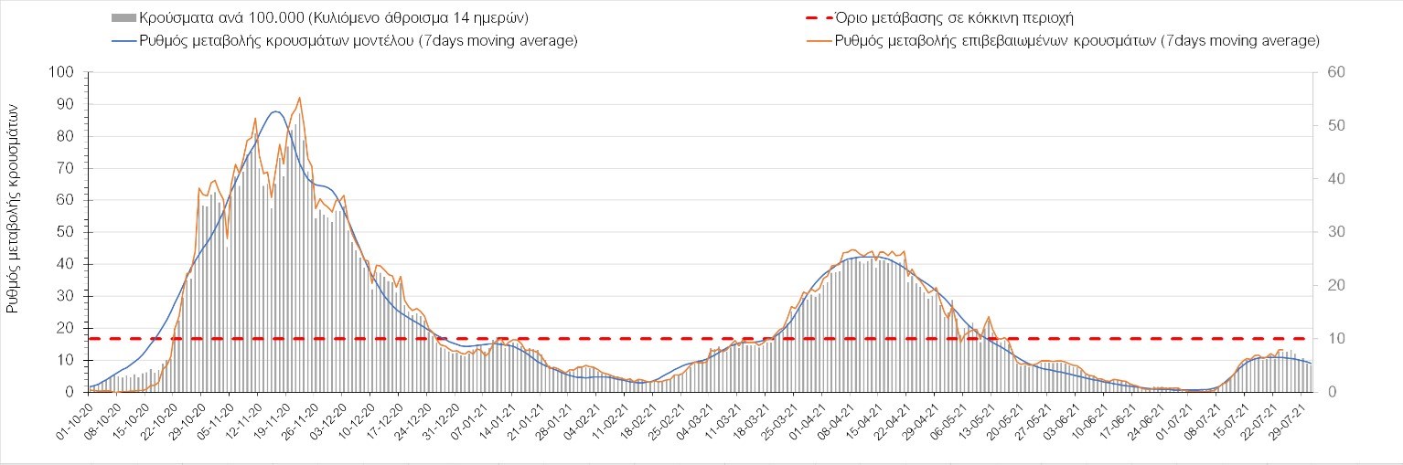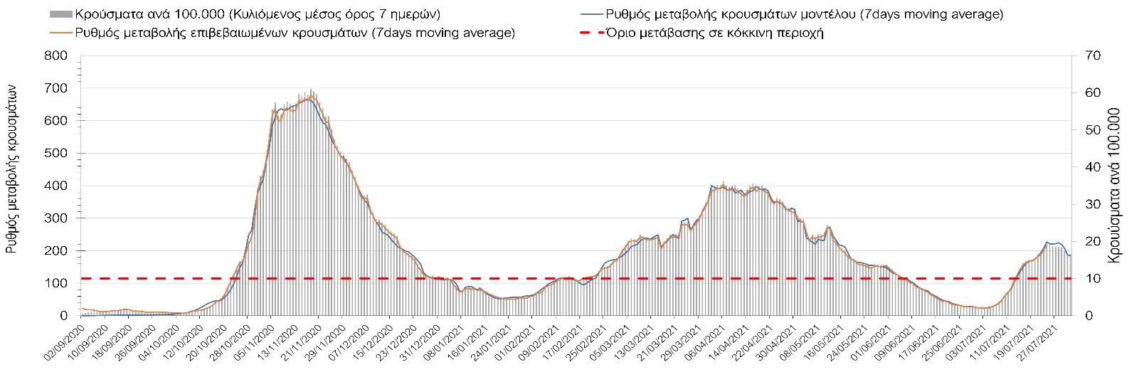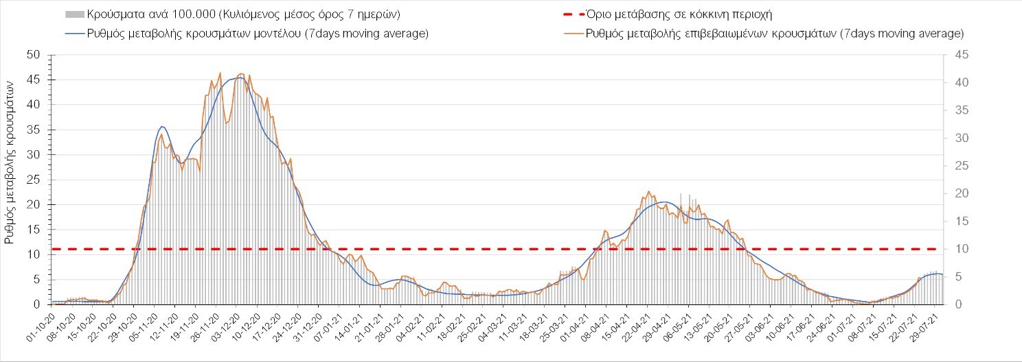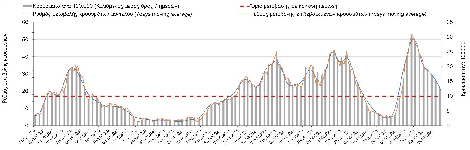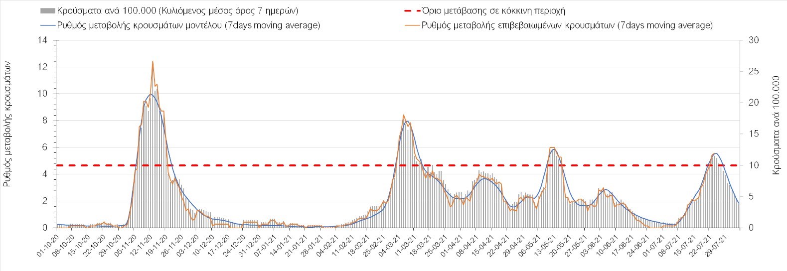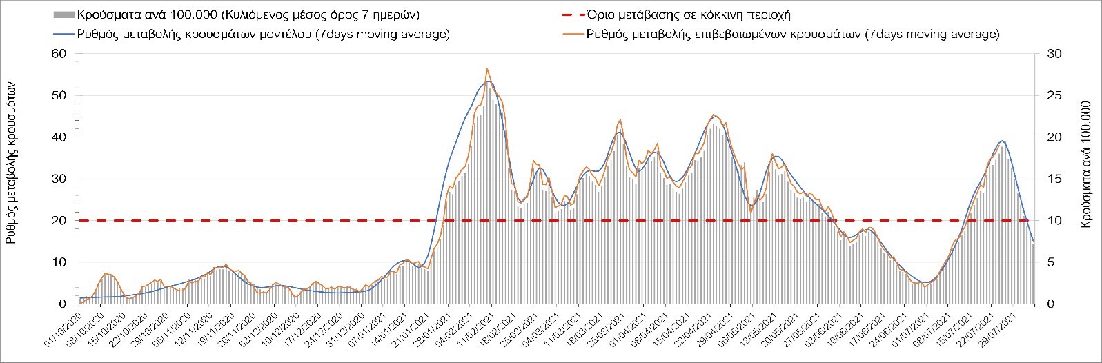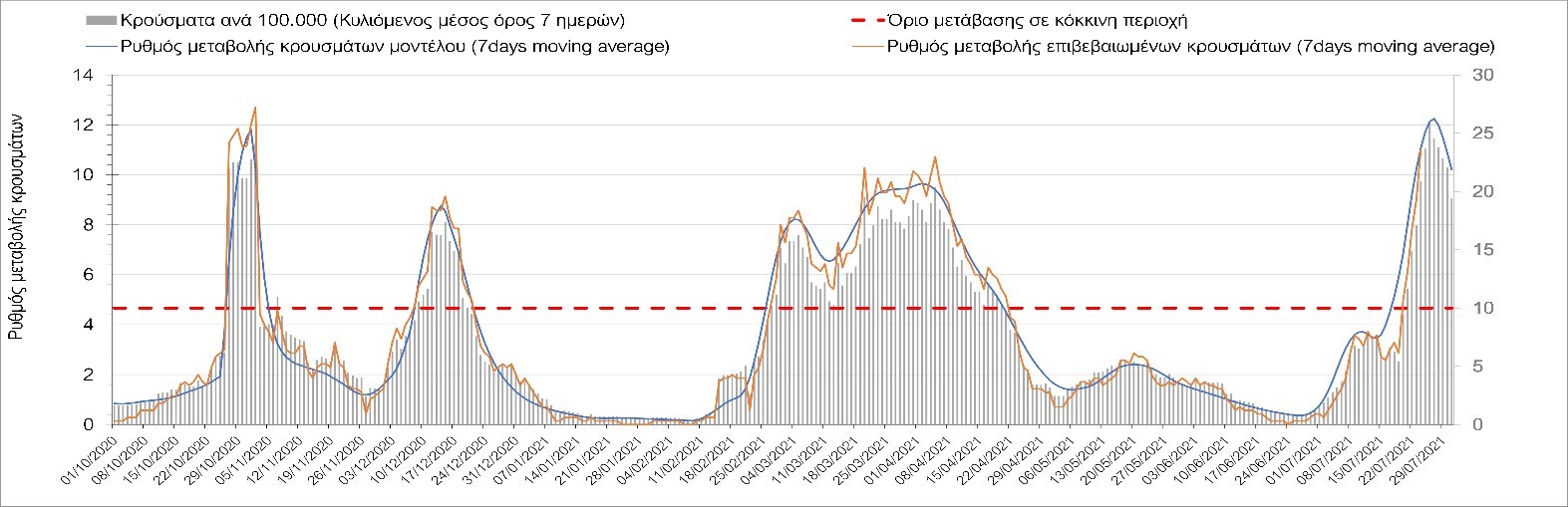 Σχήμα 58. Συγκριτικά αποτελέσματα της επιδημιολογικής εικόνας του σημερινού Σαββάτου (24/07/2021) σε σχέση με την προηγούμενη (27/07/2021) Όσον αφορά επιμέρους περιοχές, αρκετές πλέον βρίσκονται πάνω από το όριο χαρακτηρισμού ως κόκκινες, όπως η Αθήνα, η Θεσσαλονίκη η Λάρισα, η Μαγνησία, η Καρδίτσα, τα Τρίκαλα, η Αχαΐα, η Αργολίδα, η Αρκαδία, η Ηλεία, η Κορινθία, η Μεσσηνία, η Εύβοια, η Βοιωτία, τη Φωκίδα, τα Ιωάννινα, η Θεσπρωτία, τα Γρεβενά, η Κοζάνη, η Φλώρινα, η Χαλκιδική, ο Έβρος, το Ηράκλειο, τα Χανιά, το Ρέθυμνο, το Λασίθι, η Κέρκυρα, η Λέσβος, η Πάρος, η Ζάκυνθος, η Μύκονος, η Σαντορίνη και η Ρόδος, ενώ παρατηρούνται έντονα ανοδικές τάσεις στην Άρτα, στην Καβάλα, στη Πιερία, στη Ξάνθη και στη Χίο. Ιδιαίτερα στην Αθήνα (παρά την πτωτική πορεία), προβληματίζει ο βαθμός που αυτή σχετίζεται με την εξάπλωση μεταλλαγμένων και ταχύτερα μεταδιδόμενων στελεχών (κυρίως το Β.1.1.318 και το Β.1.167). Χαρακτηριστικό παράδειγμα της αυξημένης μεταδοτικότητας του στελέχους Δ (Β.1.167) αποτελεί η Κρήτη. Συνολικά η Κρήτη είναι η περιοχή με τη χειρότερη επιδημιολογική εικόνα και η ταχύτητα μετάδοσης (και το αντίστοιχο ύψος του 4ου κύματος που έχει διαμορφωθεί) είναι ενδεικτική της αυξημένης μεταδοτικότητας του στελέχους Δ. Επίσης, καταδεικνύει τον αρνητικό ρόλο που παίζουν οι διαπεριφερειακές μετακινήσεις στη φάση ανάπτυξης της πανδημίας, καθώς η αρχική αύξηση κρουσμάτων στο Ρέθυμνο πρώτα και στο Ηράκλειο έπειτα, ακολουθήθηκε από αυξητική πορεία της διασποράς στα Χανιά και στο Λασίθι. Στην πράξη, η Κρήτη είναι μια περιοχή οδικά απομονωμένη από την υπόλοιπη Ελλάδα, στην οποία, οι διαπεριφερειακές μετακινήσεις επέτρεψαν τη γρήγορη διασπορά του στελέχους Δ. Παρόμοια φαινόμενα διαπεριφερειακής μετάδοσης παρατηρούνται στη Θεσσαλία, αλλά σε πιο ήπια έκταση, όπου η έντονα αυξητική τάση στη Μαγνησία, μεταφέρθηκε σε κάποιο βαθμό και στη Λάρισα, ενώ ακολουθεί και η Καρδίτσα. Αντίστοιχη είναι η διάχυση της διασποράς στην Ήπειρο και πιο συγκεκριμένα από τα Ιωάννινα προς τα εγγύς τουριστικά θέρετρα (Πρέβεζα και Θεσπρωτία). Συνεπώς, ακόμα και για περιοχές που για την ώρα είναι κάτω από το όριο (ή πολύ κοντά στο όριο), οι ανοδικές τάσεις που παρατηρούνται χρήζουν αυξημένης επιδημιολογικής επιτήρησης με εντατικοποίηση του γονιδιωματικού ελέγχου ώστε να ληφθούν εγκαίρως μέτρα περιορισμού της διασποράς του ιού.Επίσης, σύμφωνα με τα πιο πρόσφατα στοιχεία που έγιναν διαθέσιμα, ανησυχία πλέον δημιουργεί η αύξηση του ποσοστού διασποράς του μεταλλαγμένου στελέχους Β.1.617.2 (μετάλλαξη Δέλτα) σε συγκεκριμένες περιοχές για το 15νθήμερο από 04/07/2021 έως 18/07/2021, όπου οι αντίστοιχες ποσοστώσεις είναι 25.13% για την Αττική, 6.67% για τη Δυτική Ελλάδα, 33.33% για τις Ιόνιες Νήσους, 24.32% για την Πελοπόννησο, 79.59% για την Κρήτη και 50% για την Ήπειρο. Με δεδομένα τα υπάρχοντα ανοίγματα, την παρουσία των μεταλλάξεων και την έλευση των τουριστικών ροών είναι ακόμα πιο σημαντική η τήρηση των μέτρων, με κυριότερη την ορθή και μαζική εφαρμογή των self-test, με ταυτόχρονη αύξηση της ιχνηλασίας των επαφών των ανιχνευθέντων ως θετικοί και καραντίνα 14 ημερών για τους συμπολίτες μας που θα επιβεβαιωθεί ότι είναι θετικοί στην μόλυνση με SARS-CoV-2 ακόμη και αν είναι ασυμπτωματικοί. Η σημασία και η αποτελεσματικότητα των self-test και του εμβολιασμού έχει ήδη φανεί τις προηγούμενες 12 εβδομάδες. Με δεδομένη την εμφάνιση της μετάλλαξης Β.1.617 ο πλήρ