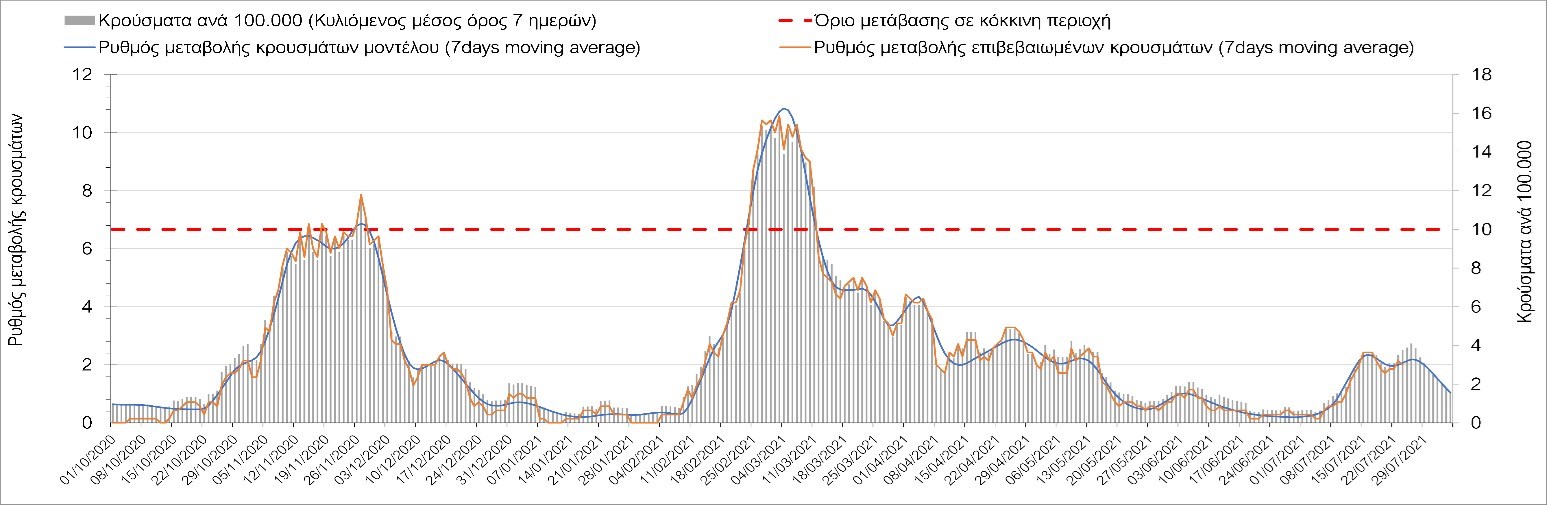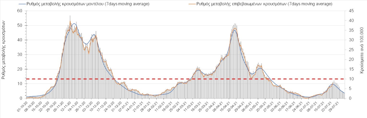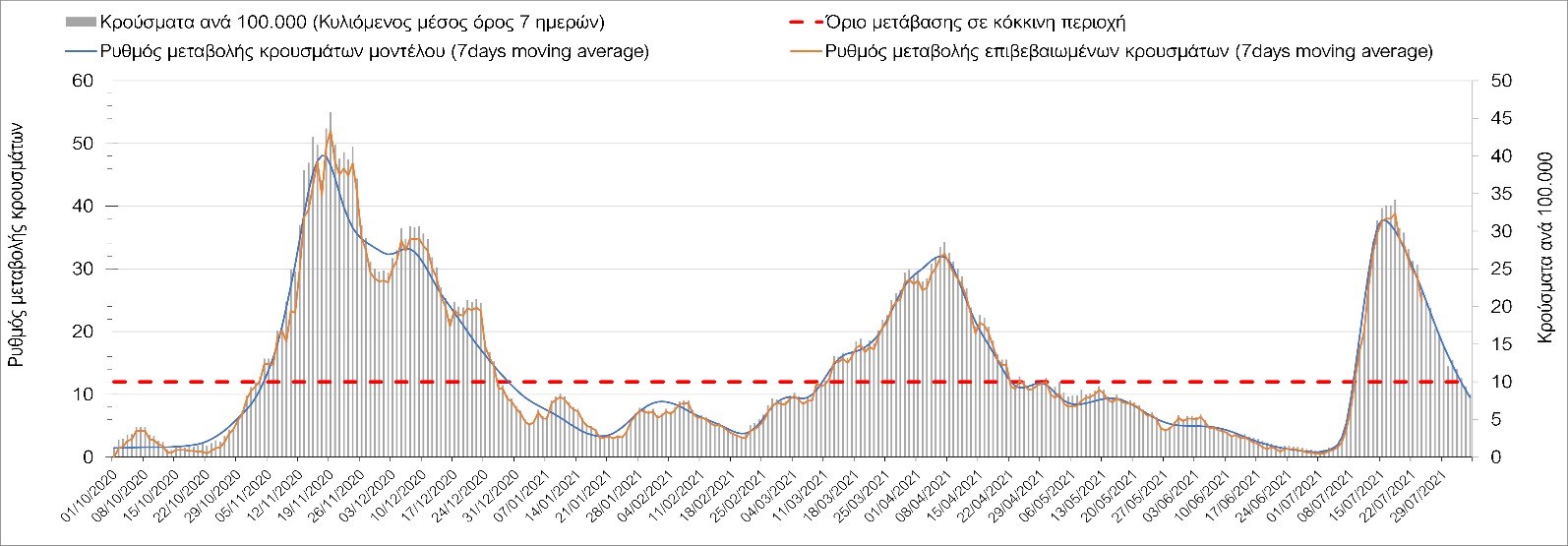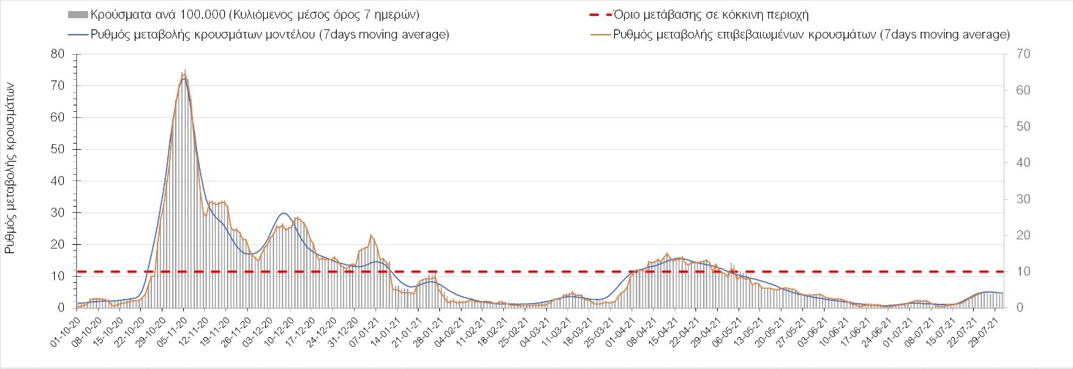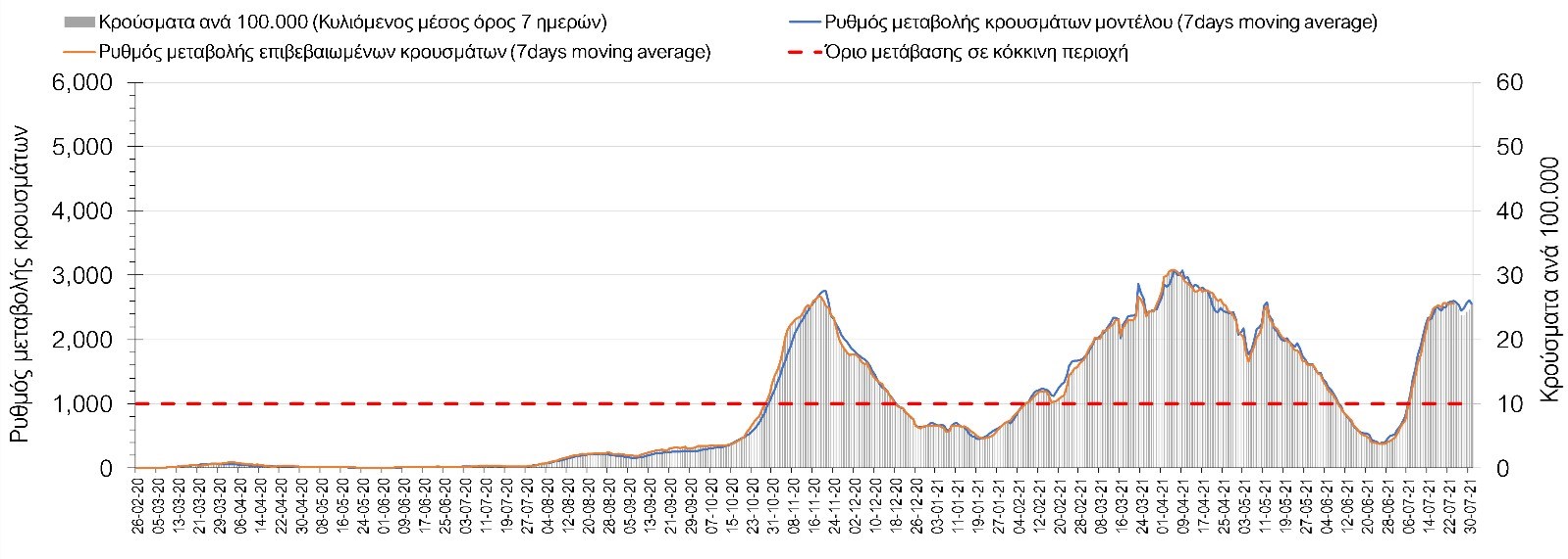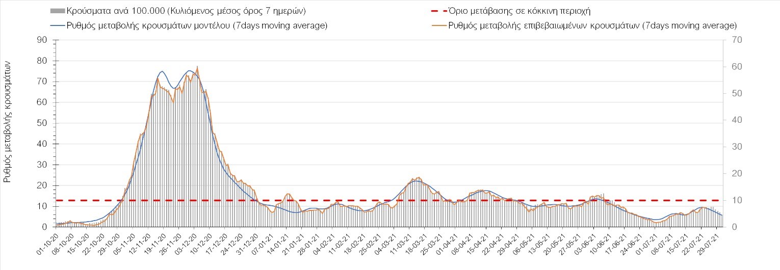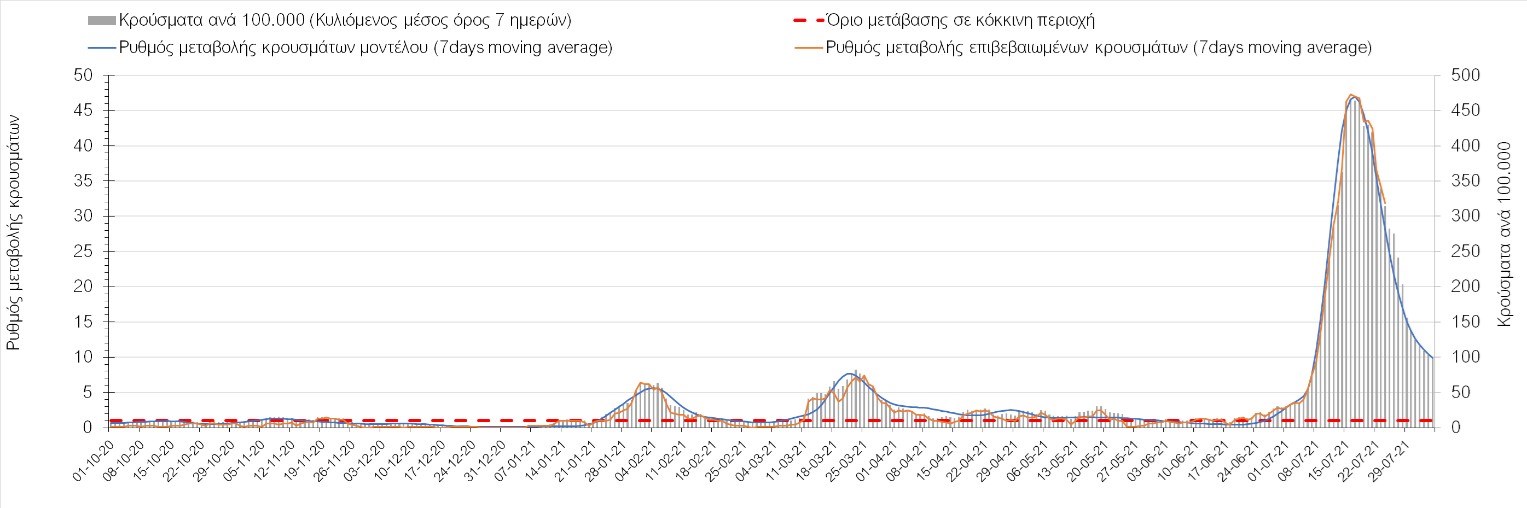Σχήμα 58. Συγκριτικά αποτελέσματα της επιδημιολογικής εικόνας του σημερινού Σαββάτου (24/07/2021) σε σχέση με την προηγούμενη (27/07/2021) Όσον αφορά επιμέρους περιοχές, αρκετές πλέον βρίσκονται πάνω από το όριο χαρακτηρισμού ως κόκκινες, όπως η Αθήνα, η Θεσσαλονίκη η Λάρισα, η Μαγνησία, η Καρδίτσα, τα Τρίκαλα, η Αχαΐα, η Αργολίδα, η Αρκαδία, η Ηλεία, η Κορινθία, η Μεσσηνία, η Εύβοια, η Βοιωτία, τη Φωκίδα, τα Ιωάννινα, η Θεσπρωτία, τα Γρεβενά, η Κοζάνη, η Φλώρινα, η Χαλκιδική, ο Έβρος, το Ηράκλειο, τα Χανιά, το Ρέθυμνο, το Λασίθι, η Κέρκυρα, η Λέσβος, η Πάρος, η Ζάκυνθος, η Μύκονος, η Σαντορίνη και η Ρόδος, ενώ παρατηρούνται έντονα ανοδικές τάσεις στην Άρτα, στην Καβάλα, στη Πιερία, στη Ξάνθη και στη Χίο. Ιδιαίτερα στην Αθήνα (παρά την πτωτική πορεία), προβληματίζει ο βαθμός που αυτή σχετίζεται με την εξάπλωση μεταλλαγμένων και ταχύτερα μεταδιδόμενων στελεχών (κυρίως το Β.1.1.318 και το Β.1.167). Χαρακτηριστικό παράδειγμα της αυξημένης μεταδοτικότητας του στελέχους Δ (Β.1.167) αποτελεί η Κρήτη. Συνολικά η Κρήτη είναι η περιοχή με τη χειρότερη επιδημιολογική εικόνα και η ταχύτητα μετάδοσης (και το αντίστοιχο ύψος του 4ου κύματος που έχει διαμορφωθεί) είναι ενδεικτική της αυξημένης μεταδοτικότητας του στελέχους Δ. Επίσης, καταδεικνύει τον αρνητικό ρόλο που παίζουν οι διαπεριφερειακές μετακινήσεις στη φάση ανάπτυξης της πανδημίας, καθώς η αρχική αύξηση κρουσμάτων στο Ρέθυμνο πρώτα και στο Ηράκλειο έπειτα, ακολουθήθηκε από αυξητική πορεία της διασποράς στα Χανιά και στο Λασίθι. Στην πράξη, η Κρήτη είναι μια περιοχή οδικά απομονωμένη από την υπόλοιπη Ελλάδα, στην οποία, οι διαπεριφερειακές μετακινήσεις επέτρεψαν τη γρήγορη διασπορά του στελέχους Δ. Παρόμοια φαινόμενα διαπεριφερειακής μετάδοσης παρατηρούνται στη Θεσσαλία, αλλά σε πιο ήπια έκταση, όπου η έντονα αυξητική τάση στη Μαγνησία, μεταφέρθηκε σε κάποιο βαθμό και στη Λάρισα, ενώ ακολουθεί και η Καρδίτσα. Αντίστοιχη είναι η διάχυση της διασποράς στην Ήπειρο και πιο συγκεκριμένα από τα Ιωάννινα προς τα εγγύς τουριστικά θέρετρα (Πρέβεζα και Θεσπρωτία). Συνεπώς, ακόμα και για περιοχές που για την ώρα είναι κάτω από το όριο (ή πολύ κοντά στο όριο), οι ανοδικές τάσεις που παρατηρούνται χρήζουν αυξημένης επιδημιολογικής επιτήρησης με εντατικοποίηση του γονιδιωματικού ελέγχου ώστε να ληφθούν εγκαίρως μέτρα περιορισμού της διασποράς του ιού.Επίσης, σύμφωνα με τα πιο πρόσφατα στοιχεία που έγιναν διαθέσιμα, ανησυχία πλέον δημιουργεί η αύξηση του ποσοστού διασποράς του μεταλλαγμένου στελέχους Β.1.617.2 (μετάλλαξη Δέλτα) σε συγκεκριμένες περιοχές για το 15νθήμερο από 04/07/2021 έως 18/07/2021, όπου οι αντίστοιχες ποσοστώσεις είναι 25.13% για την Αττική, 6.67% για τη Δυτική Ελλάδα, 33.33% για τις Ιόνιες Νήσους, 24.32% για την Πελοπόννησο, 79.59% για την Κρήτη και 50% για την Ήπειρο. Με δεδομένα τα υπάρχοντα ανοίγματα, την παρουσία των μεταλλάξεων και την έλευση των τουριστικών ροών είναι ακόμα πιο σημαντική η τήρηση των μέτρων, με κυριότερη την ορθή και μαζική εφαρμογή των self-test, με ταυτόχρονη αύξηση της ιχνηλασίας των επαφών των ανιχνευθέντων ως θετικοί και καραντίνα 14 ημερών για τους συμπολίτες μας που θα επιβεβαιωθεί ότι είναι θετικοί στην μόλυνση με SARS-CoV-2 ακόμη και αν είναι ασυμπτωματικοί. Η σημασία και η αποτελεσματικότητα των self-test και του εμβολιασμού έχει ήδη φανεί τις προηγούμενες 12 εβδομάδες. Με δεδομένη την εμφάνιση της μετάλλαξης Β.1.617 ο πλήρ