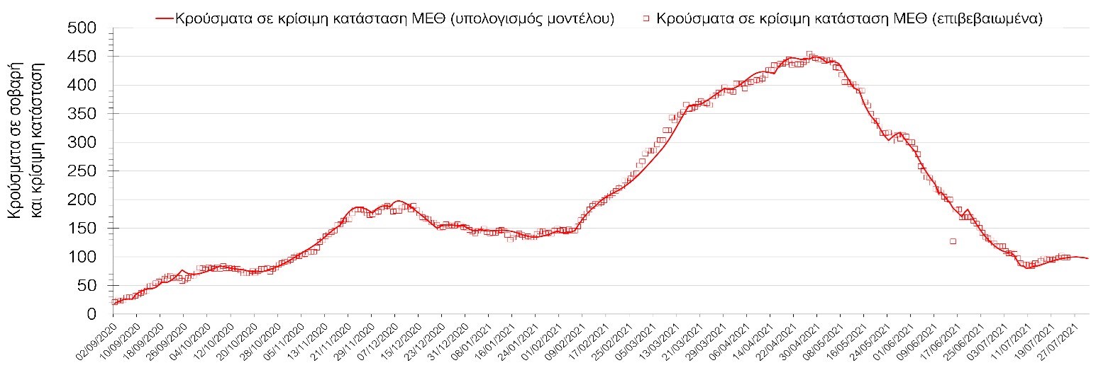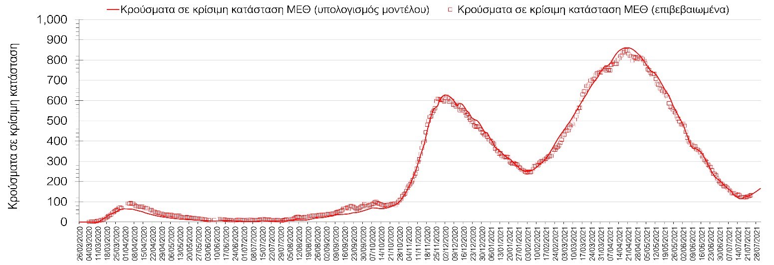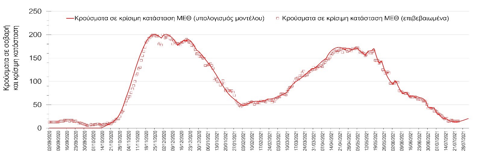 Σχήμα 1. Αριθμός κρουσμάτων σε κρίσιμη κατάσταση (ΜΕΘ) σύμφωνα με τα στοιχεία του ΕΟΔΥ και τις προβλέψεις της υπολογιστικής πλατφόρμας CORE.