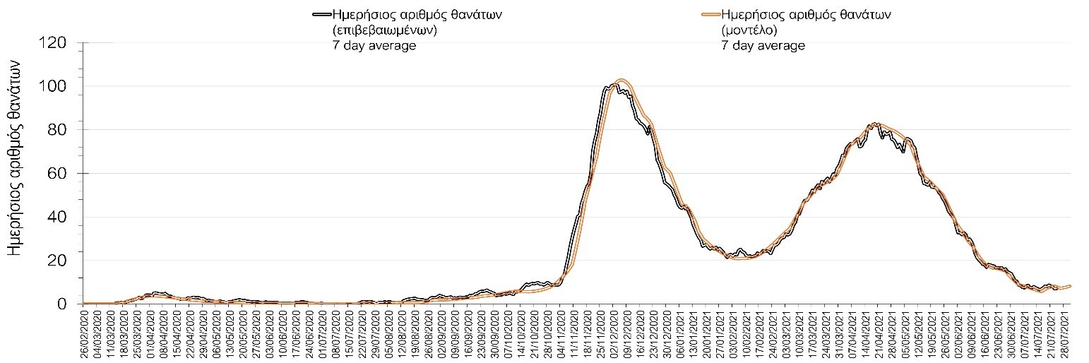 Σχήμα 3. Αριθμός θανάτων (κυλιόμενος μέσος όρος 7 ημερών) σύμφωνα με τα στοιχεία του ΕΟΔΥ και τις προβλέψεις της υπολογιστικής πλατφόρμας CORE.Η πορεία της μέσης εβδομαδιαίας τιμής των κρουσμάτων, καθώς και του κυλιόμενου μέσου όρου 7 ημερών του αριθμού των κρουσμάτων ανά 100.000 πληθυσμού, όπως έχουν καταγραφεί από τον ΕΟΔΥ και η αναμενόμενη πορεία τους όπως προδιαγράφεται από την υπολογιστική πλατφόρμα CORE για την Ελληνική επικράτεια μέχρι τις 31 Ιουλίου, αποτυπώνονται στο Σχήμα 4. Αυτή η προβλεπόμενη πορεία, που αφορά τα κρούσματα, τους νοσηλευόμενους σε απλές κλίνες, όσο και σε ΜΕΘ, καθώς επίσης και τους θανάτους, βασίζεται στις ακόλουθες παραδοχές: