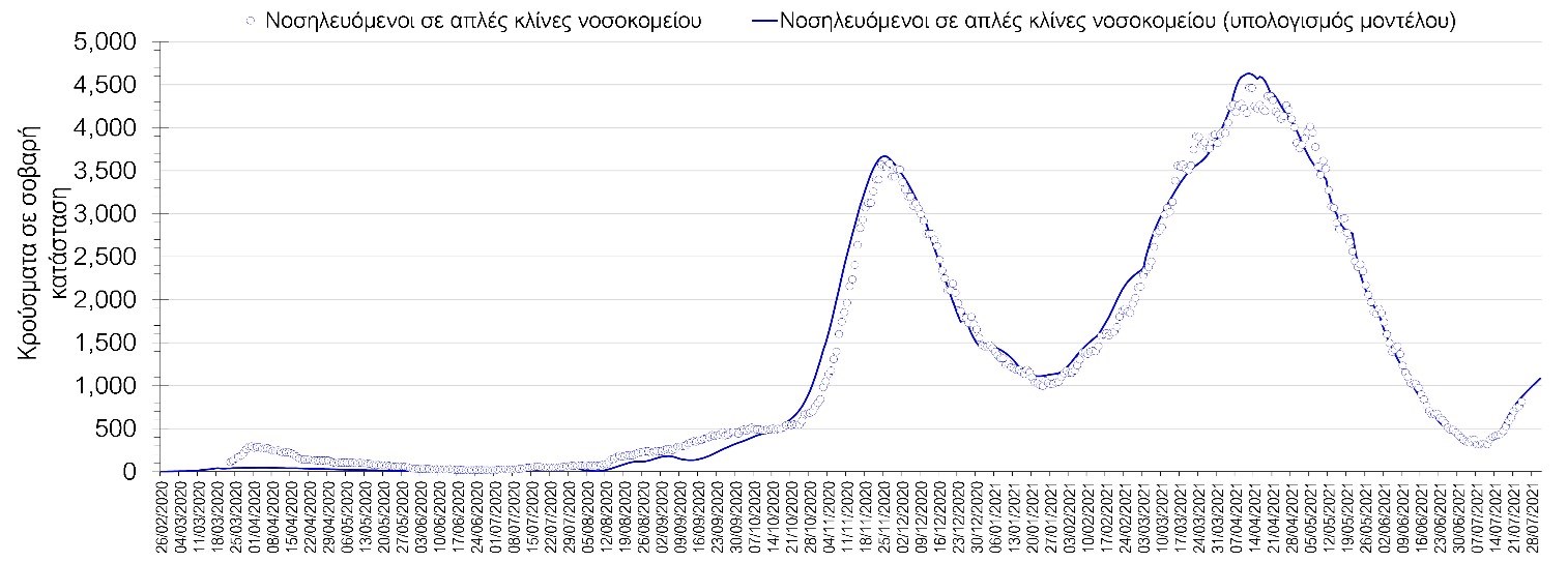 Σχήμα 2. Αριθμός κρουσμάτων σε σοβαρή κατάσταση (νοσηλευόμενοι σε απλές κλίνες) σύμφωνα με τα στοιχεία του ΕΟΔΥ και τις προβλέψεις της υπολογιστικής πλατφόρμας CORE.