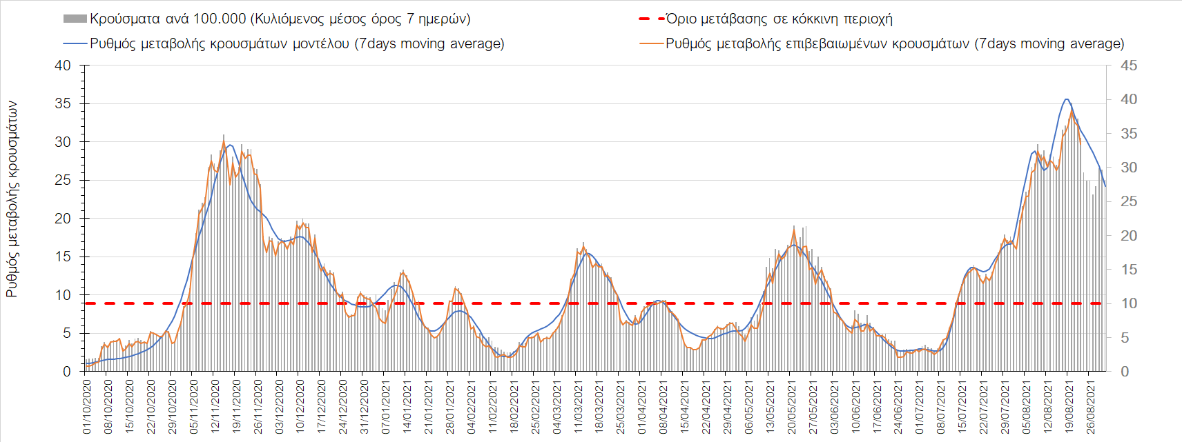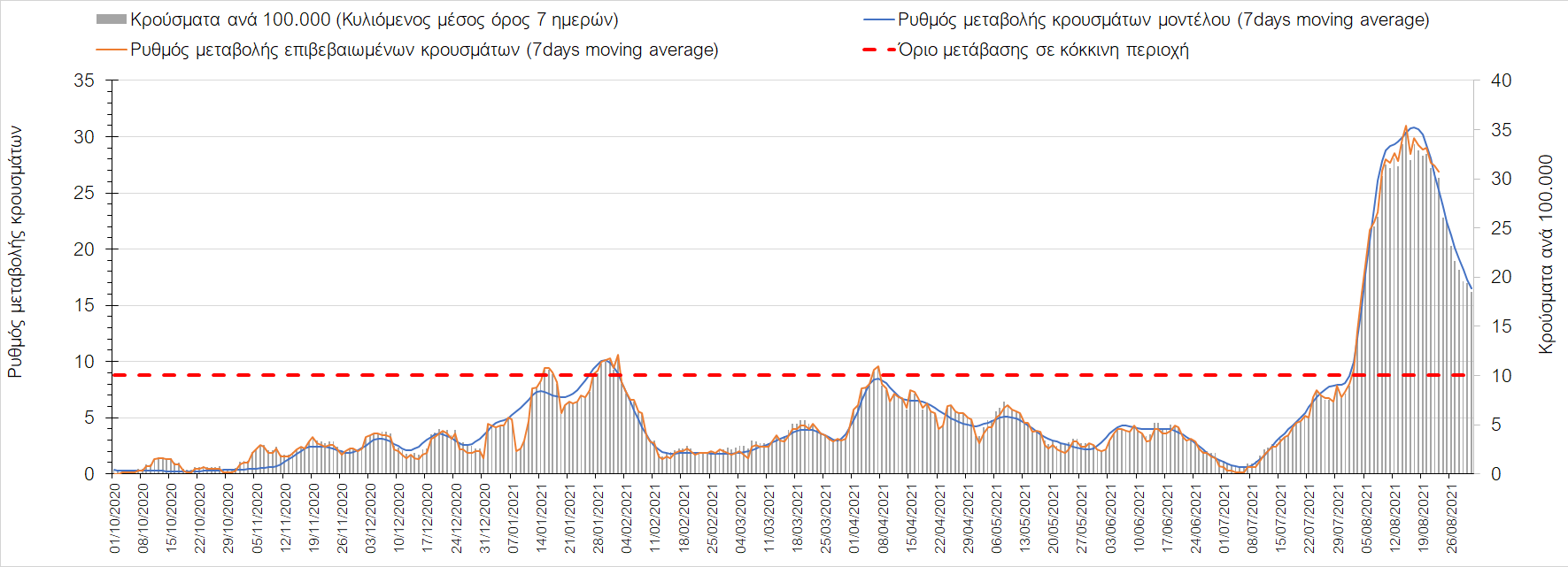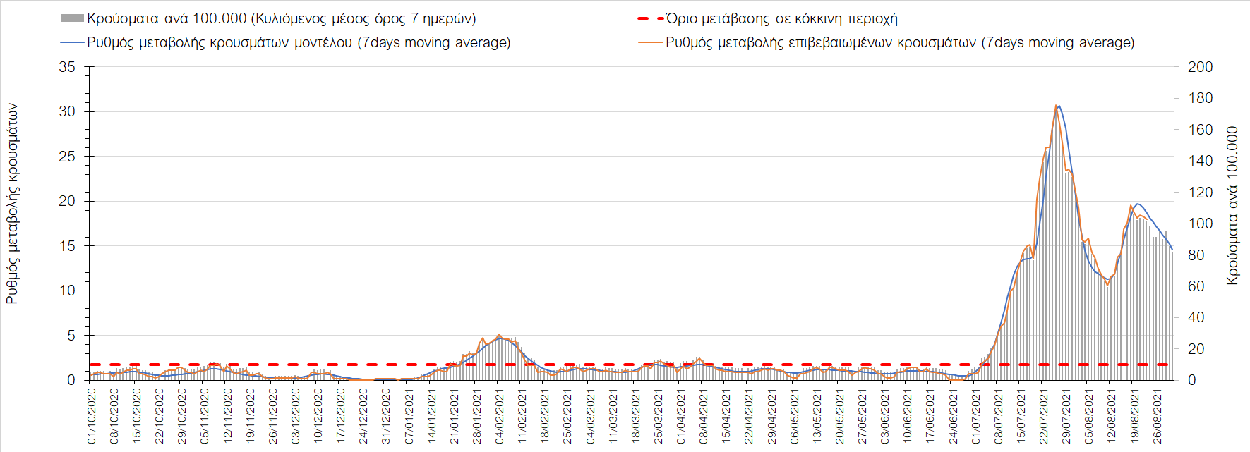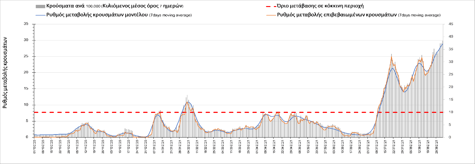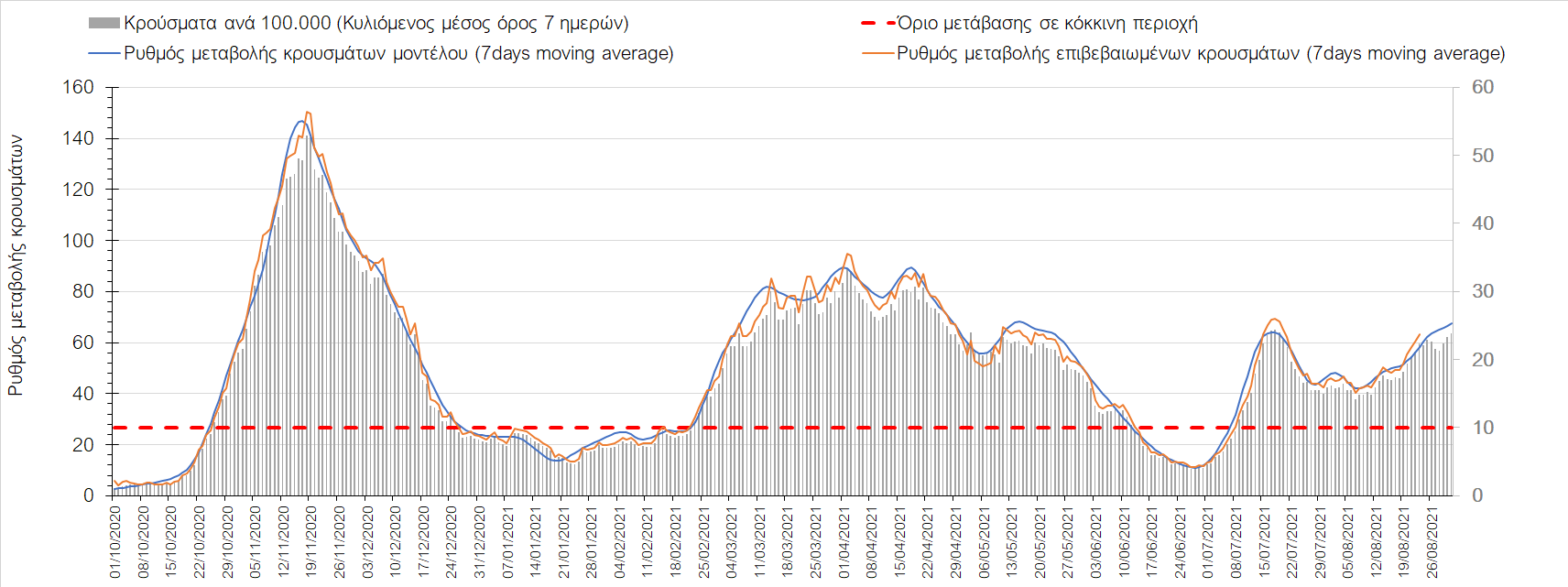 Από την αρχή του Ιουλίου παρατηρείται μια αύξηση του αριθμού των κρουσμάτων στην Αθήνα, η οποία δεν συνάδει ούτε με τη διαμόρφωση της μεταδοτικότητας από τη θερμοκρασία, αλλά ούτε και με τα υπάρχοντα μέτρα, και η οποία την έχει φέρει πέρα από το όριο της περιοχής ανησυχίας. Μια πιθανή εξήγηση είναι η αυξημένη διασπορά στην κοινότητα των μεταλλαγμένων στελεχών Β.1.1.318 και Β.1.167, οπότε και αναμένουμε τα δεδομένα των επομένων ημερών για να μπορέσουμε να διαμορφώσουμε μια πιο σαφή εικόνα.