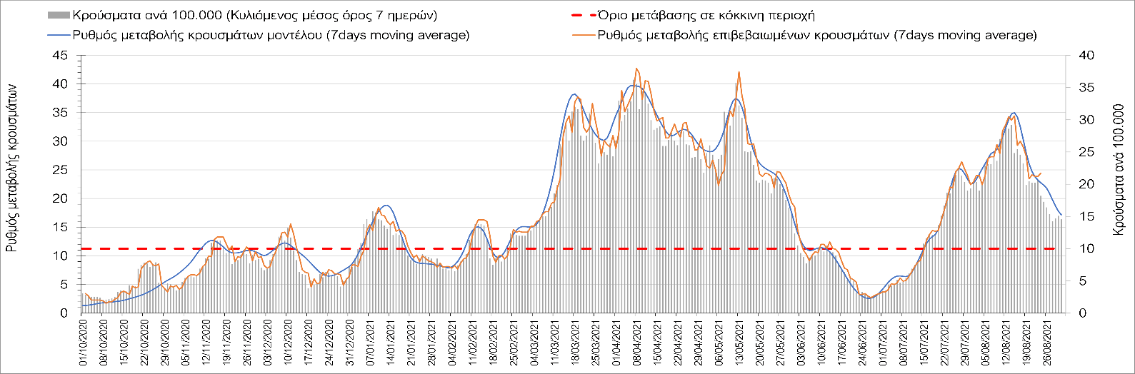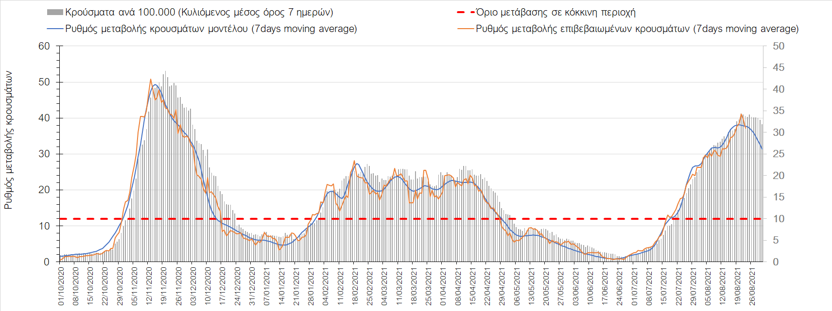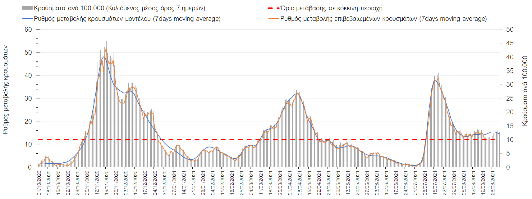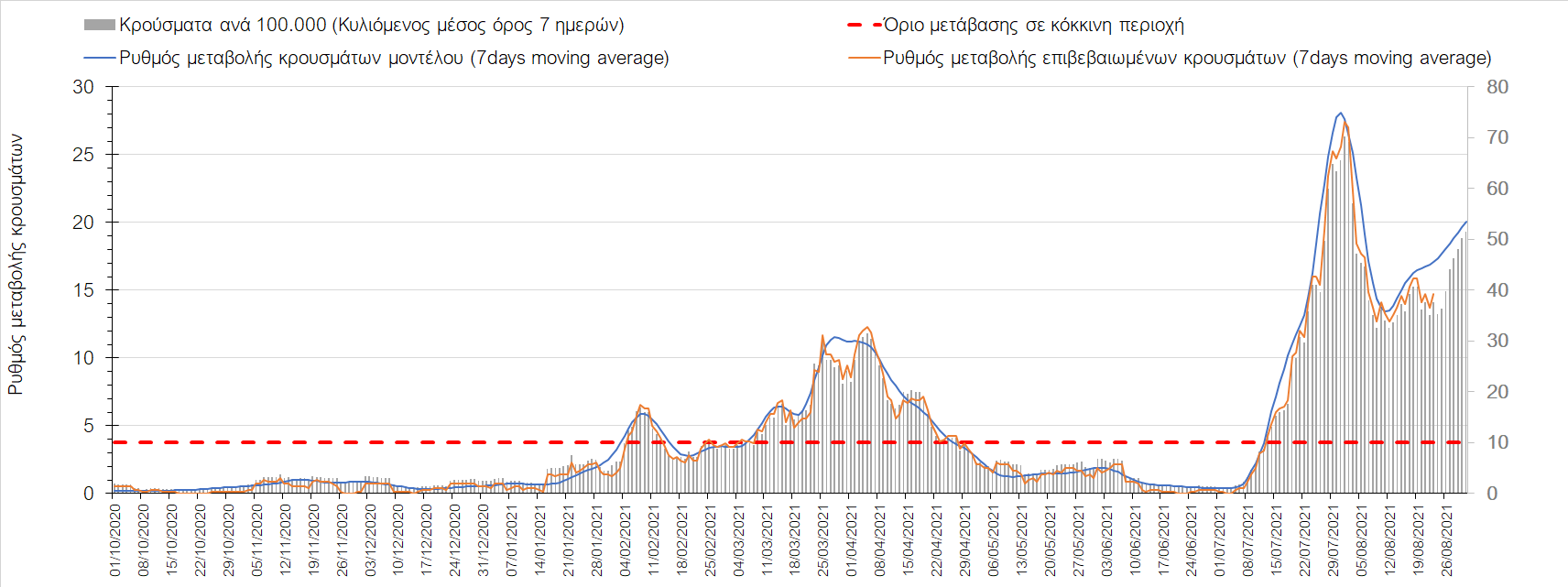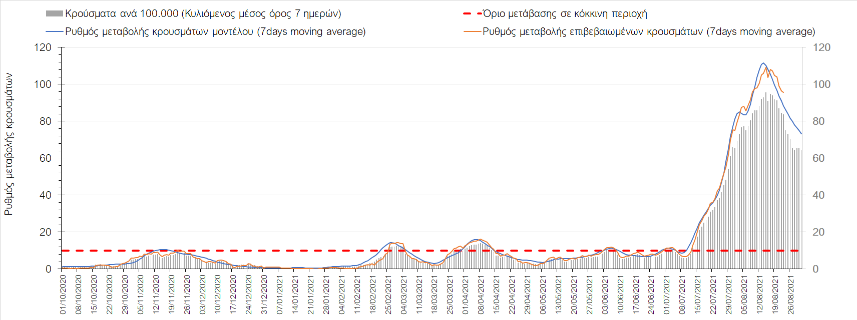 Από την αρχή του Ιουλίου παρατηρείται μια αύξηση του αριθμού των κρουσμάτων στην Αθήνα, η οποία δεν συνάδει ούτε με τη διαμόρφωση της μεταδοτικότητας από τη θερμοκρασία, αλλά ούτε και με τα υπάρχοντα μέτρα, και η οποία την έχει φέρει πέρα από το όριο της περιοχής ανησυχίας. Μια πιθανή εξήγηση είναι η αυξημένη διασπορά στην κοινότητα των μεταλλαγμένων στελεχών Β.1.1.318 και Β.1.167, οπότε και αναμένουμε τα δεδομένα των επομένων ημερών για να μπορέσουμε να διαμορφώσουμε μια πιο σαφή εικόνα.