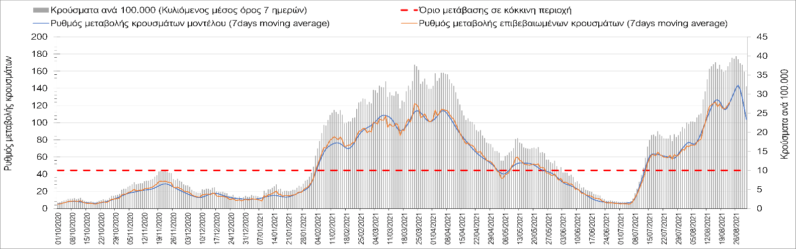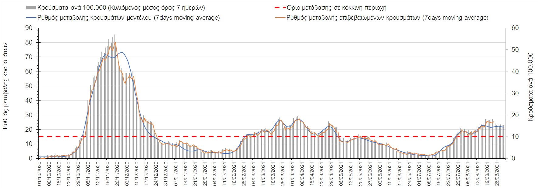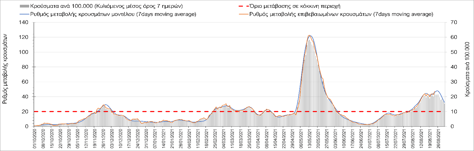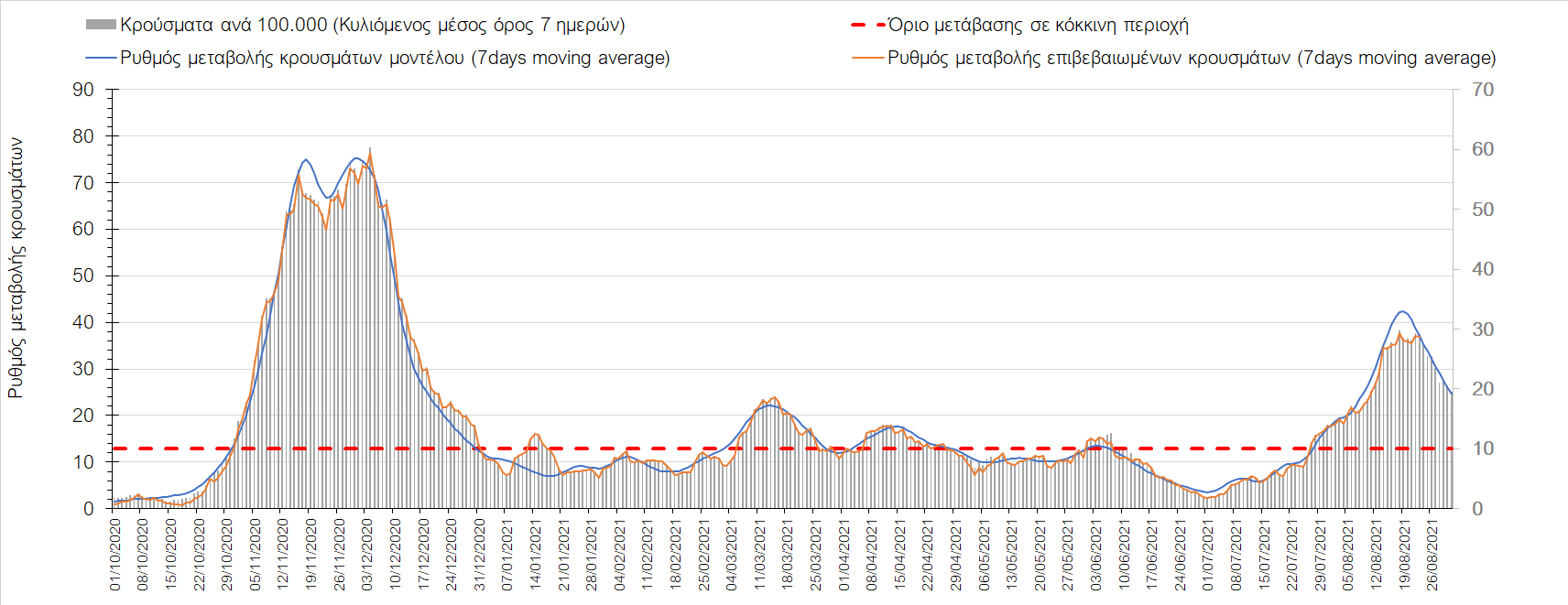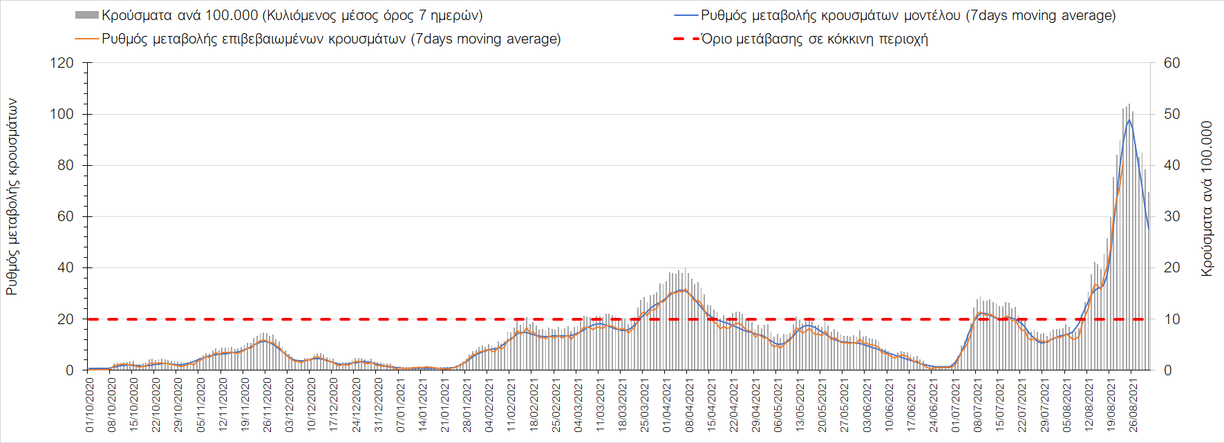 Από την αρχή του Ιουλίου παρατηρείται μια αύξηση του αριθμού των κρουσμάτων στην Αθήνα, η οποία δεν συνάδει ούτε με τη διαμόρφωση της μεταδοτικότητας από τη θερμοκρασία, αλλά ούτε και με τα υπάρχοντα μέτρα, και η οποία την έχει φέρει πέρα από το όριο της περιοχής ανησυχίας. Μια πιθανή εξήγηση είναι η αυξημένη διασπορά στην κοινότητα των μεταλλαγμένων στελεχών Β.1.1.318 και Β.1.167, οπότε και αναμένουμε τα δεδομένα των επομένων ημερών για να μπορέσουμε να διαμορφώσουμε μια πιο σαφή εικόνα.