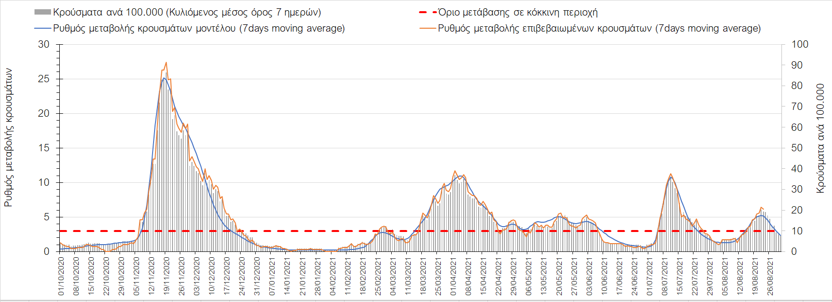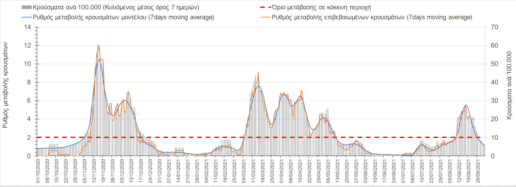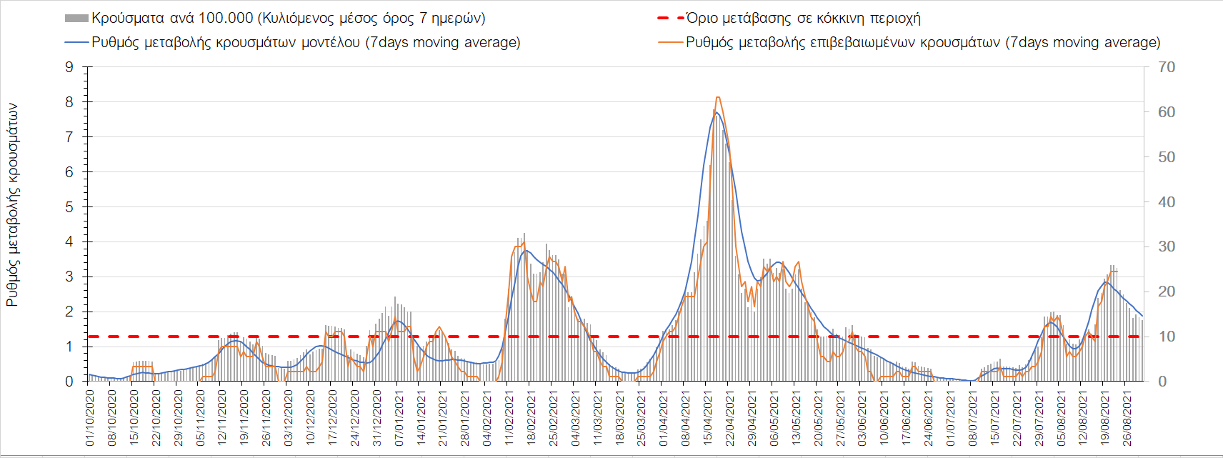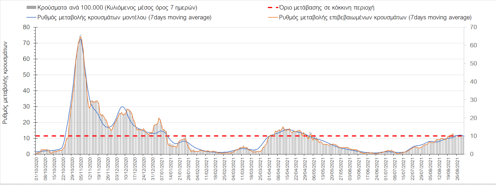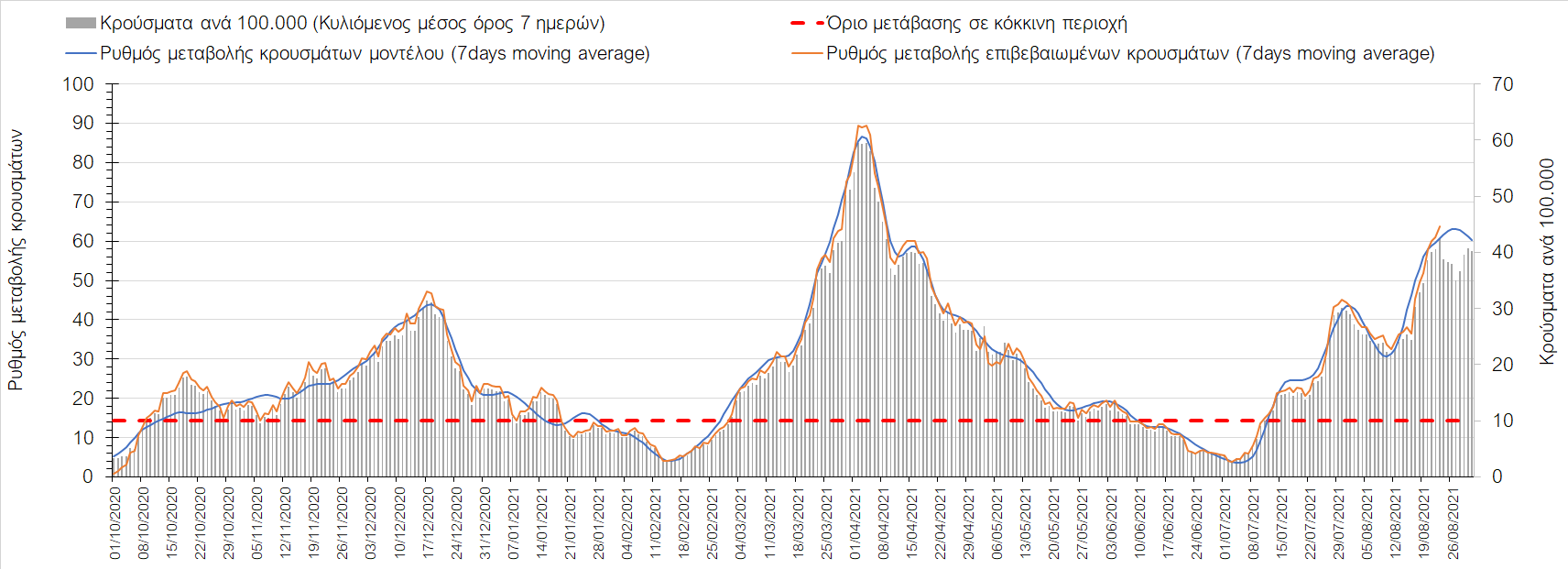 Από την αρχή του Ιουλίου παρατηρείται μια αύξηση του αριθμού των κρουσμάτων στην Αθήνα, η οποία δεν συνάδει ούτε με τη διαμόρφωση της μεταδοτικότητας από τη θερμοκρασία, αλλά ούτε και με τα υπάρχοντα μέτρα, και η οποία την έχει φέρει πέρα από το όριο της περιοχής ανησυχίας. Μια πιθανή εξήγηση είναι η αυξημένη διασπορά στην κοινότητα των μεταλλαγμένων στελεχών Β.1.1.318 και Β.1.167, οπότε και αναμένουμε τα δεδομένα των επομένων ημερών για να μπορέσουμε να διαμορφώσουμε μια πιο σαφή εικόνα.