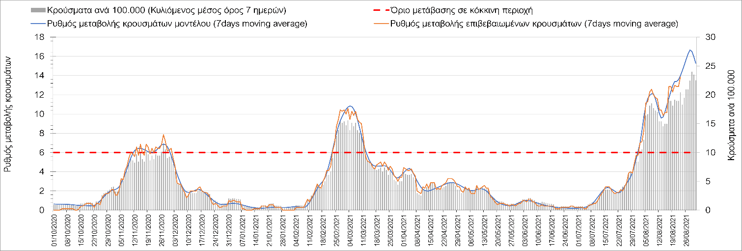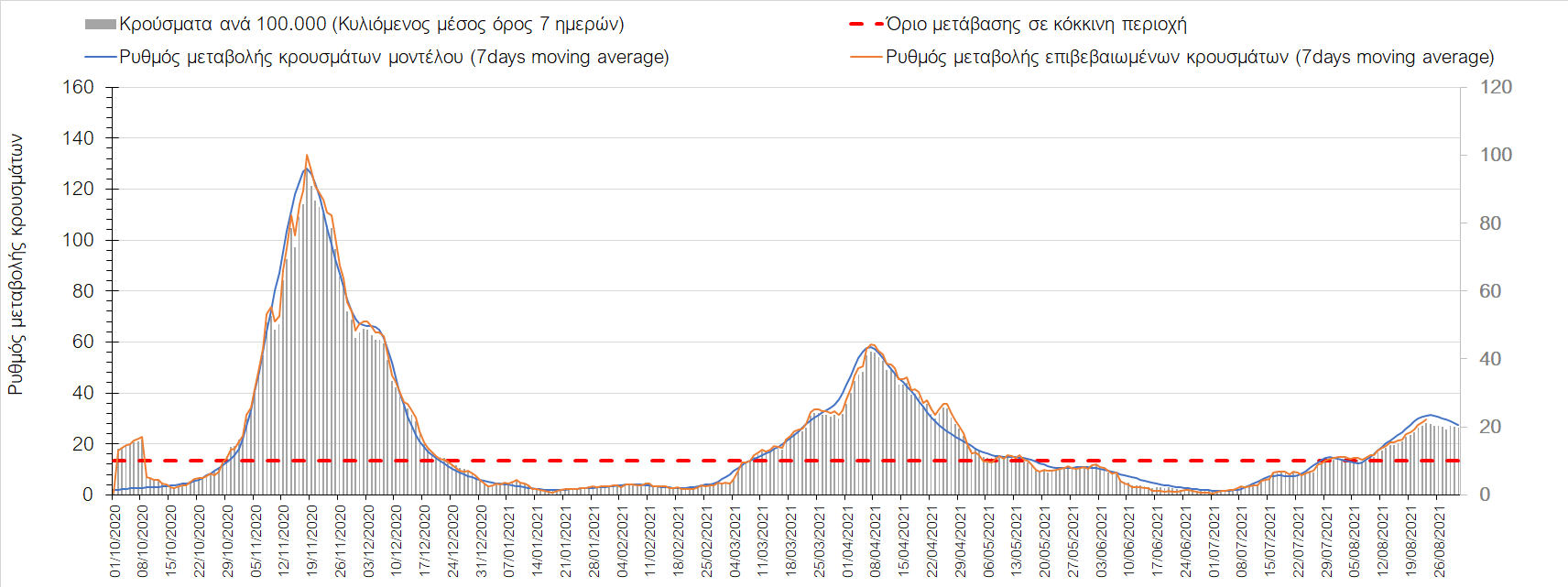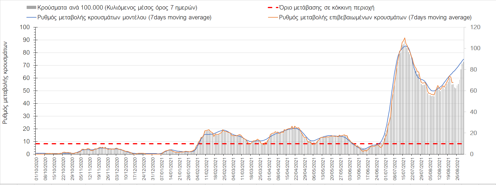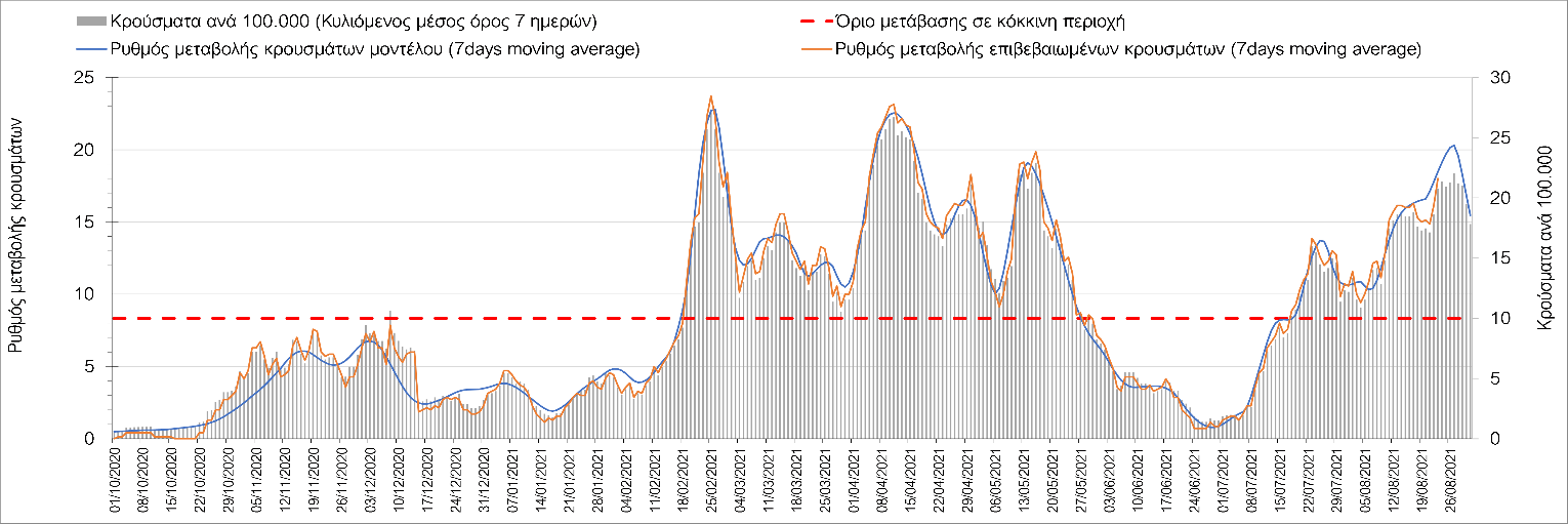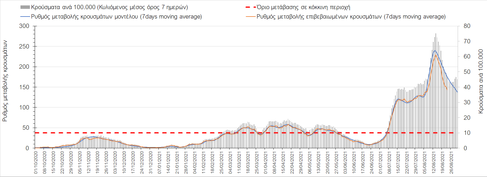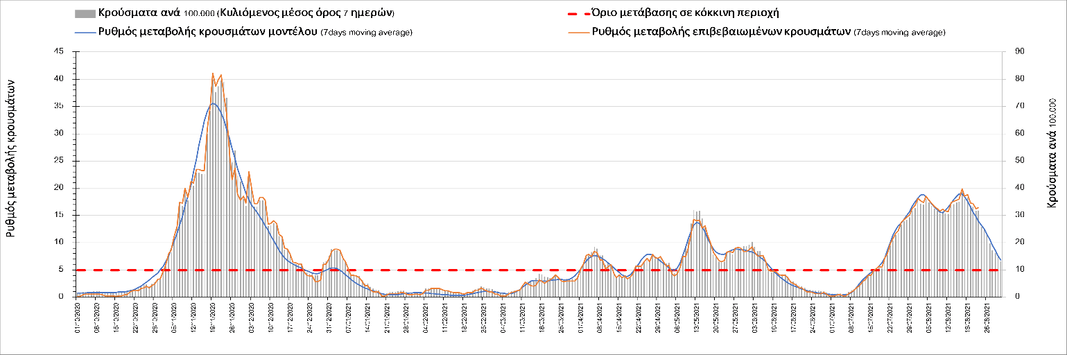 Από την αρχή του Ιουλίου παρατηρείται μια αύξηση του αριθμού των κρουσμάτων στην Αθήνα, η οποία δεν συνάδει ούτε με τη διαμόρφωση της μεταδοτικότητας από τη θερμοκρασία, αλλά ούτε και με τα υπάρχοντα μέτρα, και η οποία την έχει φέρει πέρα από το όριο της περιοχής ανησυχίας. Μια πιθανή εξήγηση είναι η αυξημένη διασπορά στην κοινότητα των μεταλλαγμένων στελεχών Β.1.1.318 και Β.1.167, οπότε και αναμένουμε τα δεδομένα των επομένων ημερών για να μπορέσουμε να διαμορφώσουμε μια πιο σαφή εικόνα.
