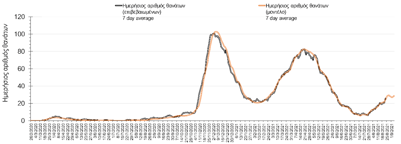 Σχήμα 3. Αριθμός θανάτων (κυλιόμενος μέσος όρος 7 ημερών) σύμφωνα με τα στοιχεία του ΕΟΔΥ και τις προβλέψεις της υπολογιστικής πλατφόρμας CORE.