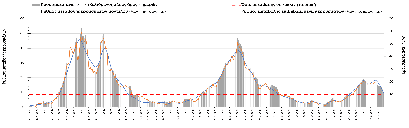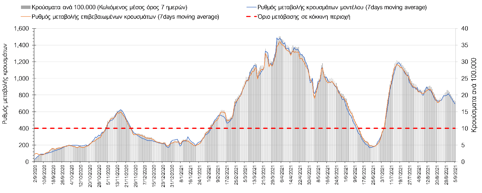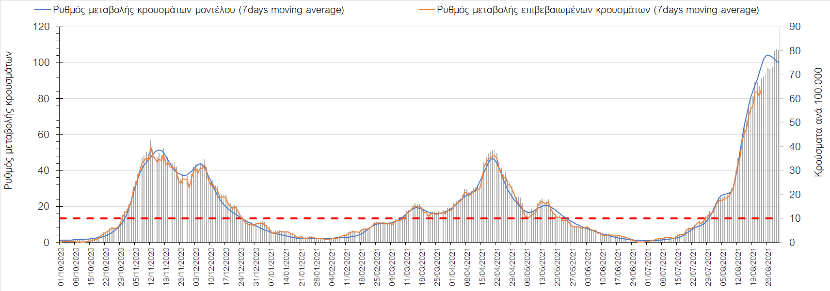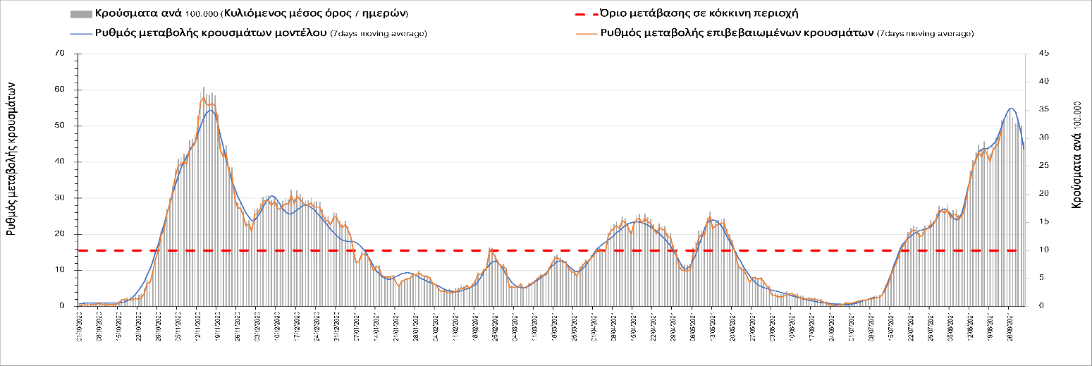 Σε πανελλαδικό επίπεδο ο κυλιόμενος εβδομαδιαίος μέσος όρος του δείκτη θετικότητας διαμορφώθηκε στο 3,7% (η ημερήσια τιμή είναι 5,6%) ενώ ο κυλιόμενος εβδομαδιαίος μέσος όρος του πραγματικού αριθμού αναπαραγωγής Rt (δηλαδή ο αριθμός των ατόμων που ένας φορέας μπορεί να επιμολύνει) αυξήθηκε ελαφρά και διαμορφώθηκε στο 1,03 (τιμές του Rt πάνω από τη μονάδα υποδηλώνουν αύξηση της διασποράς του ιού στην κοινότητα).