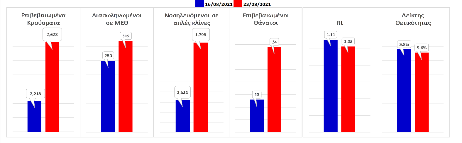 Σχήμα 58. Συγκριτικά αποτελέσματα της επιδημιολογικής εικόνας της σημερινής Δευτέρας (23/08/2021) σε σχέση με την προηγούμενη (16/08/2021)