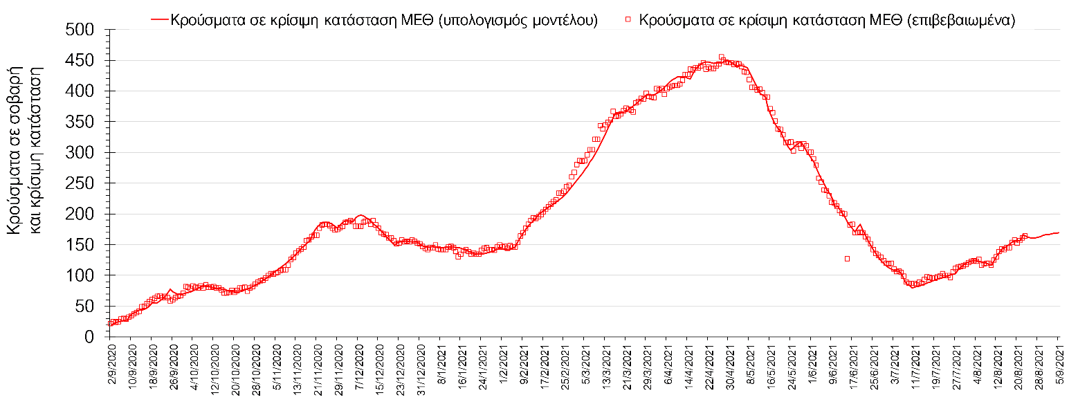 Η πορεία των κρουσμάτων στην Αττική, παρουσιάζεται στο Σχήμα 5, ενώ η πορεία των κρουσμάτων σε κρίσιμη κατάσταση (διασωληνωμένοι σε ΜΕΘ) παρουσιάζονται στο Σχήμα 6.