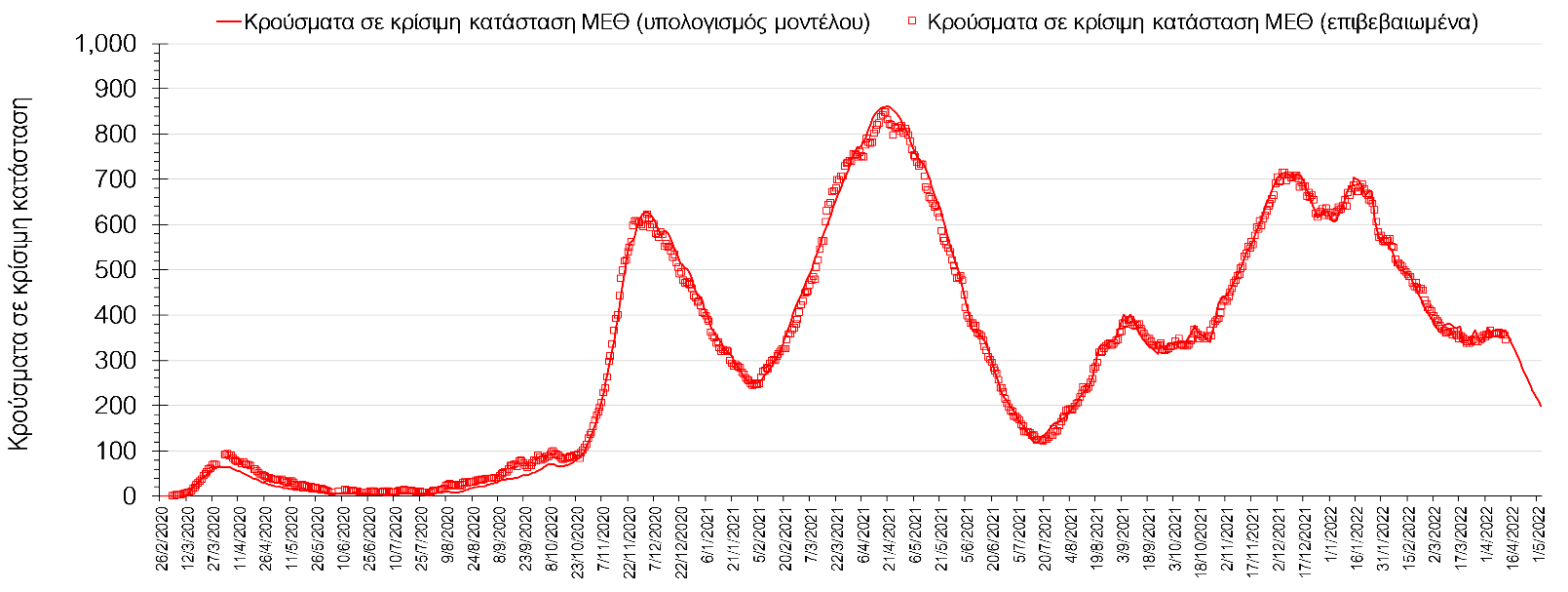 Η πορεία της μέσης εβδομαδιαίας τιμής των κρουσμάτων, καθώς και του κυλιόμενου μέσου όρου 7 ημερών του αριθμού των κρουσμάτων ανά 100.000 πληθυσμού, όπως έχουν καταγραφεί από τον ΕΟΔΥ και η αναμενόμενη πορεία τους, όπως προδιαγράφεται από την υπολογιστική πλατφόρμα CORE για την Ελληνική επικράτεια (όπως και στην Αττική και τη Θεσσαλονίκη) μέχρι τις 30 Απριλίου, αποτυπώνονται στο Σχήμα 4. Αυτή η προβλεπόμενη πορεία, που αφορά τα κρούσματα, τους νοσηλευόμενους σε απλές κλίνες, όσο και σε ΜΕΘ, καθώς επίσης και τους θανάτους, βασίζεται στις ακόλουθες παραδοχές: