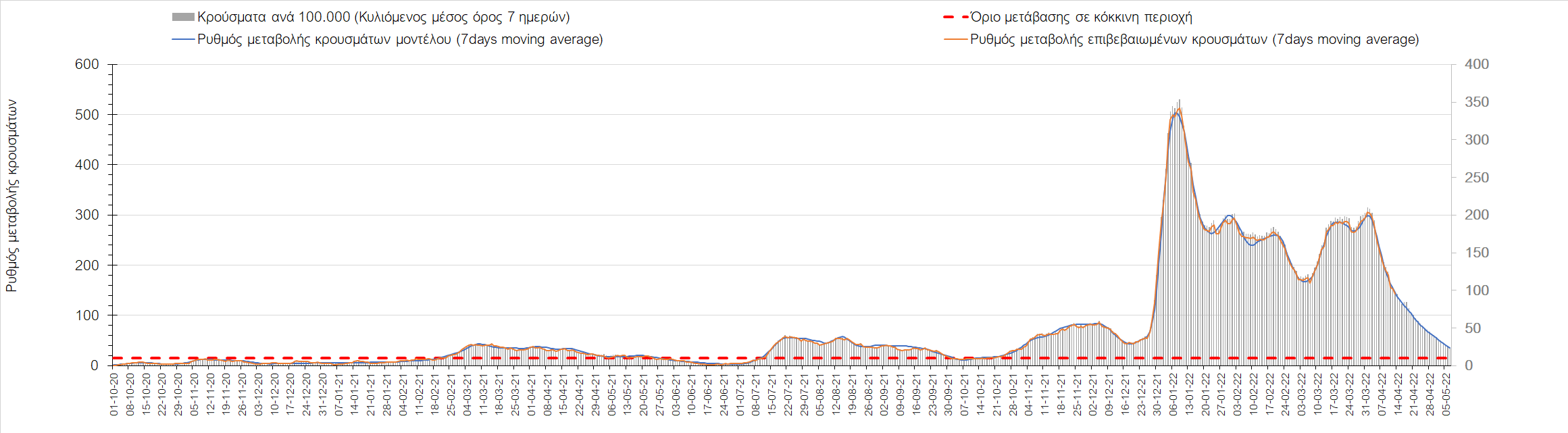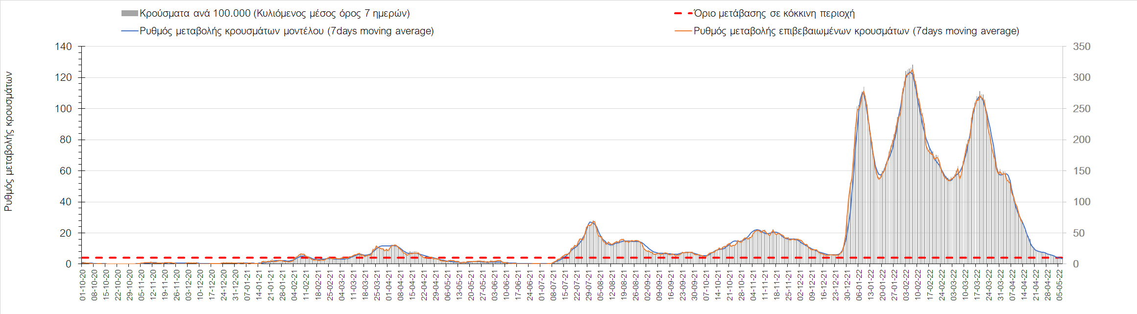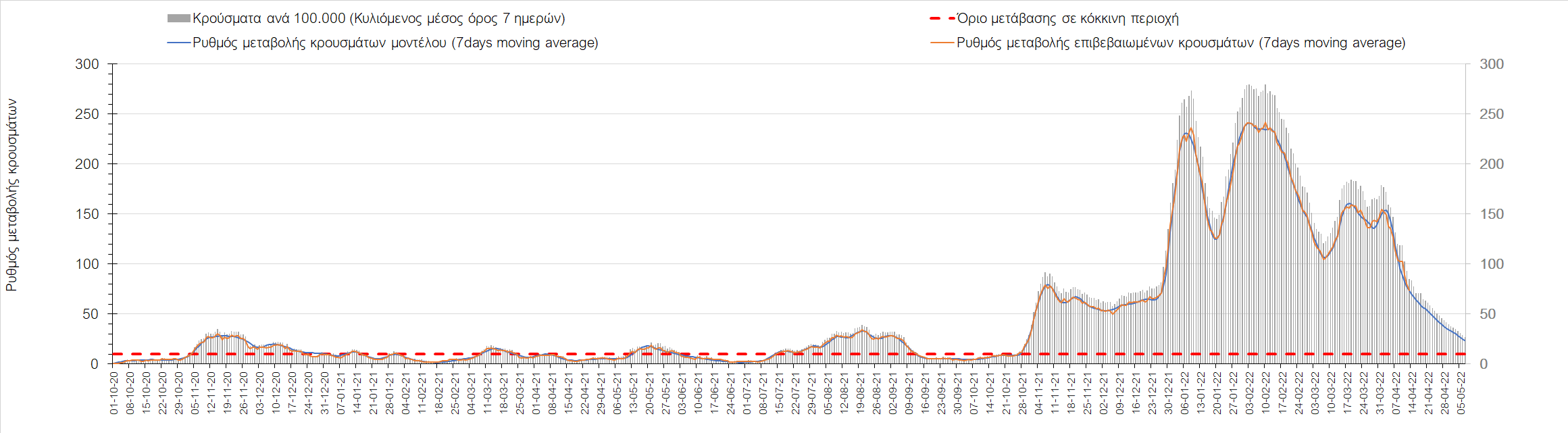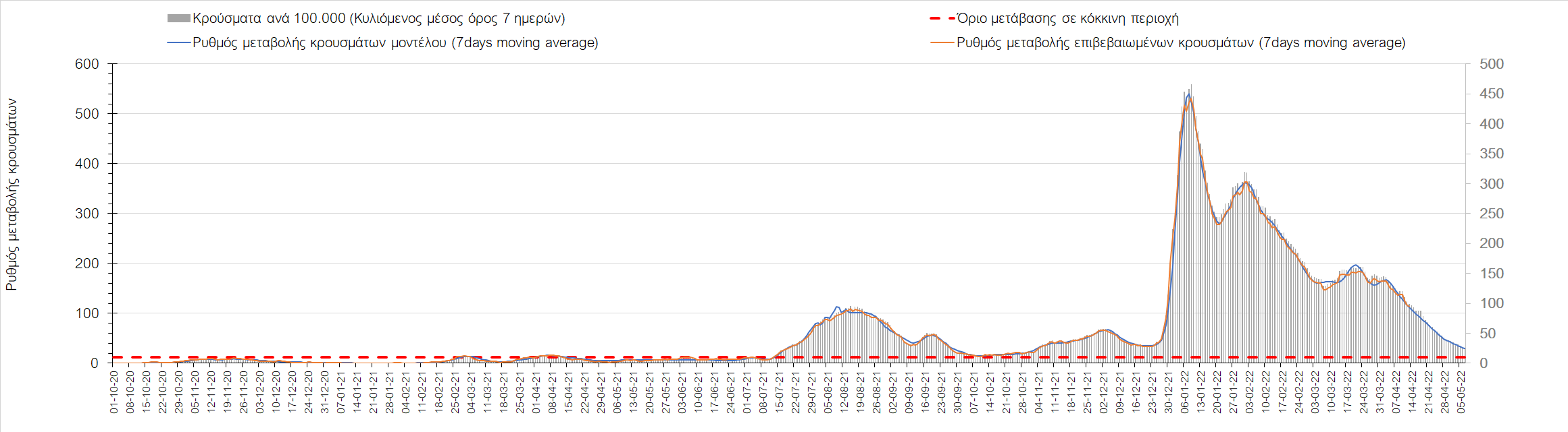 Συμπεράσματα: Με βάση τα σημερινά αποτελέσματα, σε σχέση με την Τρίτη, παρατηρήθηκε μικρότερος αριθμός ασθενών σε κρίσιμη κατάσταση (διασωληνωμένοι σε ΜΕΘ) και οριακά μεγαλύτερος αριθμός θανάτων από COVID-19. Σε πανελλαδικό επίπεδο ο κυλιόμενος εβδομαδιαίος μέσος όρος του δείκτη θετικότητας διαμορφώθηκε στο 5,7% (η ημερήσια τιμή είναι 4,8%) ενώ ο κυλιόμενος εβδομαδιαίος μέσος όρος του πραγματικού αριθμού αναπαραγωγής Rt (δηλαδή ο αριθμός των ατόμων που ένας φορέας μπορεί να επιμολύνει) μειώθηκε στο 0,69 (Rt κάτω από τη μονάδα υποδηλώνει καθαρή μείωση της διασποράς του ιού στην κοινότητα).