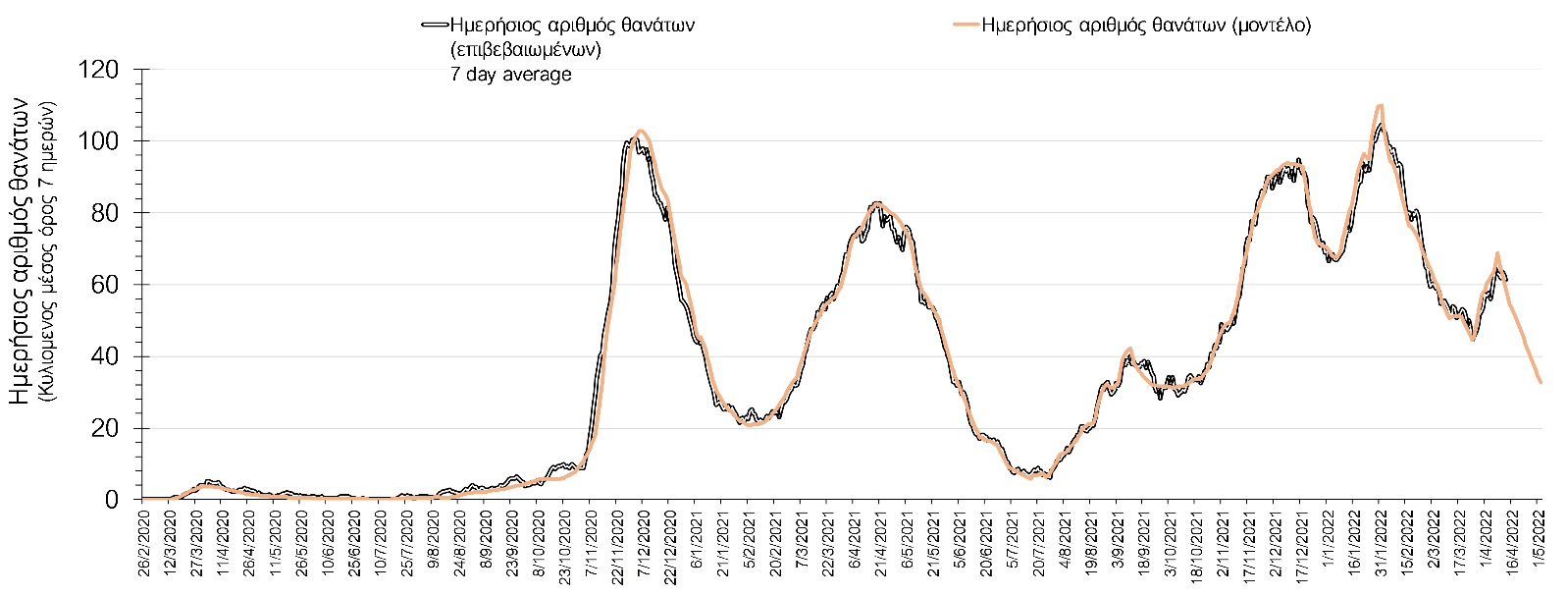 Ο αριθμός ημερήσιων θανάτων (65) που καταγράφηκε είναι οριακά υψηλότερος σε σχέση με την Τρίτη (64). Όπως είχαμε προβλέψει ο κυλιόμενος εβδομαδιαίος μέσος όρος που είναι 61,3 παραμένει υψηλός, και τόσο ο αριθμός, όσο και η τάση του, δε συνάδει με τον αριθμό των νοσηλειών σε κρίσιμη κατάσταση (διασωληνωμένοι σε ΜΕΘ).
