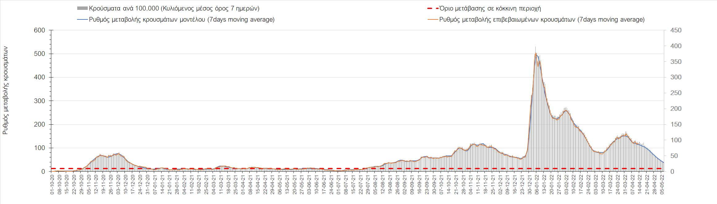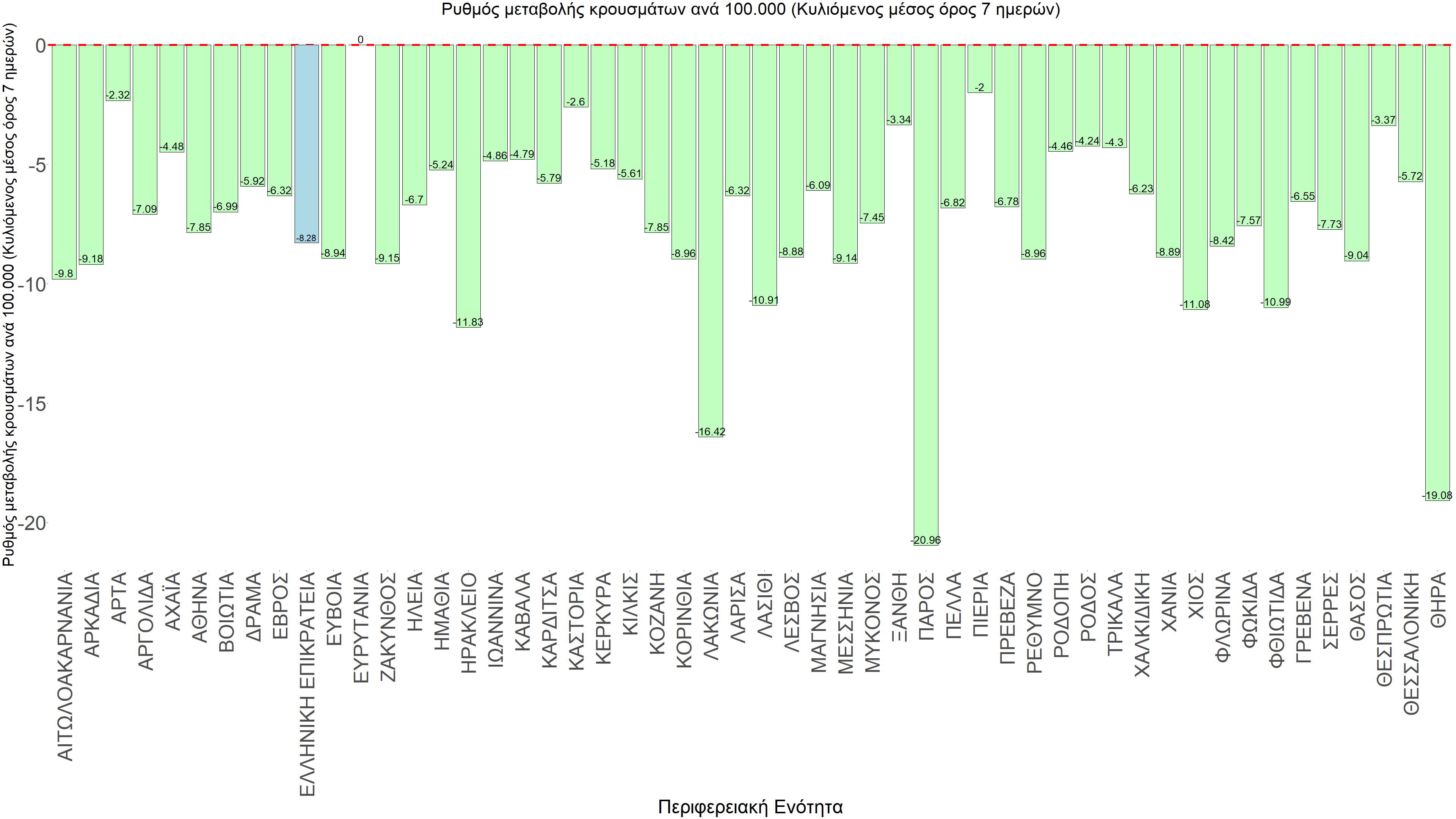 Η αποτύπωση των τάσεων στις επιμέρους περιοχές, παρουσιάζεται στο Σχήμα 61, όπου παρουσιάζεται ο ρυθμός μεταβολής των νέων κρουσμάτων ανά 100.000 κατοίκους (κυλιόμενος μέσος όρος 7 ημερών) των επιμέρους περιοχών. Θετικές τιμές του ρυθμού μεταβολής υποδηλώνουν άνοδο, ενώ αρνητικές τιμές υποδηλώνουν πτωτική πορεία.