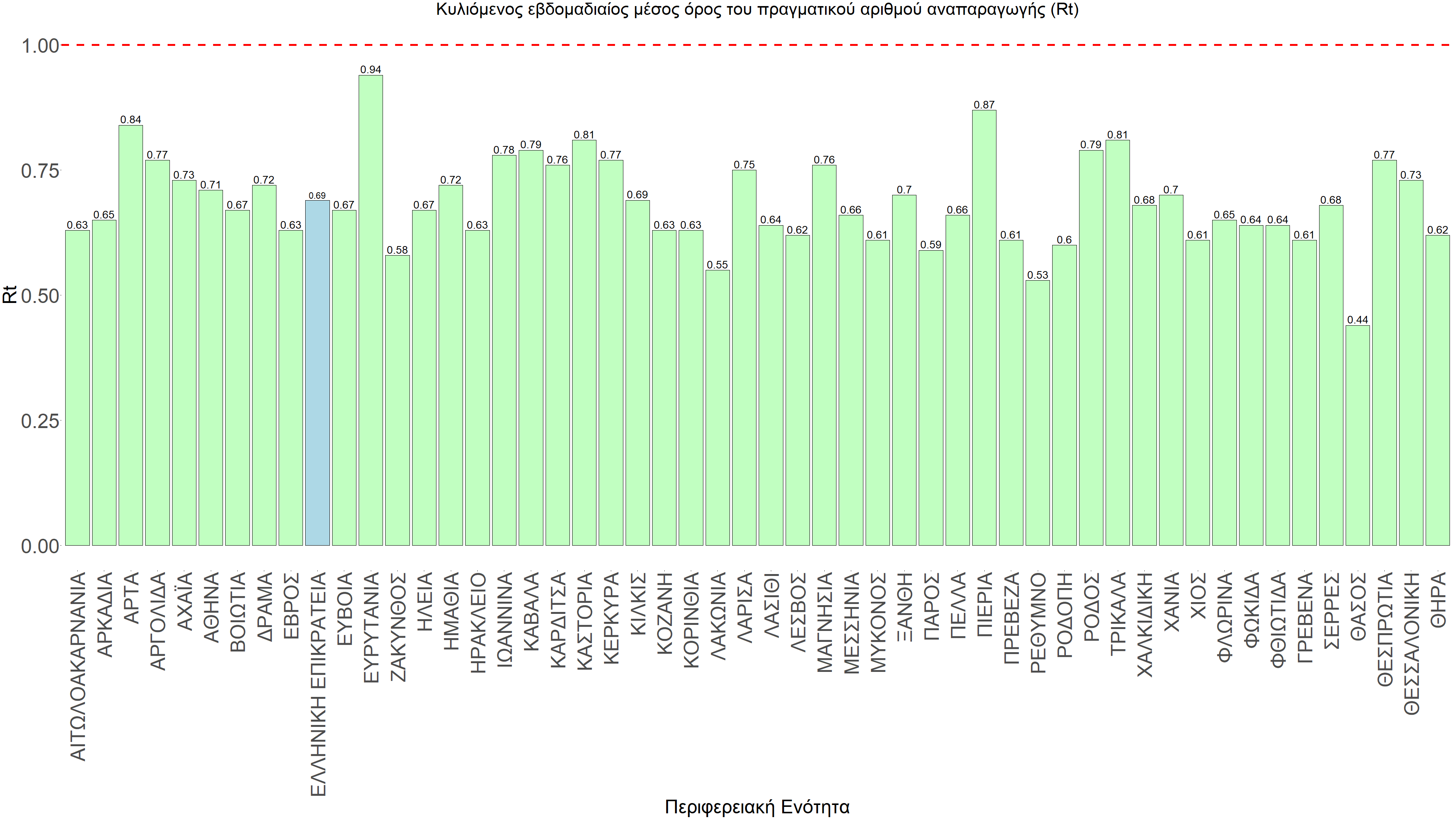 O πραγματικός αριθμός αναπαραγωγής Rt ανά περιφερειακή ενότητα της χώρας παρουσιάζεται στο Σχήμα 58.
