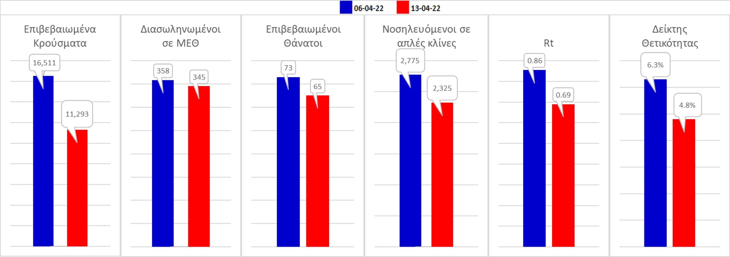 Σχήμα 59. Συγκριτικά αποτελέσματα της επιδημιολογικής εικόνας της σημερινής Τετάρτης (13/04/2022) σε σχέση με την προηγούμενη (06/04/2022)