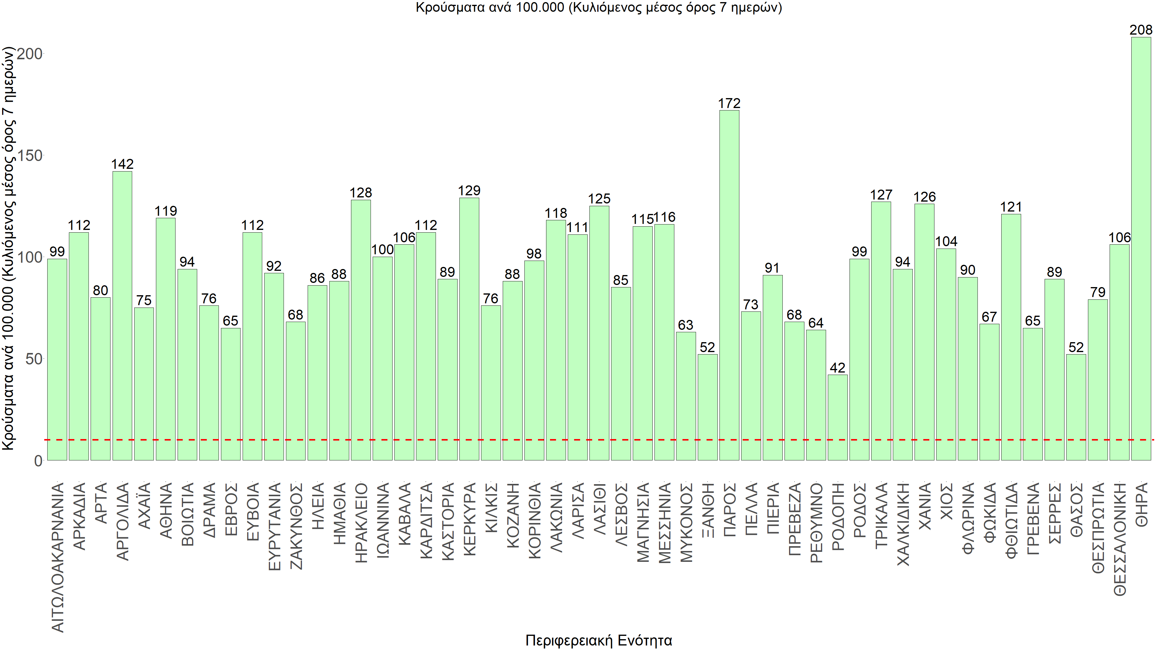 Σχήμα 60. Συγκεντρωτική εικόνα των νέων κρουσμάτων ανά 100.000 κατοίκους (κυλιόμενος μέσος όρος 7 ημερών) των επιμέρους περιοχών