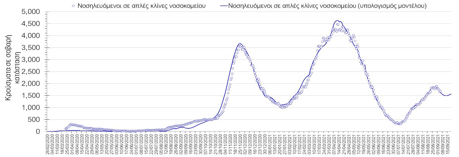 Σχήμα 2. Αριθμός κρουσμάτων σε σοβαρή κατάσταση (νοσηλευόμενοι σε απλές κλίνες) σύμφωνα με τα στοιχεία του ΕΟΔΥ και τις προβλέψεις της υπολογιστικής πλατφόρμας CORE.