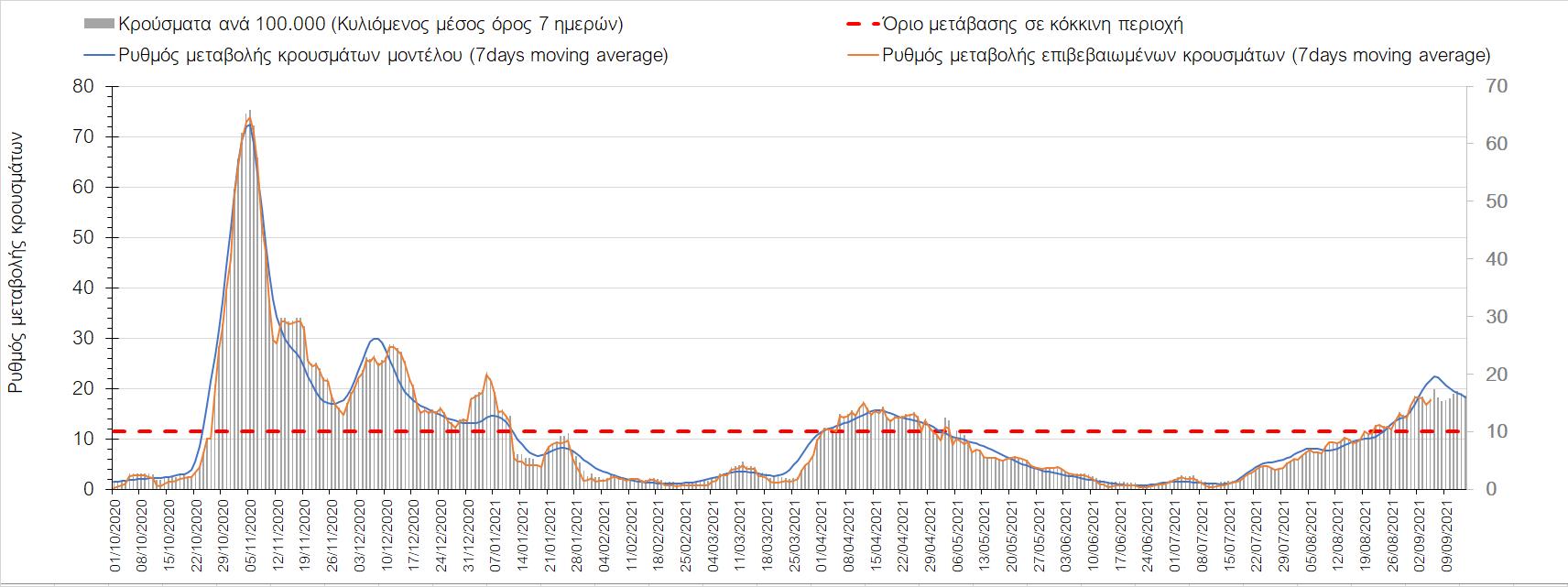 Σε πανελλαδικό επίπεδο ο κυλιόμενος εβδομαδιαίος μέσος όρος του δείκτη θετικότητας διαμορφώθηκε στο 3,0% (η ημερήσια τιμή είναι 2,4%) ενώ ο κυλιόμενος εβδομαδιαίος μέσος όρος του πραγματικού αριθμού αναπαραγωγής Rt (δηλαδή ο αριθμός των ατόμων που ένας φορέας μπορεί να επιμολύνει) μειώθηκε ελαφρά και διαμορφώθηκε στο 0,85 (Rt κάτω από τη μονάδα υποδηλώνει μείωση της διασποράς του ιού στην κοινότητα).