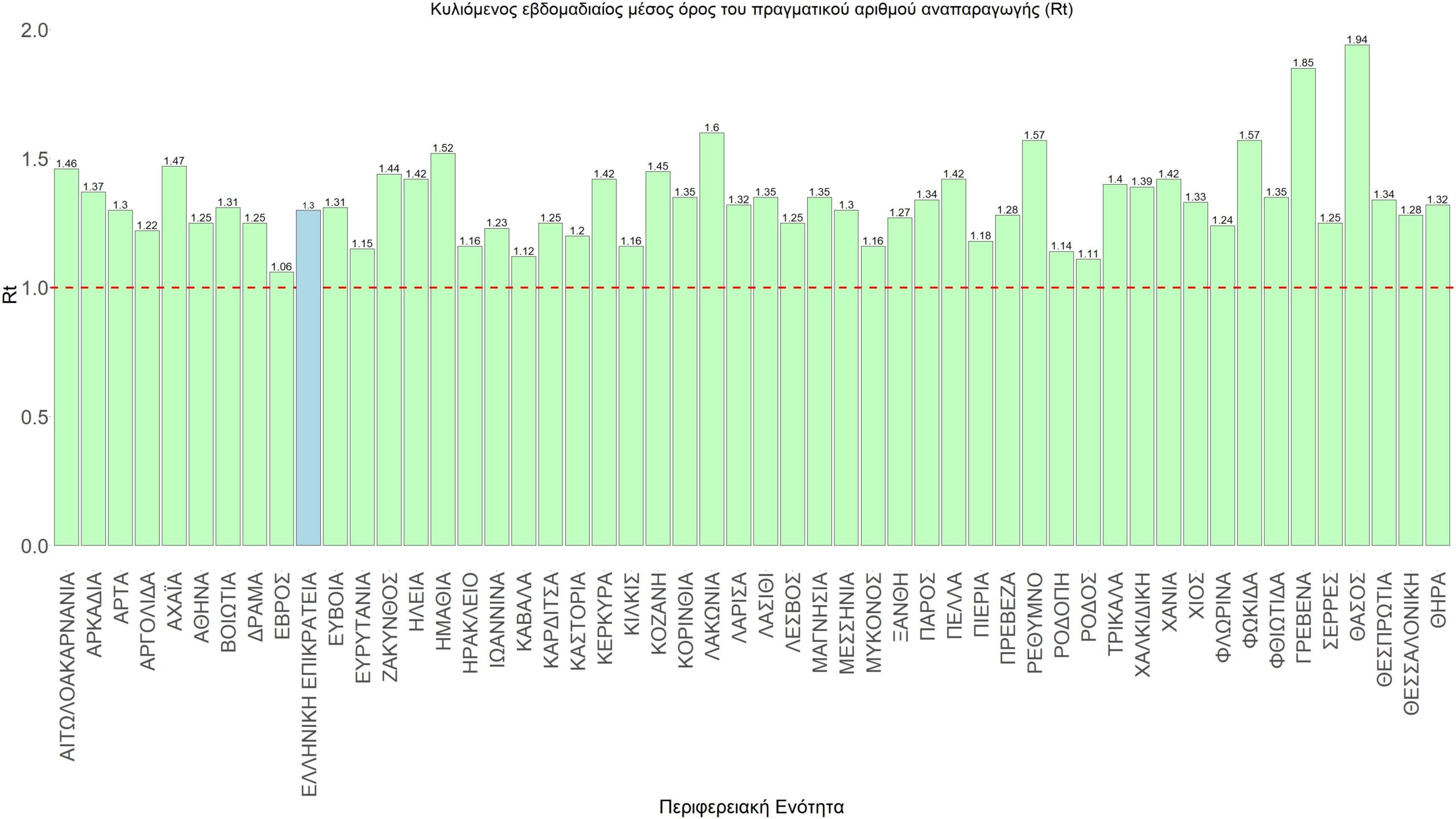 O πραγματικός αριθμός αναπαραγωγής Rt ανά περιφερειακή ενότητα της χώρας παρουσιάζεται στο Σχήμα 58.