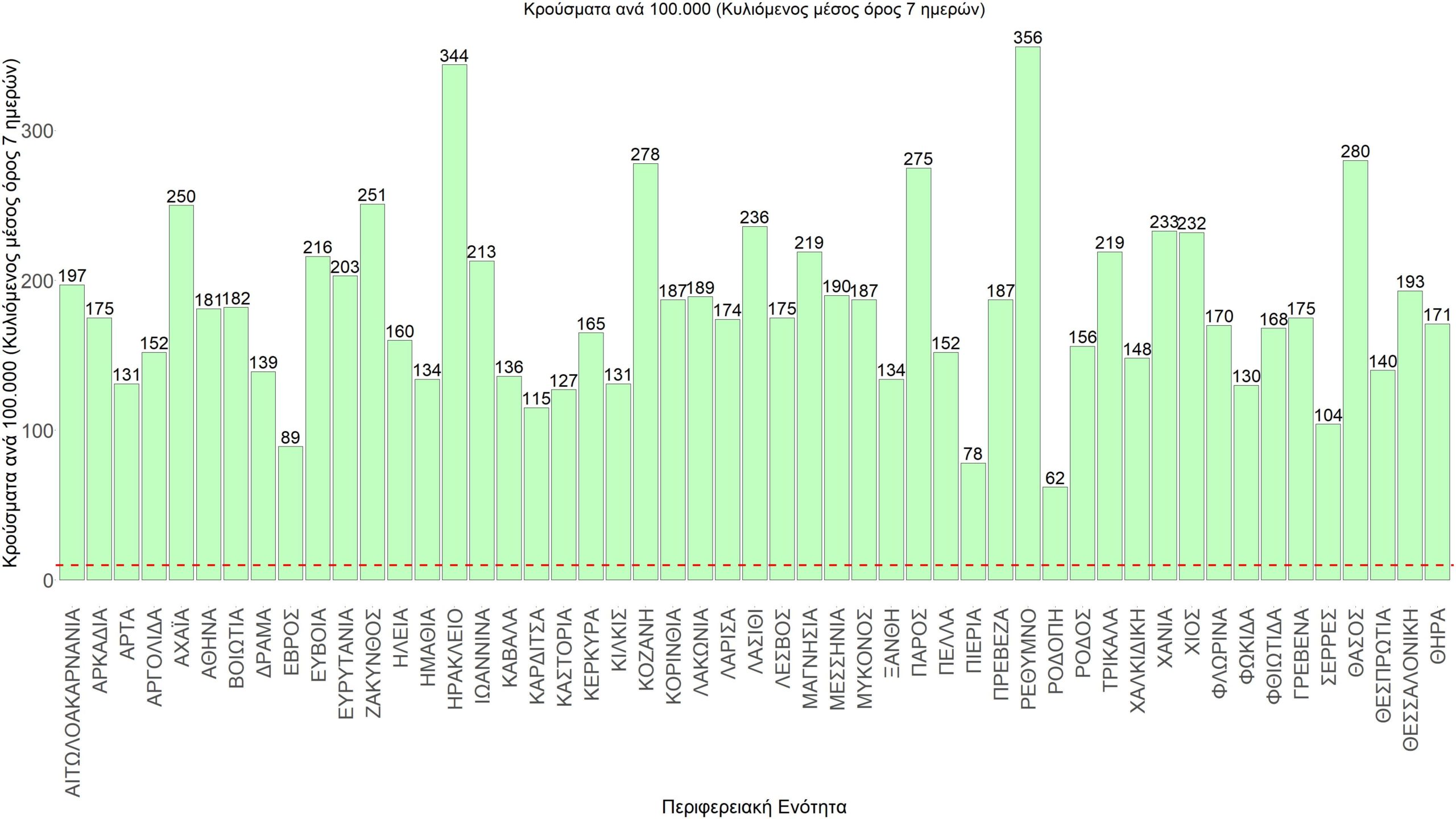 Σχήμα 60. Συγκεντρωτική εικόνα των νέων κρουσμάτων ανά 100.000 κατοίκους (κυλιόμενος μέσος όρος 7 ημερών) των επιμέρους περιοχών