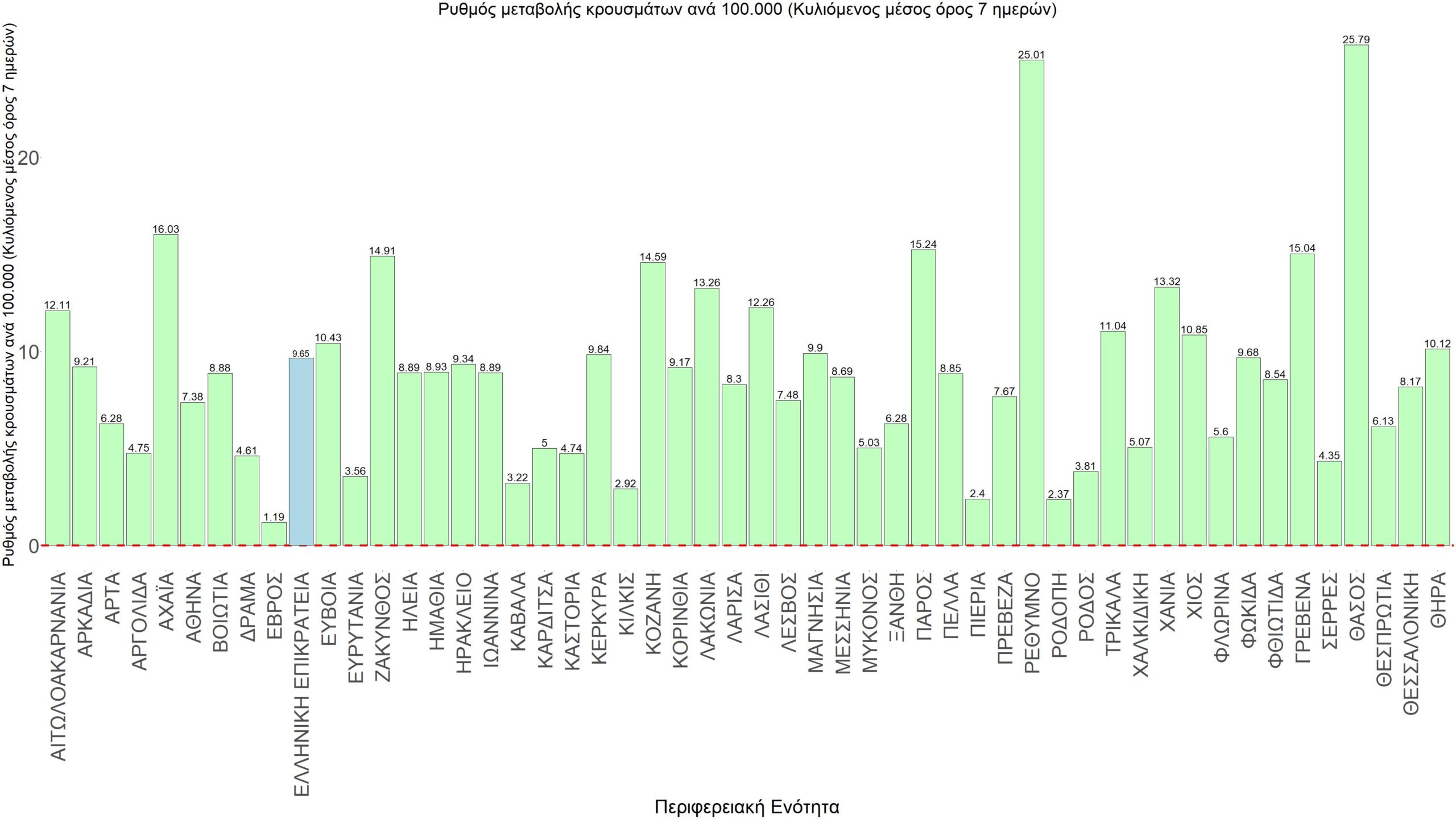 Η αποτύπωση των τάσεων στις επιμέρους περιοχές, παρουσιάζεται στο Σχήμα 61, όπου παρουσιάζεται ο ρυθμός μεταβολής των νέων κρουσμάτων ανά 100.000 κατοίκους (κυλιόμενος μέσος όρος 7 ημερών) των επιμέρους περιοχών. Θετικές τιμές του ρυθμού μεταβολής υποδηλώνουν άνοδο, ενώ αρνητικές τιμές υποδηλώνουν πτωτική πορεία.
