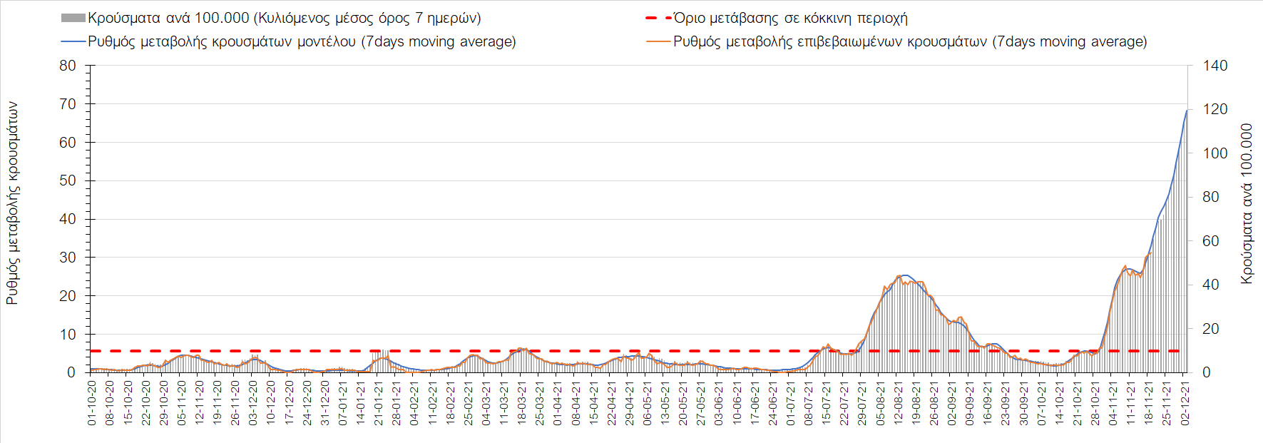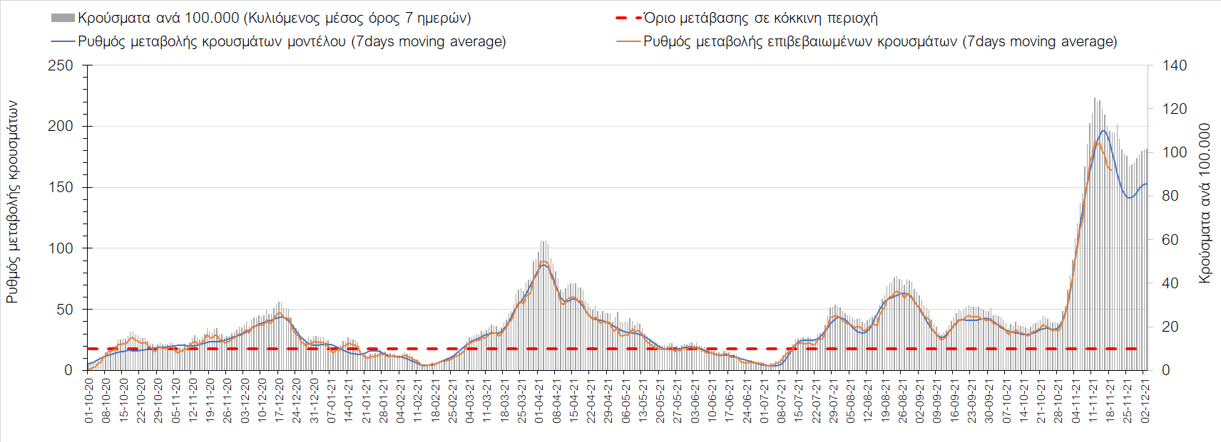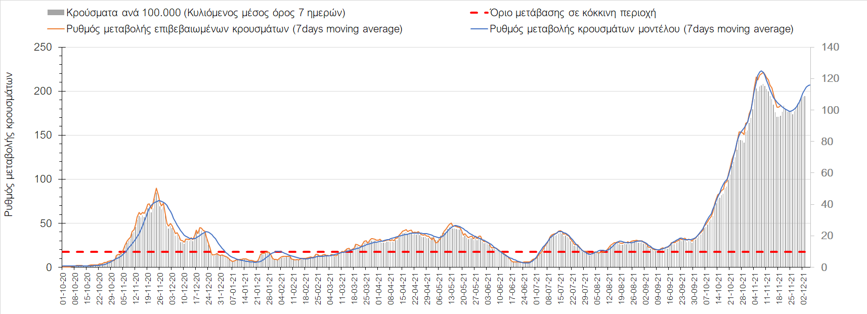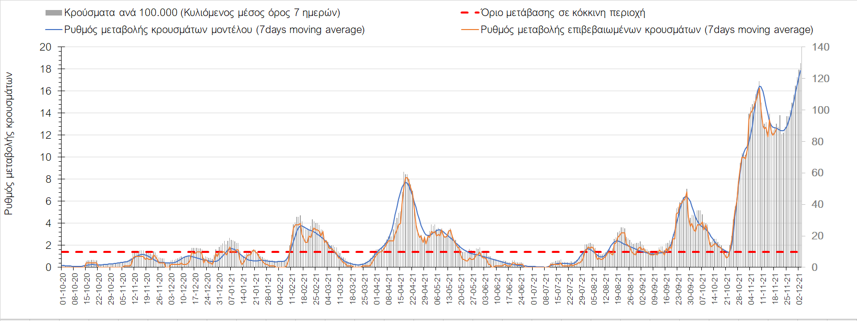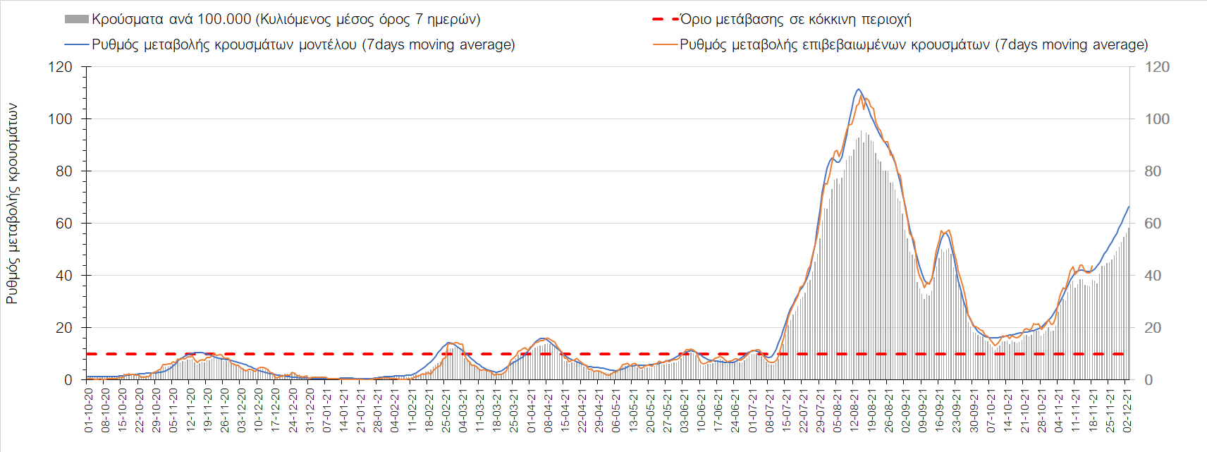 Η επιταχυνόμενη αύξηση του αριθμού των κρουσμάτων της προηγούμενης εβδομάδας, ως απόρροια της προοδευτικής μείωση της θερμοκρασίας και η επαγόμενης αύξηση της μεταδοτικότητας, που οδηγούν στην ανοδική τάση της φθινοπωρινής και χειμερινής περιόδου όπως δυστυχώς είχαμε προβλέψει, ενώ είχε δώσει τη θέση της σε μικρής διάρκειας σταθεροποίηση έως και ήπια αποκλιμάκωση, που σε σημαντικό βαθμό οφείλονταν στον αυξημένο αριθμό τεστ που αναφέραμε, πλέον συνεχίζει πάλι ανοδικά από το τέλος της εβδομάδας όπως είχαμε ανακοινώσει και νωρίτερα.