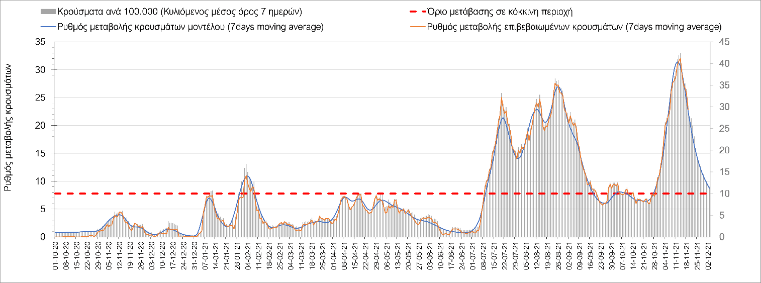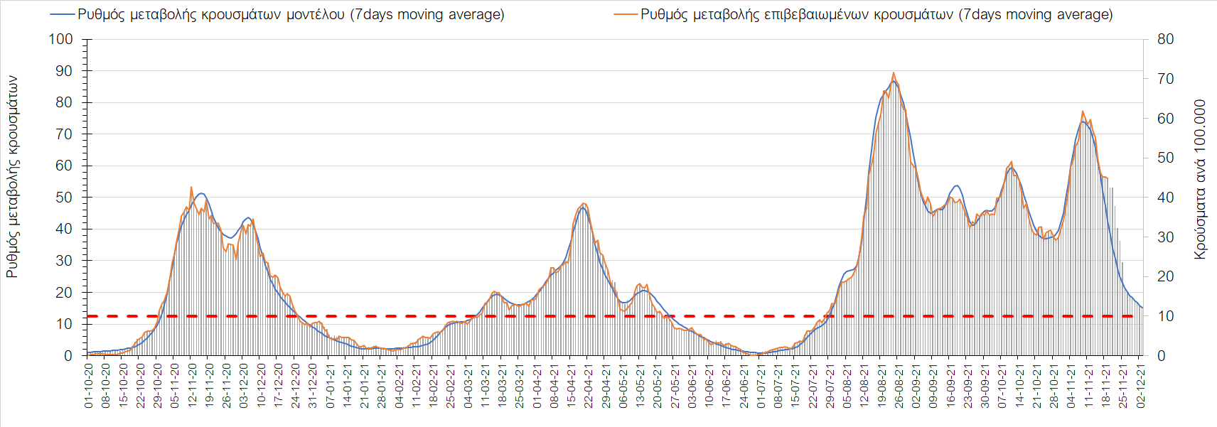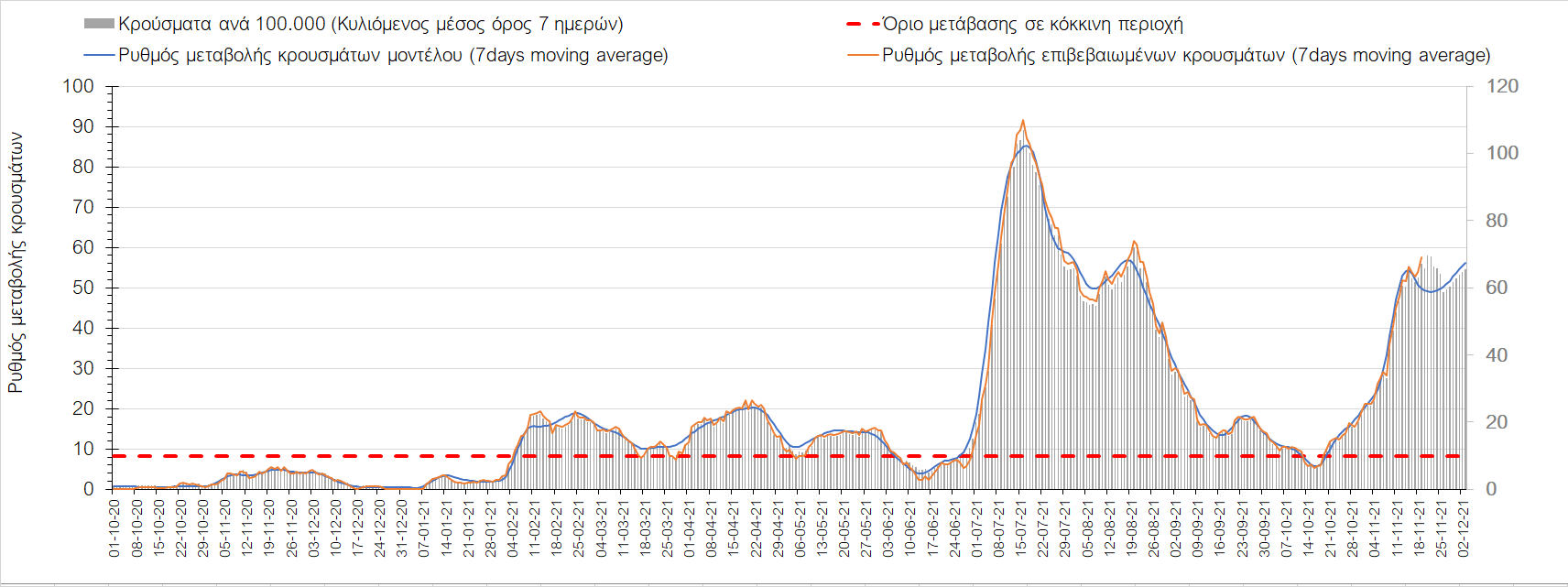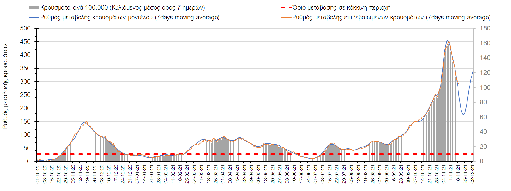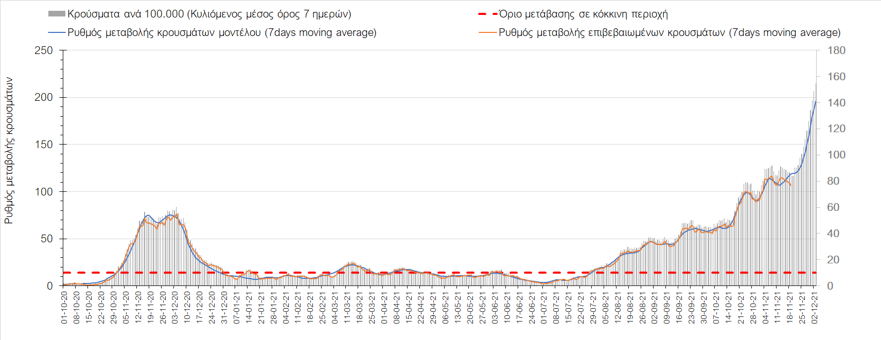Η επιταχυνόμενη αύξηση του αριθμού των κρουσμάτων της προηγούμενης εβδομάδας, ως απόρροια της προοδευτικής μείωση της θερμοκρασίας και η επαγόμενης αύξηση της μεταδοτικότητας, που οδηγούν στην ανοδική τάση της φθινοπωρινής και χειμερινής περιόδου όπως δυστυχώς είχαμε προβλέψει, ενώ είχε δώσει τη θέση της σε μικρής διάρκειας σταθεροποίηση έως και ήπια αποκλιμάκωση, που σε σημαντικό βαθμό οφείλονταν στον αυξημένο αριθμό τεστ που αναφέραμε, πλέον συνεχίζει πάλι ανοδικά από το τέλος της εβδομάδας όπως είχαμε ανακοινώσει και νωρίτερα.