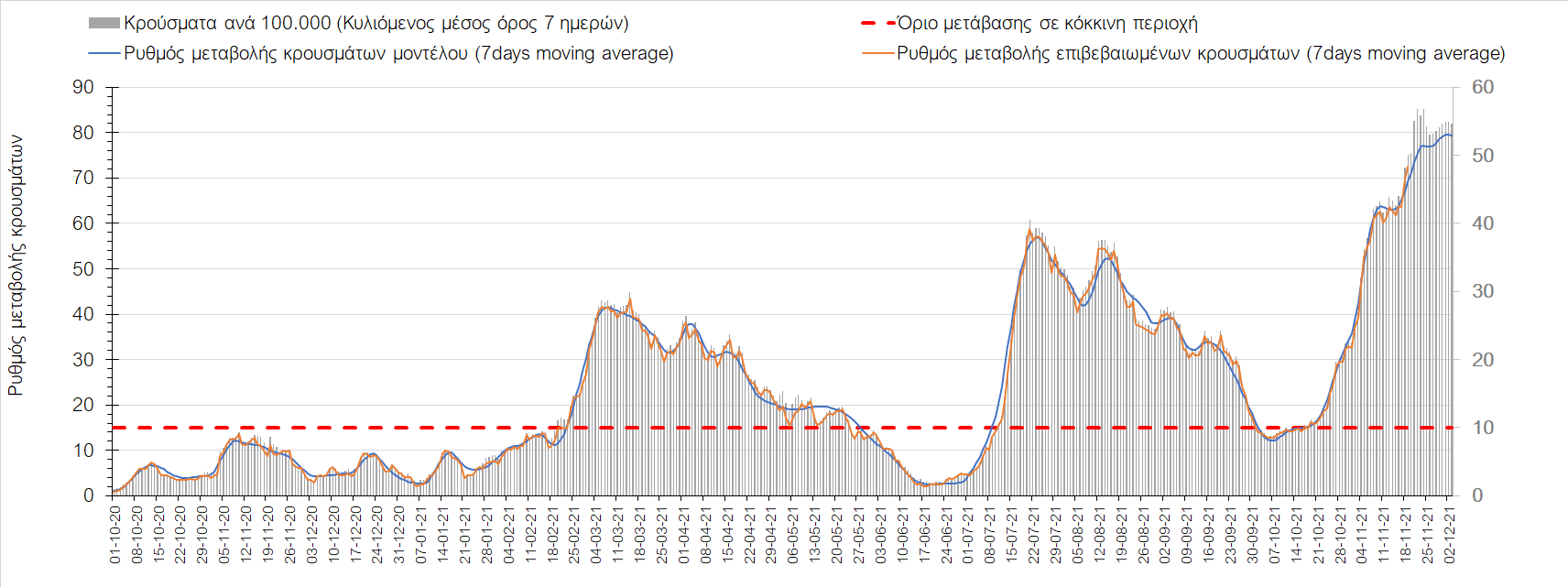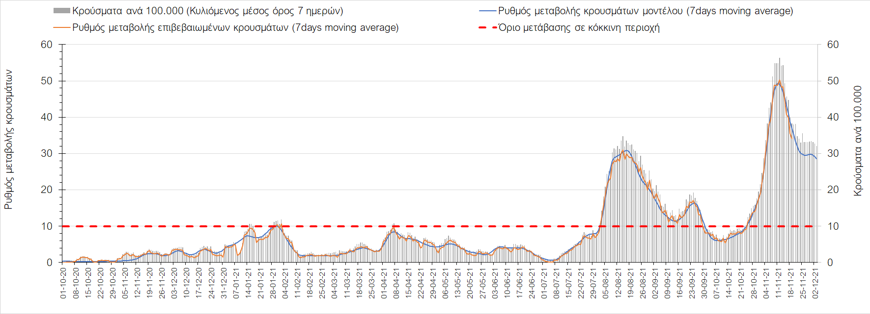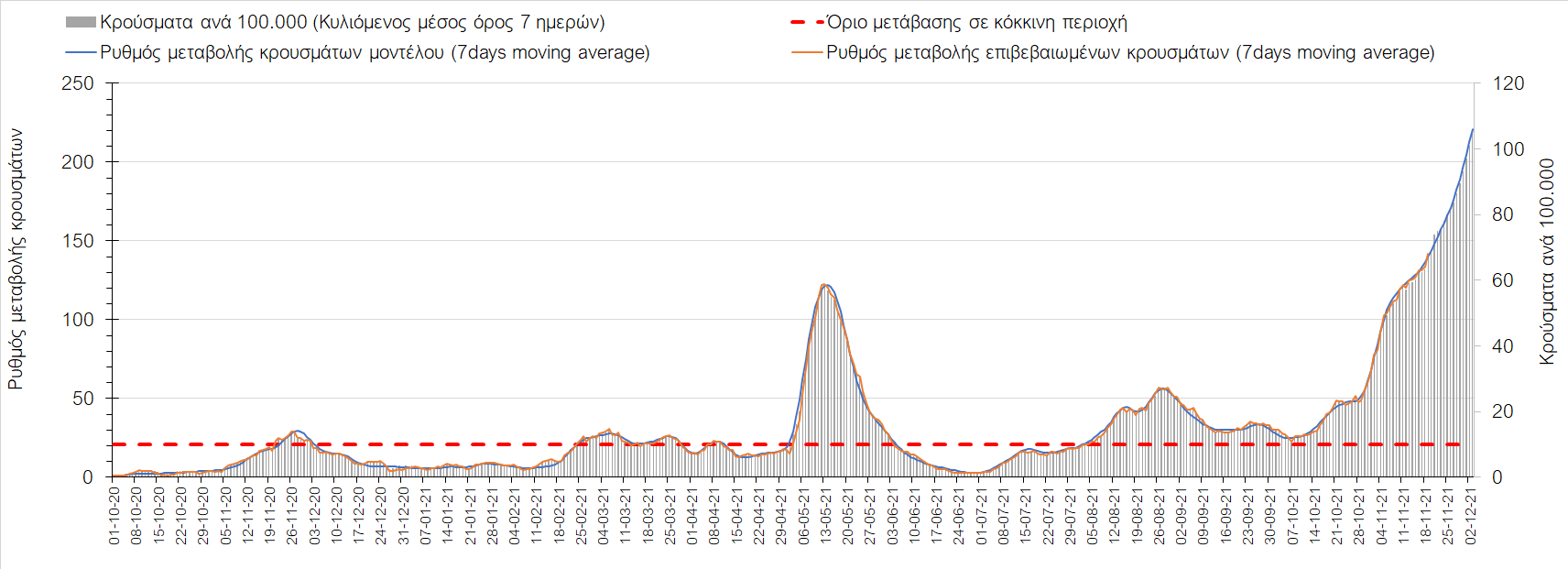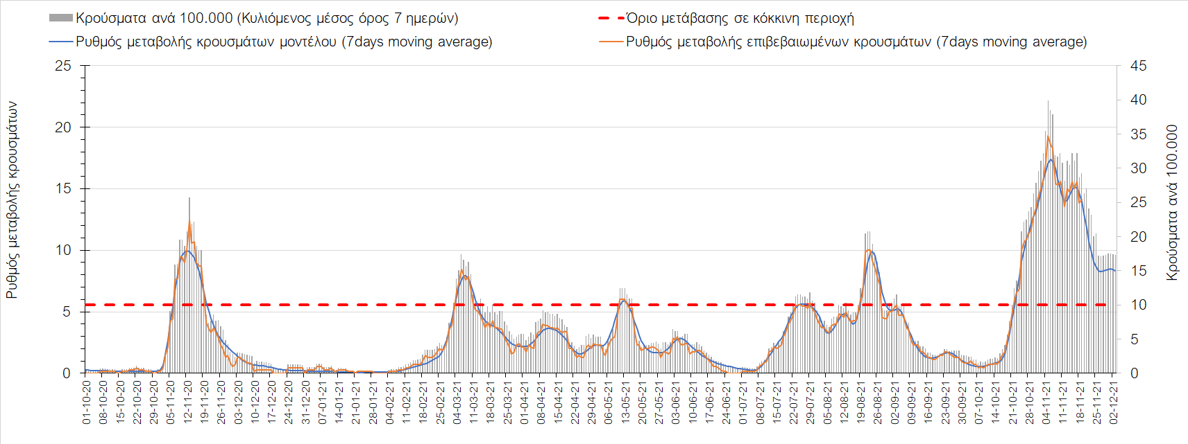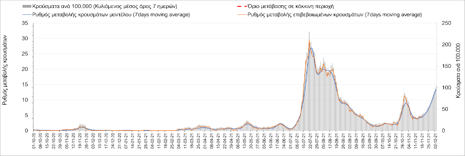 Η επιταχυνόμενη αύξηση του αριθμού των κρουσμάτων της προηγούμενης εβδομάδας, ως απόρροια της προοδευτικής μείωση της θερμοκρασίας και η επαγόμενης αύξηση της μεταδοτικότητας, που οδηγούν στην ανοδική τάση της φθινοπωρινής και χειμερινής περιόδου όπως δυστυχώς είχαμε προβλέψει, ενώ είχε δώσει τη θέση της σε μικρής διάρκειας σταθεροποίηση έως και ήπια αποκλιμάκωση, που σε σημαντικό βαθμό οφείλονταν στον αυξημένο αριθμό τεστ που αναφέραμε, πλέον συνεχίζει πάλι ανοδικά από το τέλος της εβδομάδας όπως είχαμε ανακοινώσει και νωρίτερα.