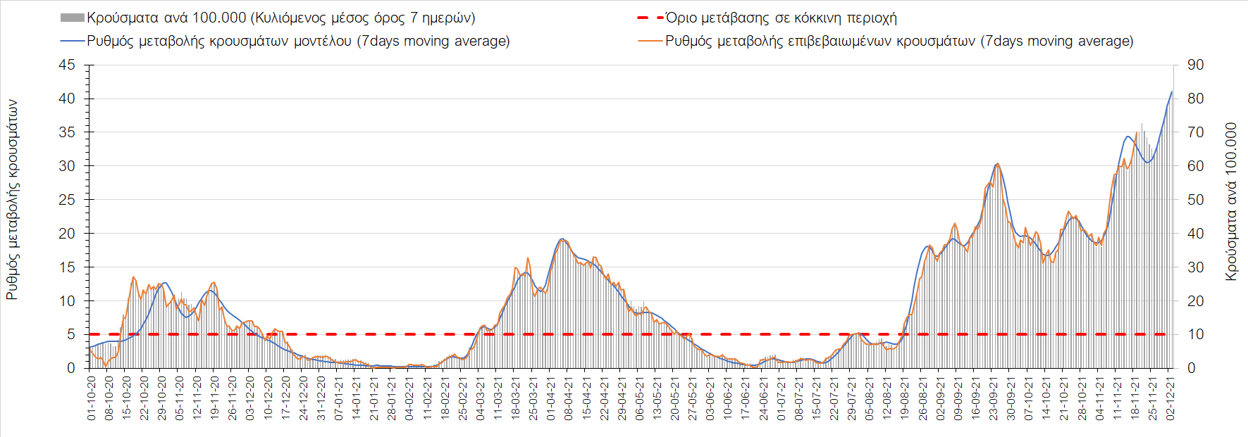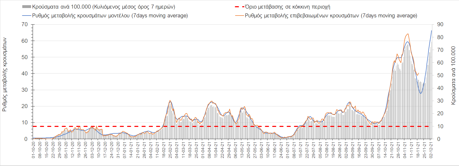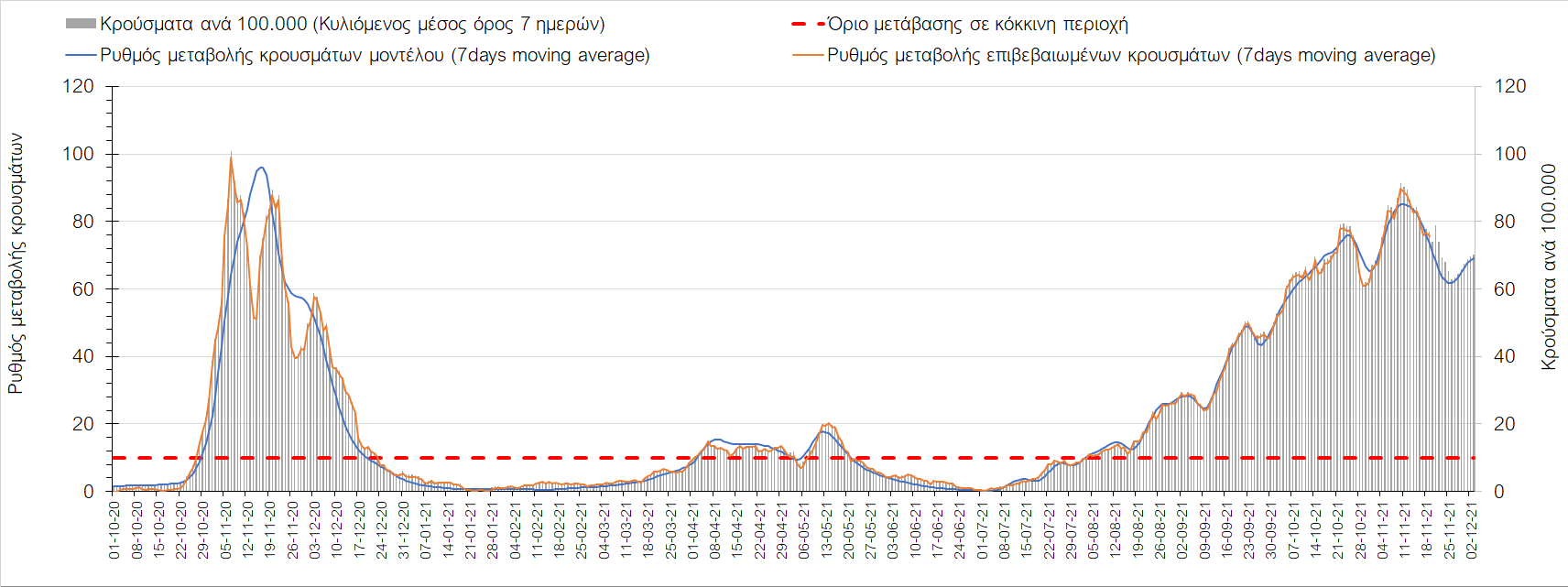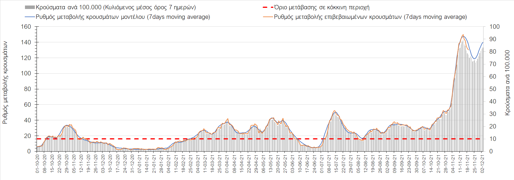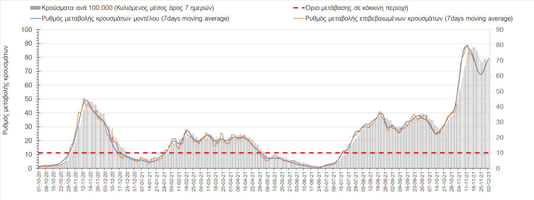 Η επιταχυνόμενη αύξηση του αριθμού των κρουσμάτων της προηγούμενης εβδομάδας, ως απόρροια της προοδευτικής μείωση της θερμοκρασίας και η επαγόμενης αύξηση της μεταδοτικότητας, που οδηγούν στην ανοδική τάση της φθινοπωρινής και χειμερινής περιόδου όπως δυστυχώς είχαμε προβλέψει, ενώ είχε δώσει τη θέση της σε μικρής διάρκειας σταθεροποίηση έως και ήπια αποκλιμάκωση, που σε σημαντικό βαθμό οφείλονταν στον αυξημένο αριθμό τεστ που αναφέραμε, πλέον συνεχίζει πάλι ανοδικά από το τέλος της εβδομάδας όπως είχαμε ανακοινώσει και νωρίτερα.