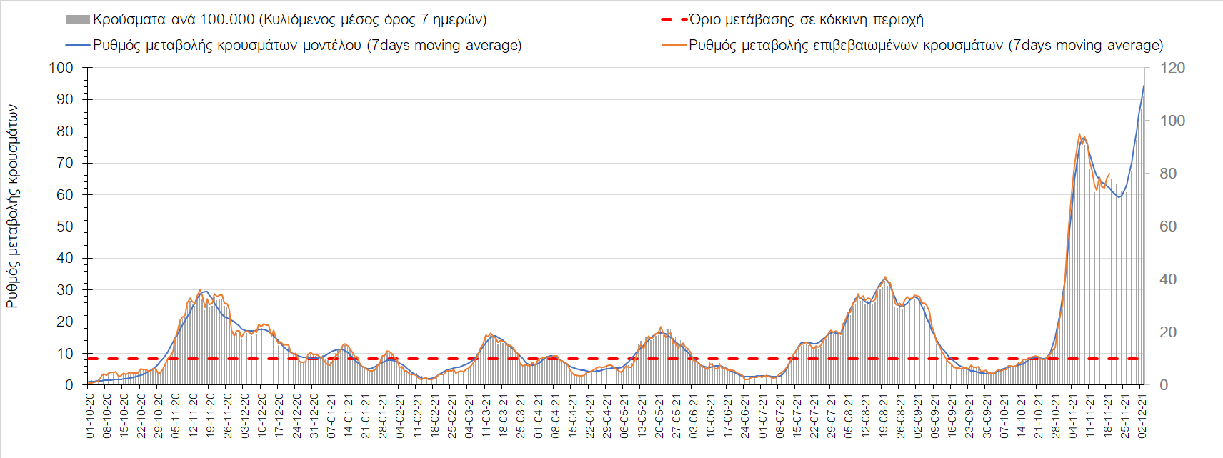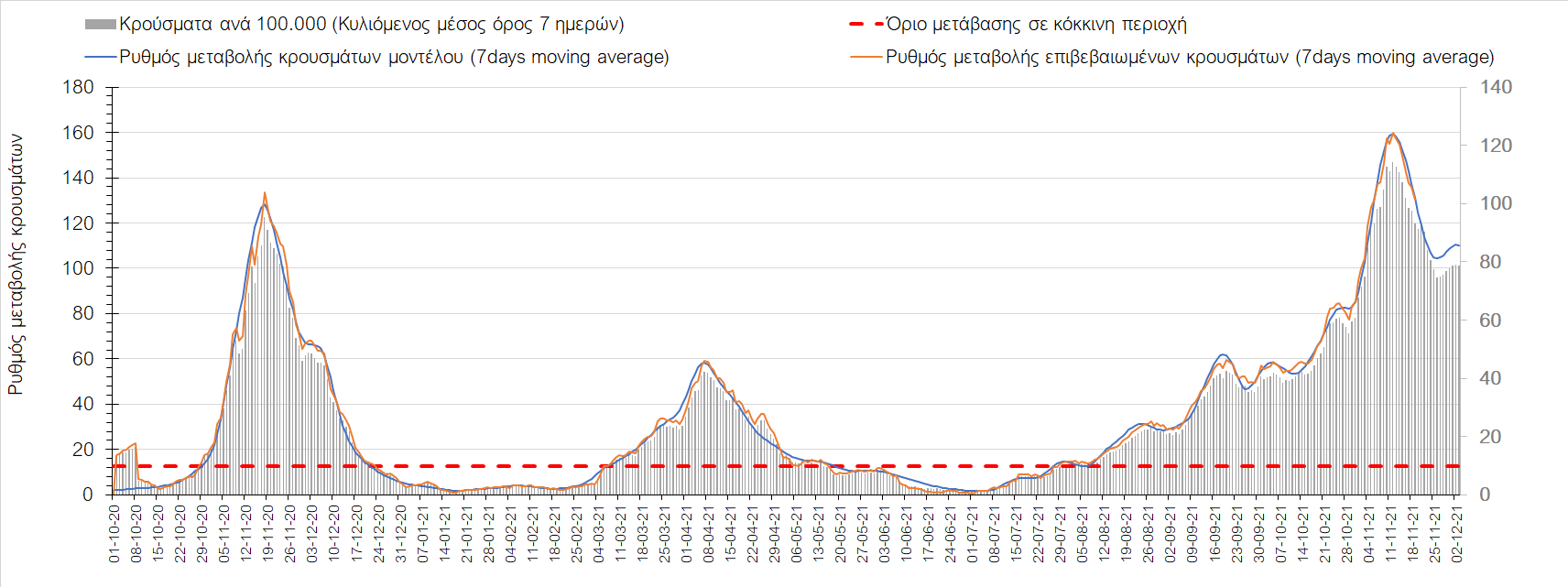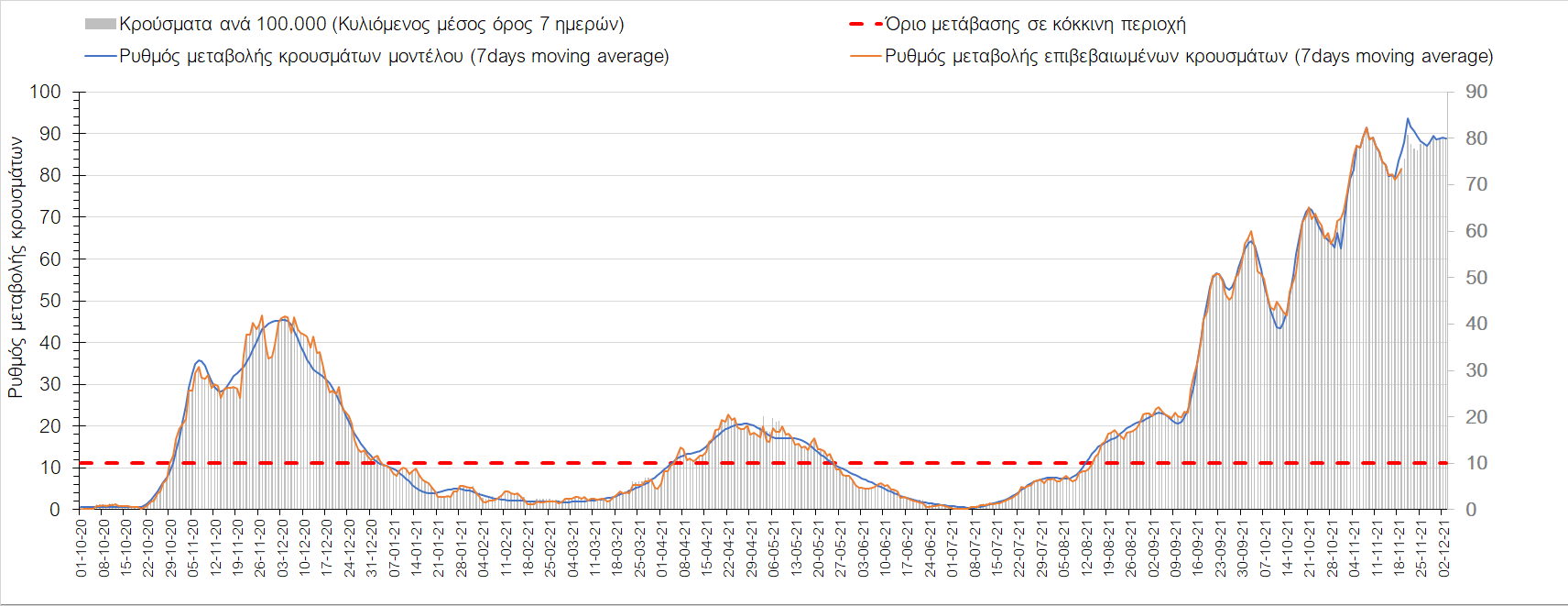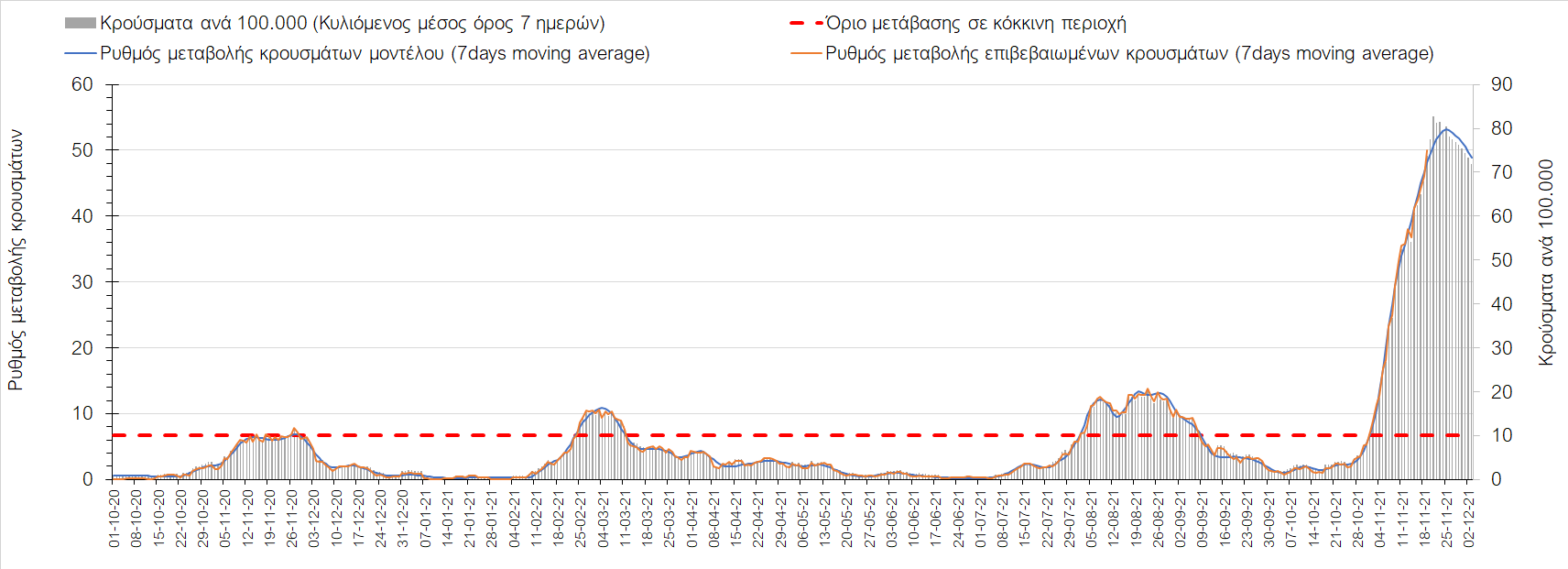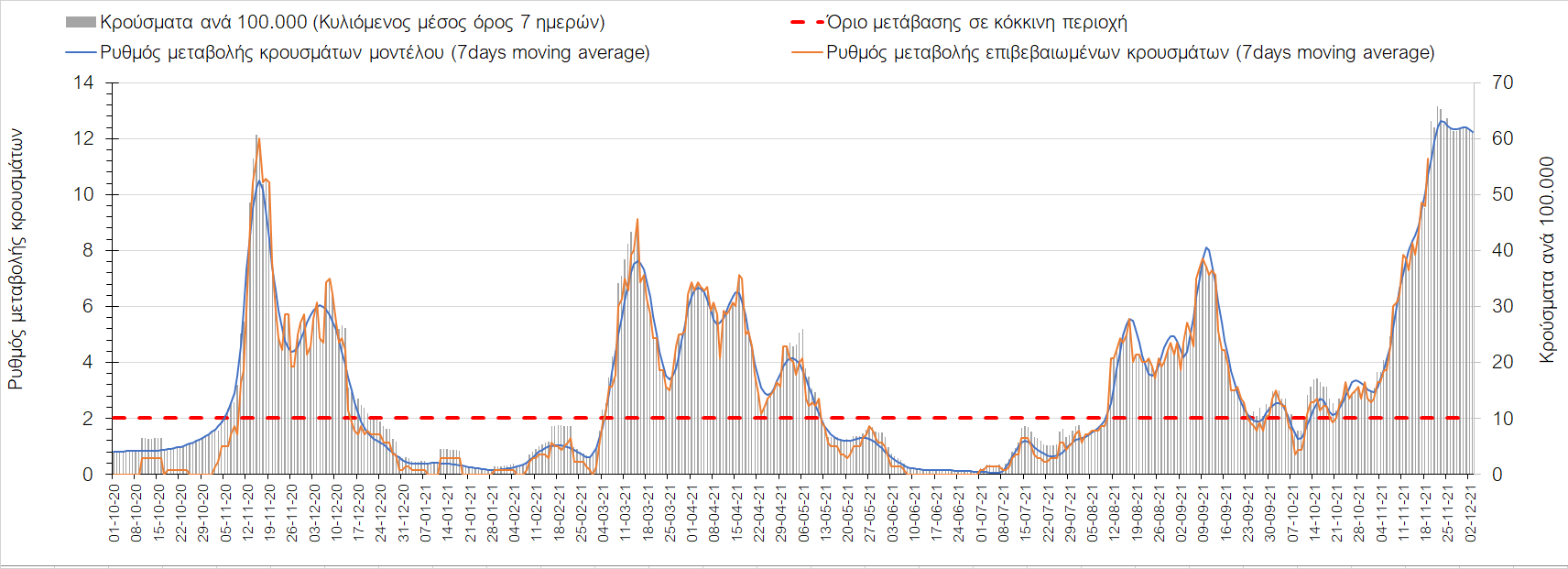Η επιταχυνόμενη αύξηση του αριθμού των κρουσμάτων της προηγούμενης εβδομάδας, ως απόρροια της προοδευτικής μείωση της θερμοκρασίας και η επαγόμενης αύξηση της μεταδοτικότητας, που οδηγούν στην ανοδική τάση της φθινοπωρινής και χειμερινής περιόδου όπως δυστυχώς είχαμε προβλέψει, ενώ είχε δώσει τη θέση της σε μικρής διάρκειας σταθεροποίηση έως και ήπια αποκλιμάκωση, που σε σημαντικό βαθμό οφείλονταν στον αυξημένο αριθμό τεστ που αναφέραμε, πλέον συνεχίζει πάλι ανοδικά από το τέλος της εβδομάδας όπως είχαμε ανακοινώσει και νωρίτερα.