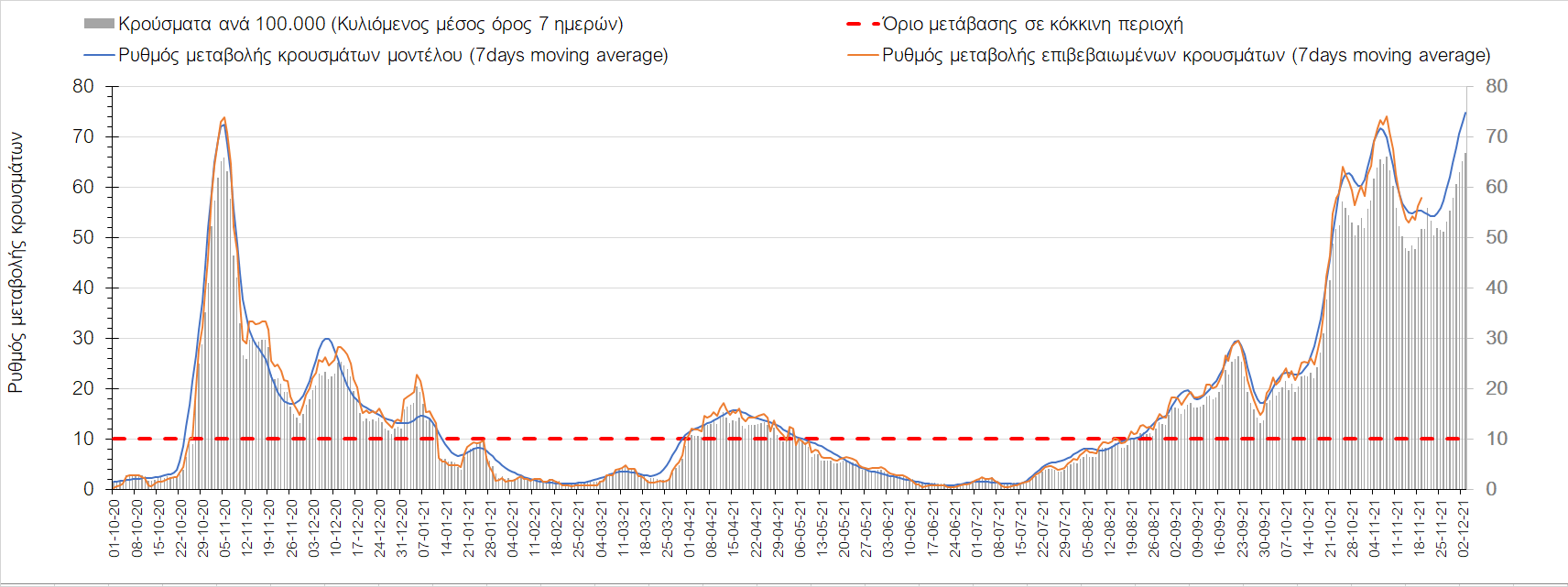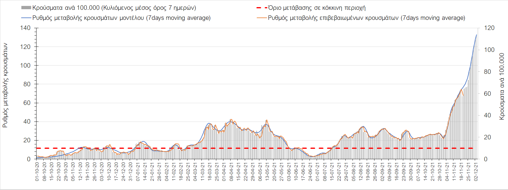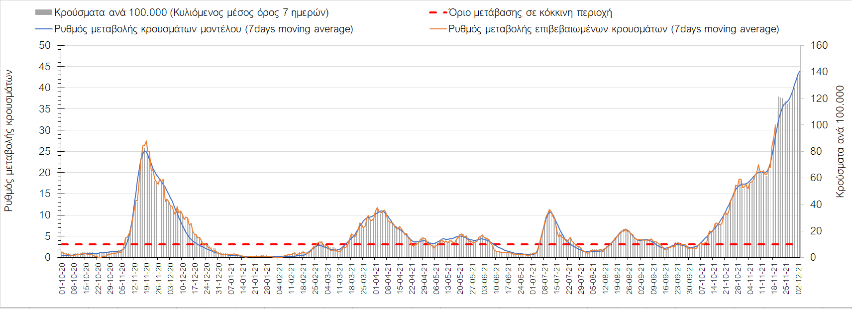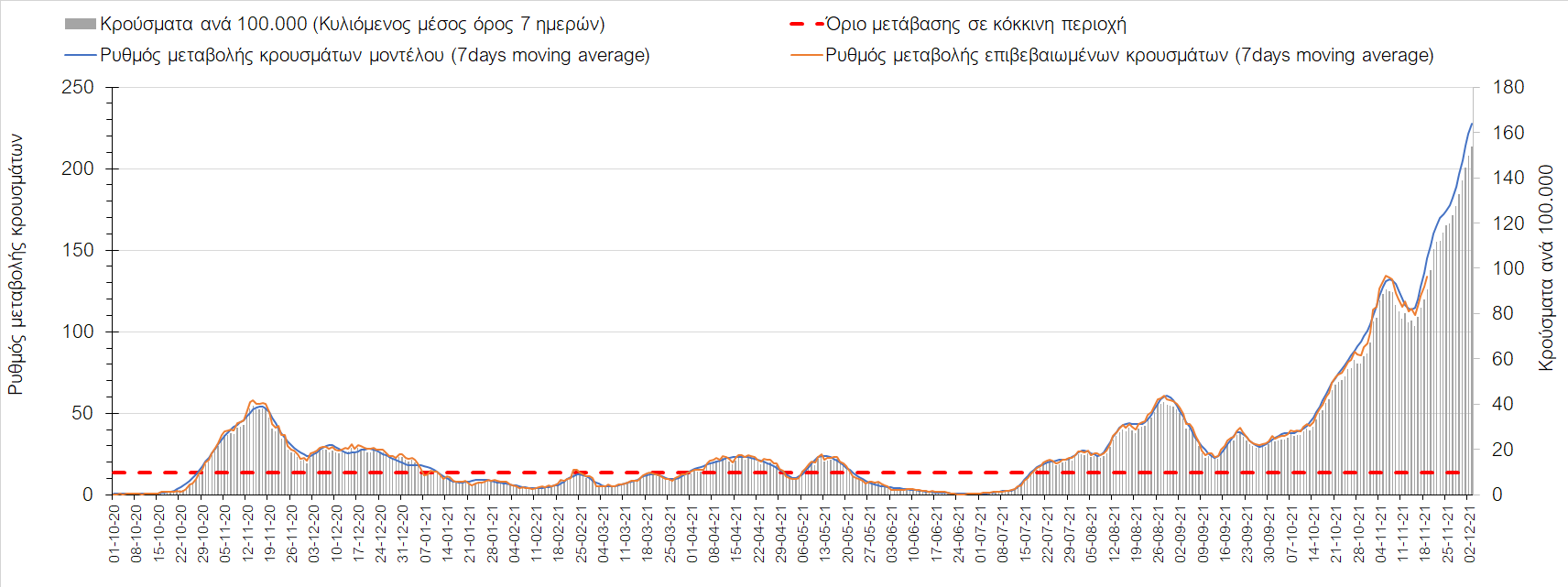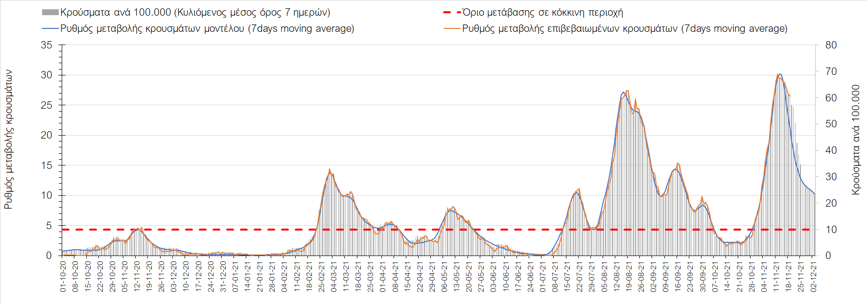 Η επιταχυνόμενη αύξηση του αριθμού των κρουσμάτων της προηγούμενης εβδομάδας, ως απόρροια της προοδευτικής μείωση της θερμοκρασίας και η επαγόμενης αύξηση της μεταδοτικότητας, που οδηγούν στην ανοδική τάση της φθινοπωρινής και χειμερινής περιόδου όπως δυστυχώς είχαμε προβλέψει, ενώ είχε δώσει τη θέση της σε μικρής διάρκειας σταθεροποίηση έως και ήπια αποκλιμάκωση, που σε σημαντικό βαθμό οφείλονταν στον αυξημένο αριθμό τεστ που αναφέραμε, πλέον συνεχίζει πάλι ανοδικά από το τέλος της εβδομάδας όπως είχαμε ανακοινώσει και νωρίτερα.