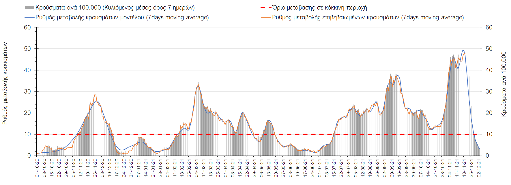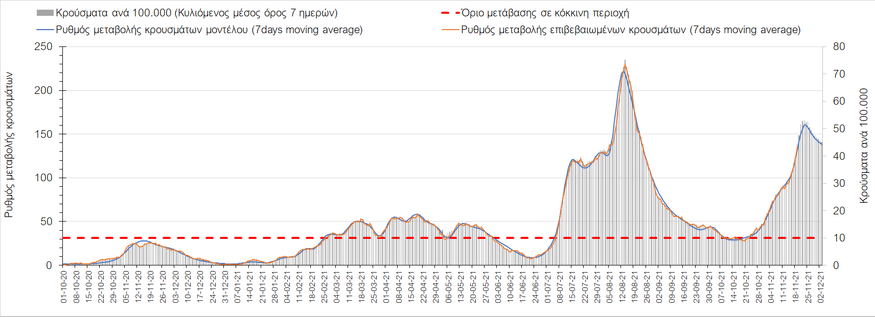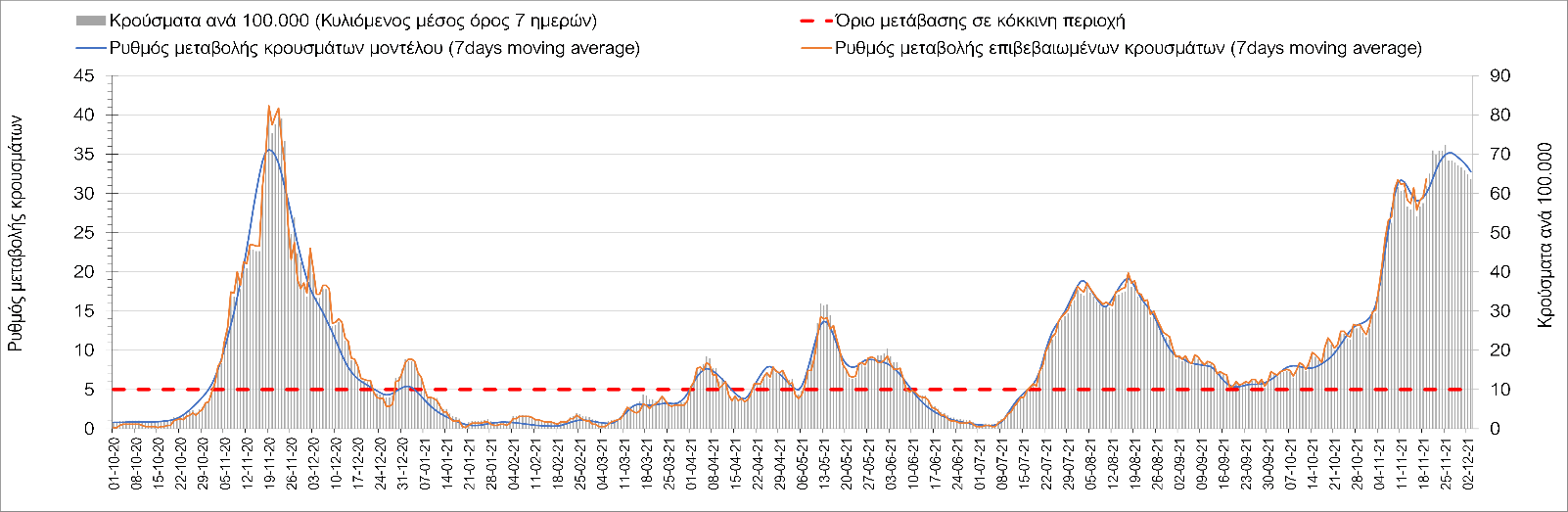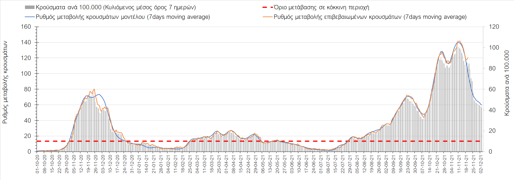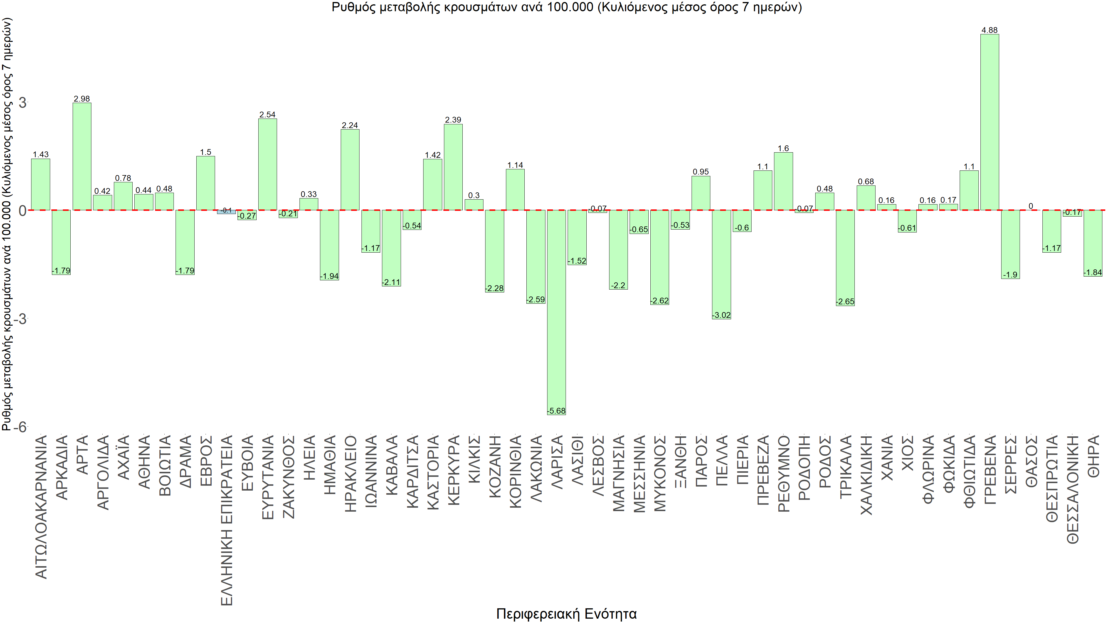 Η αποτύπωση των τάσεων στις επιμέρους περιοχές, παρουσιάζεται στο Σχήμα 61, όπου παρουσιάζεται ο ρυθμός μεταβολής των νέων κρουσμάτων ανά 100.000 κατοίκους (κυλιόμενος μέσος όρος 7 ημερών) των επιμέρους περιοχών. Θετικές τιμές του ρυθμού μεταβολής υποδηλώνουν άνοδο, ενώ αρνητικές τιμές υποδηλώνουν πτωτική πορεία. Το σχήμα αυτό είναι ιδιαίτερα κατατοπιστικό, γιατί οι τιμές που παρουσιάζονται είναι κανονικοποιημένες ως προς τον πληθυσμό, και η σύγκριση των τάσεων ανάμεσα στις επιμέρους περιοχές είναι άμεση.