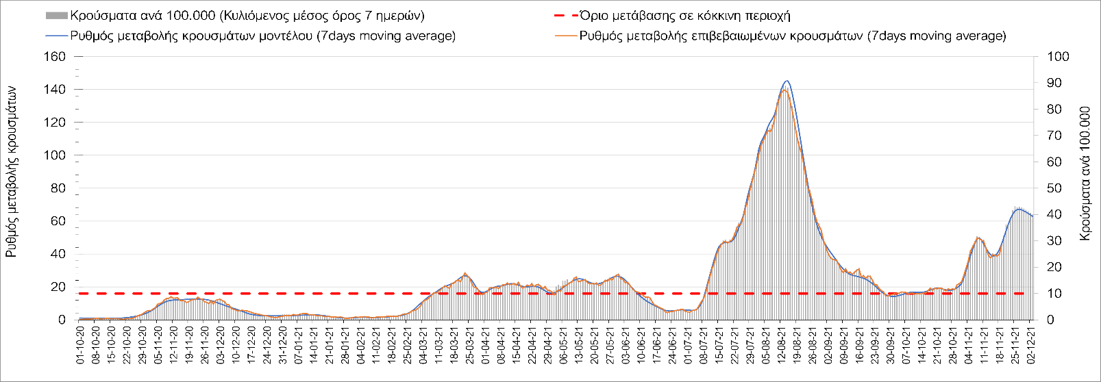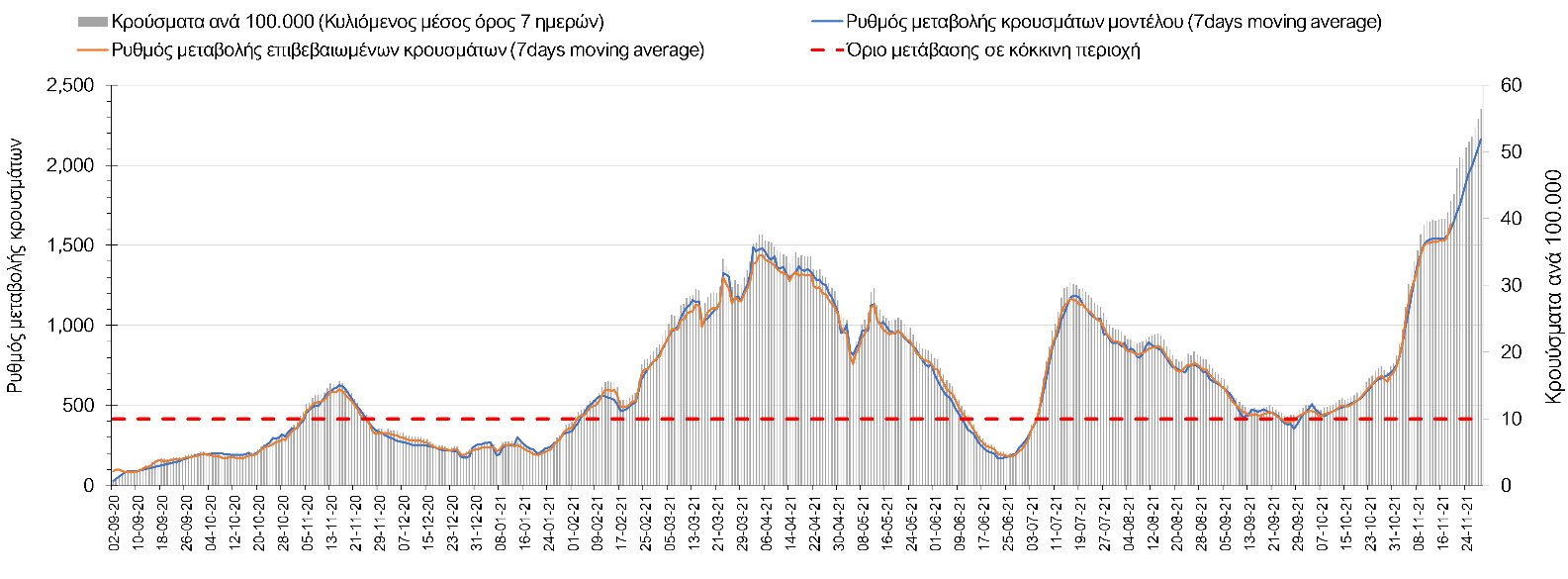 Η πορεία της μέσης εβδομαδιαίας τιμής των κρουσμάτων, καθώς και του κυλιόμενου μέσου όρου 7 ημερών του αριθμού των κρουσμάτων ανά 100.000 πληθυσμού, όπως έχουν καταγραφεί από τον ΕΟΔΥ και η αναμενόμενη πορεία τους όπως προδιαγράφεται από την υπολογιστική πλατφόρμα CORE για την Ελληνική επικράτεια μέχρι τις 30 Νοεμβρίου, αποτυπώνονται στο Σχήμα 4. Αυτή η προβλεπόμενη πορεία, που αφορά τα κρούσματα, τους νοσηλευόμενους σε απλές κλίνες, όσο και σε ΜΕΘ, καθώς επίσης και τους θανάτους, βασίζεται στις ακόλουθες παραδοχές: