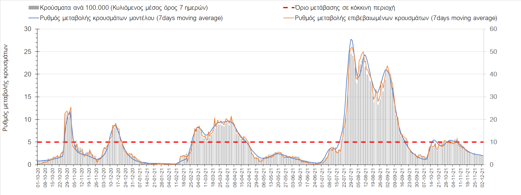 - πιθανώς αρχίζει να γίνεται πιο έντονη η επίδραση της απώλειας της ανοσίας από ήδη εμβολιασμένους στους οποίους έχει παρέλθει το εξάμηνο από το δεύτερο εμβολιασμό. Αυτή η παράμετρος, θα αποδειχθεί καθοριστική για την αποκλιμάκωση που προβλέπουμε μετά τις αρχές Δεκεμβρίου, και πιθανότατα να δημιουργηθεί επόμενο κύμα ή παράταση του ιδίου, στην περίπτωση που δεν προχωρήσουν οι αναμνηστικές δόσεις κι αρχίσει να υποχωρεί ξανά το τείχος ανοσίας που έχει ήδη δημιουργηθεί.