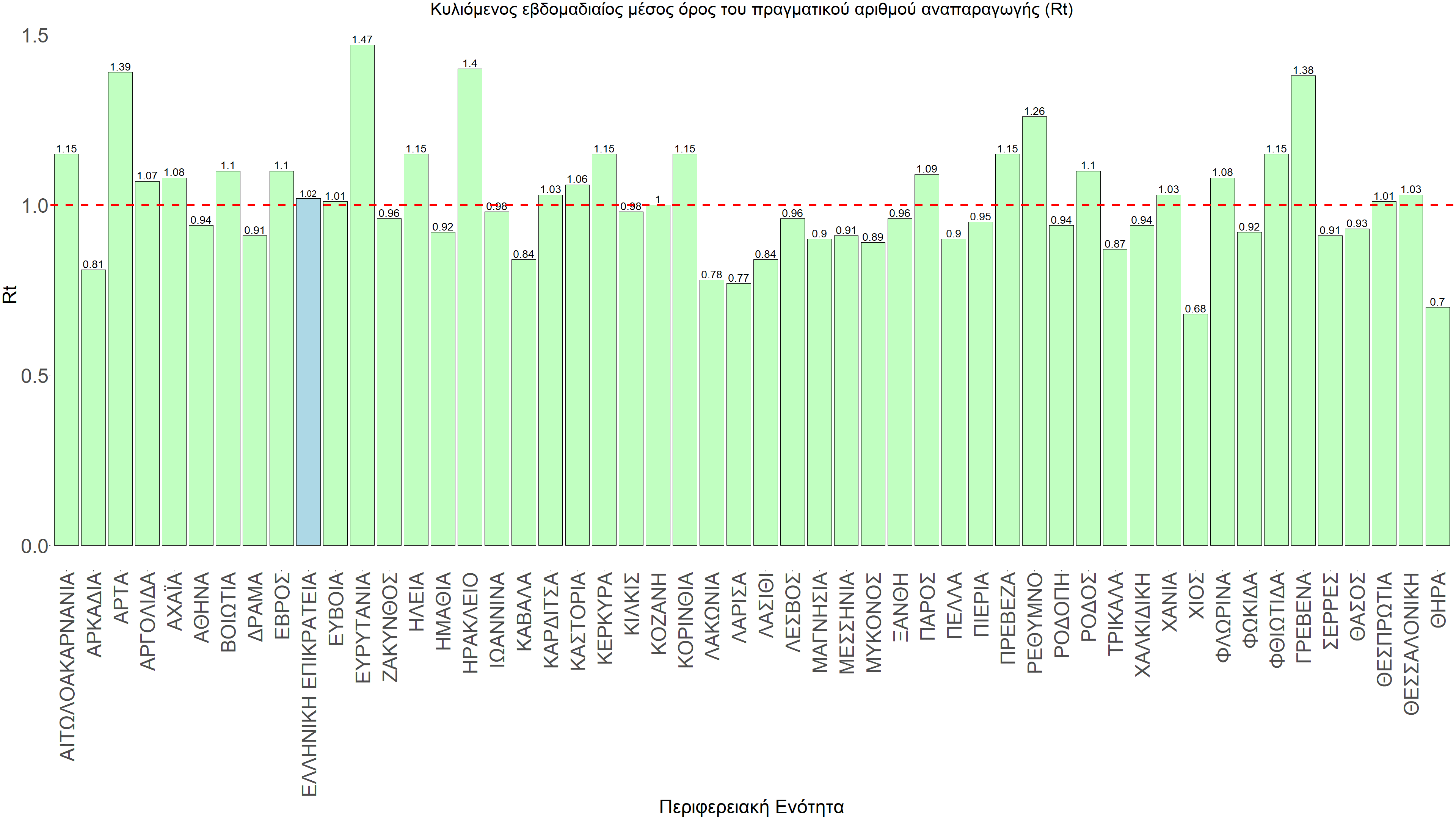 O πραγματικός αριθμός αναπαραγωγής Rt ανά περιφερειακή ενότητα της χώρας παρουσιάζεται στο Σχήμα 58.