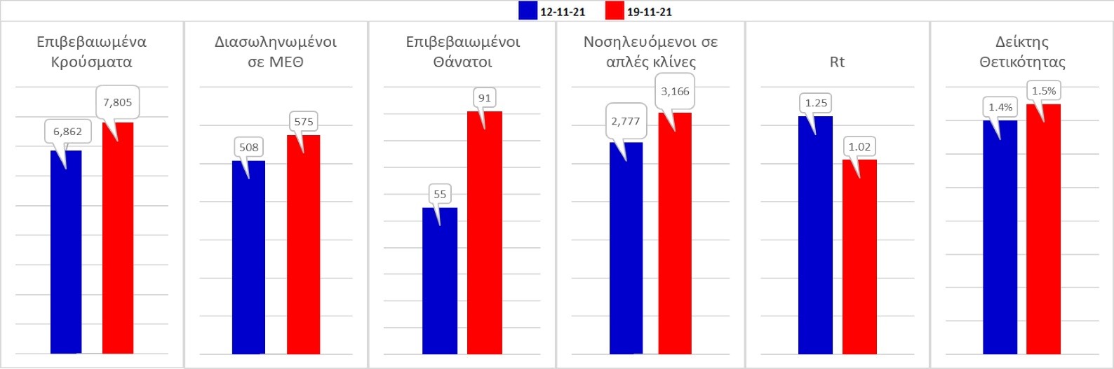 Σχήμα 59. Συγκριτικά αποτελέσματα της επιδημιολογικής εικόνας της σημερινής Παρασκευής (19/11/2021) σε σχέση με την προηγούμενη (12/11/2021)