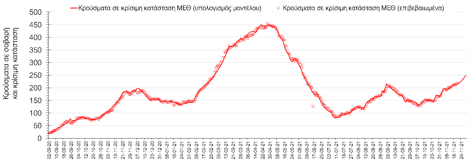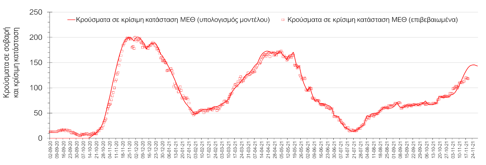 Όσον αφορά στους ασθενείς σε κρίσιμη κατάσταση (διασωληνωμένοι σε ΜΕΘ), ο αριθμός είναι σημαντικά αυξημένος σε σχέση με την Πέμπτη(575 από 556). Η καμπύλη εξέλιξης του αριθμού των ασθενών που νοσηλεύονται σε κλίνες ΜΕΘ με βάση τις προσομοιώσεις της πλατφόρμας CORE, παρουσιάζεται στο Σχήμα 1, των ασθενών που νοσηλεύονται σε απλές κλίνες στο Σχήμα 2 (όπου διαφαίνεται πλέον η αναμενόμενη αύξηση στις νοσηλείες), ενώ η εκτίμησή μας για την πορεία των θανάτων ανά ημέρα παρουσιάζεται στο Σχήμα 3.