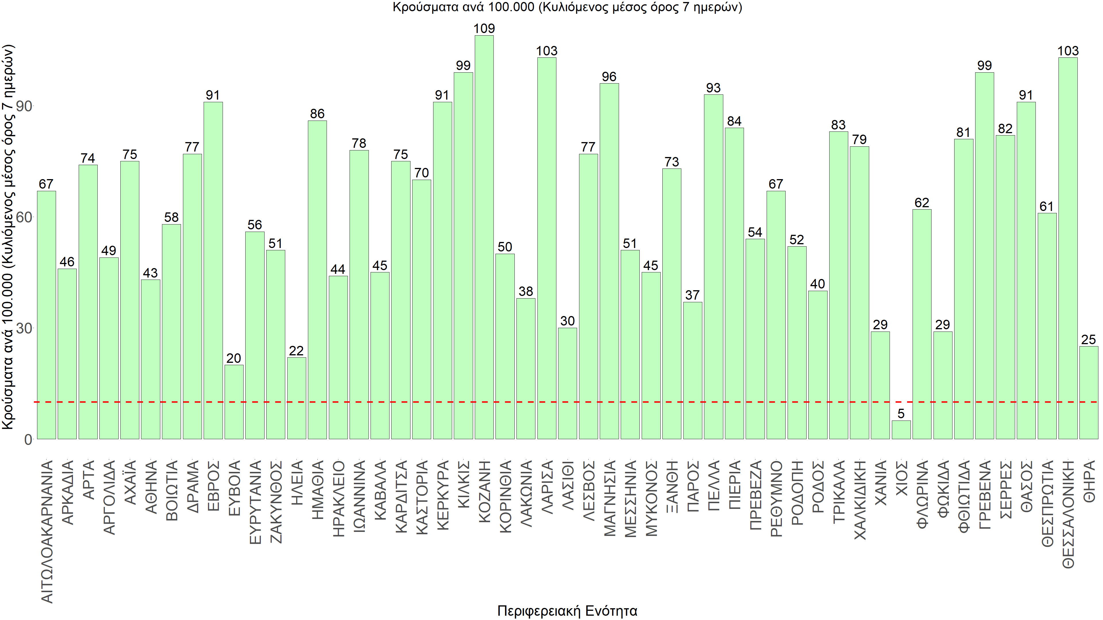 Σχήμα 60. Συγκεντρωτική εικόνα των νέων κρουσμάτων ανά 100.000 κατοίκους (κυλιόμενος μέσος όρος 7 ημερών) των επιμέρους περιοχών