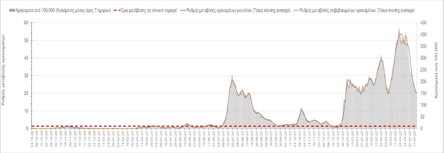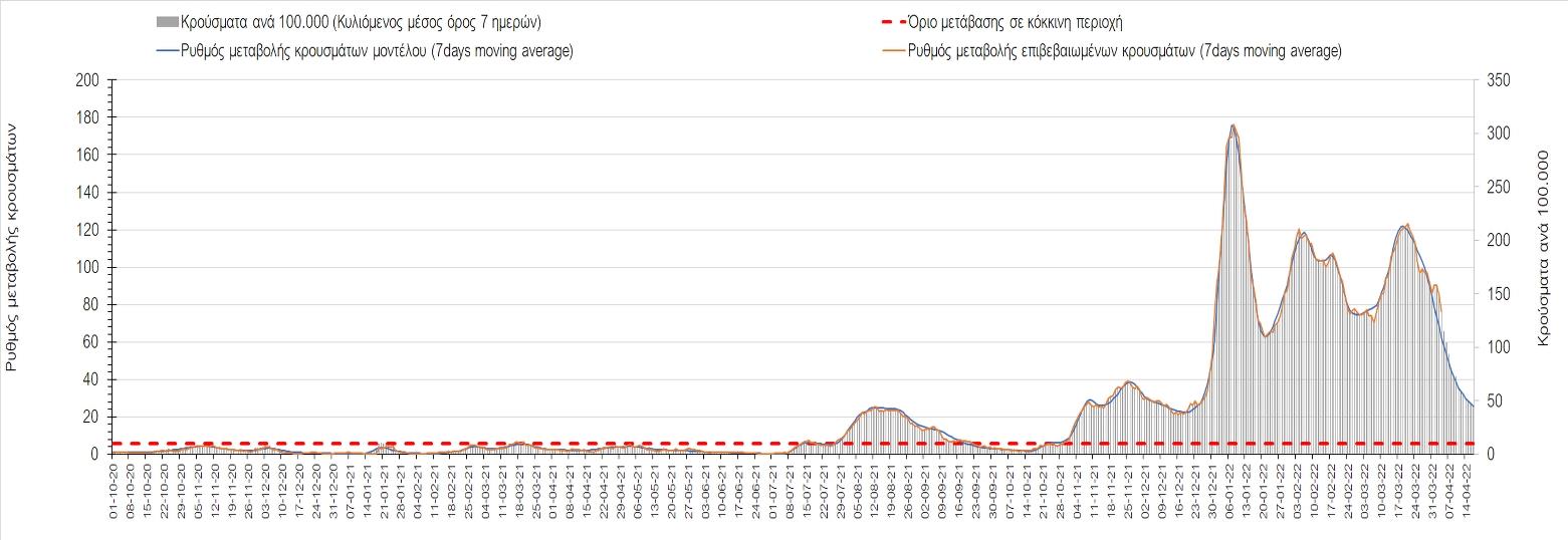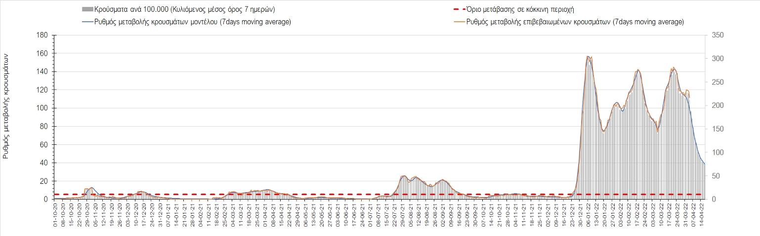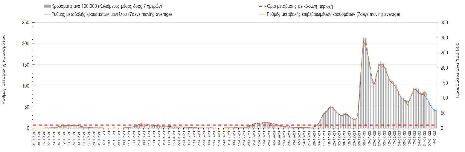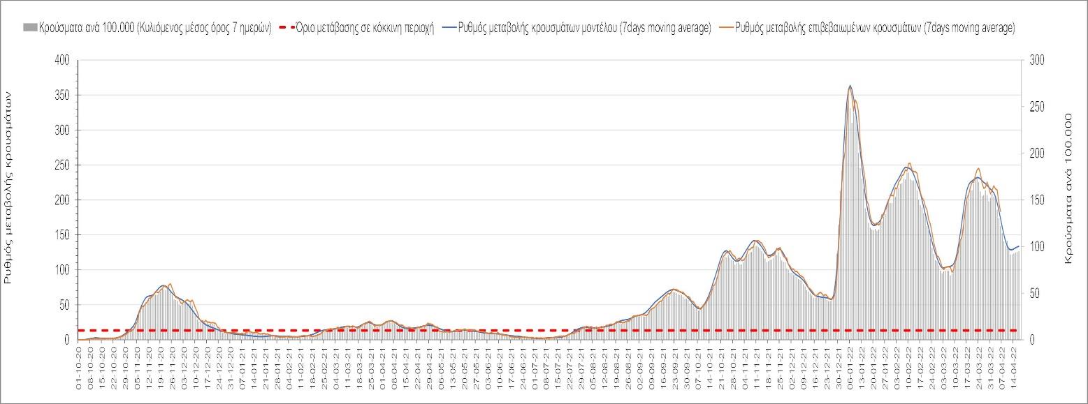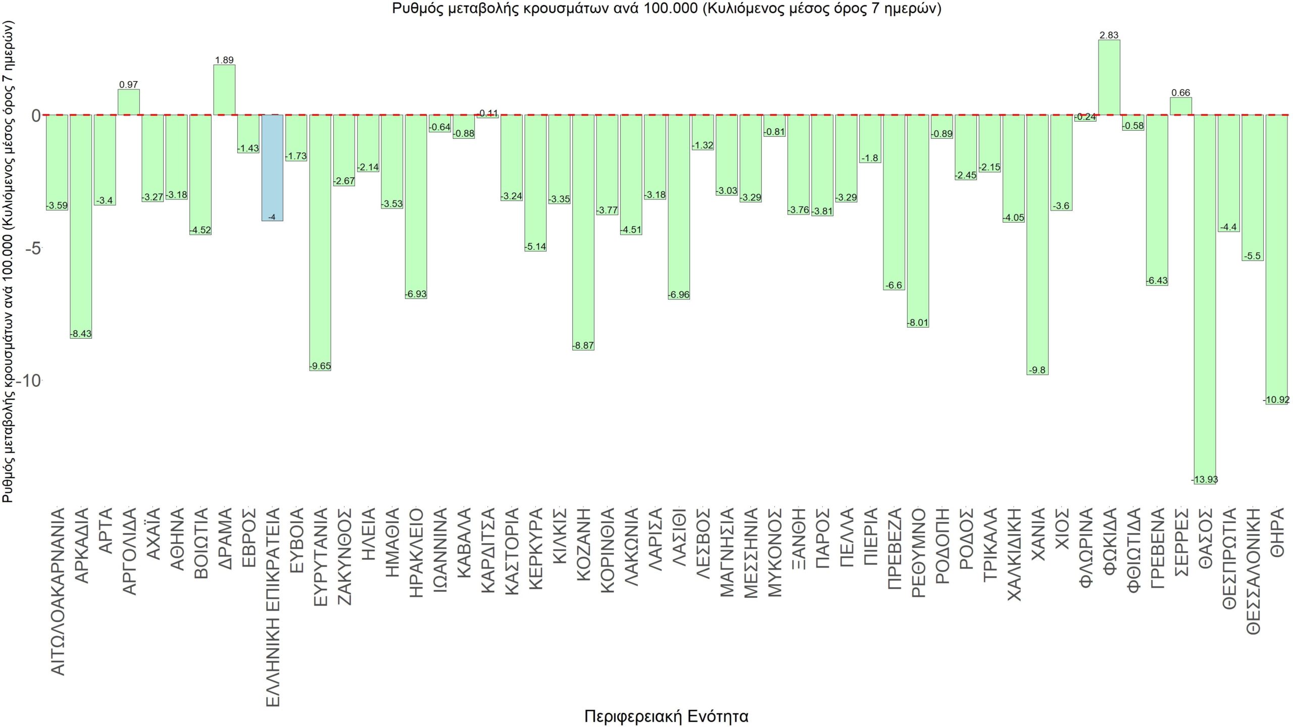 Η αποτύπωση των τάσεων στις επιμέρους περιοχές, παρουσιάζεται στο Σχήμα 61, όπου παρουσιάζεται ο ρυθμός μεταβολής των νέων κρουσμάτων ανά 100.000 κατοίκους (κυλιόμενος μέσος όρος 7 ημερών) των επιμέρους περιοχών. Θετικές τιμές του ρυθμού μεταβολής υποδηλώνουν άνοδο, ενώ αρνητικές τιμές υποδηλώνουν πτωτική πορεία.