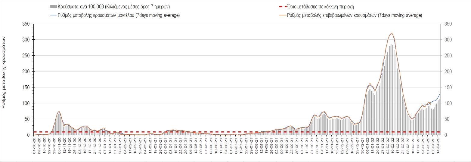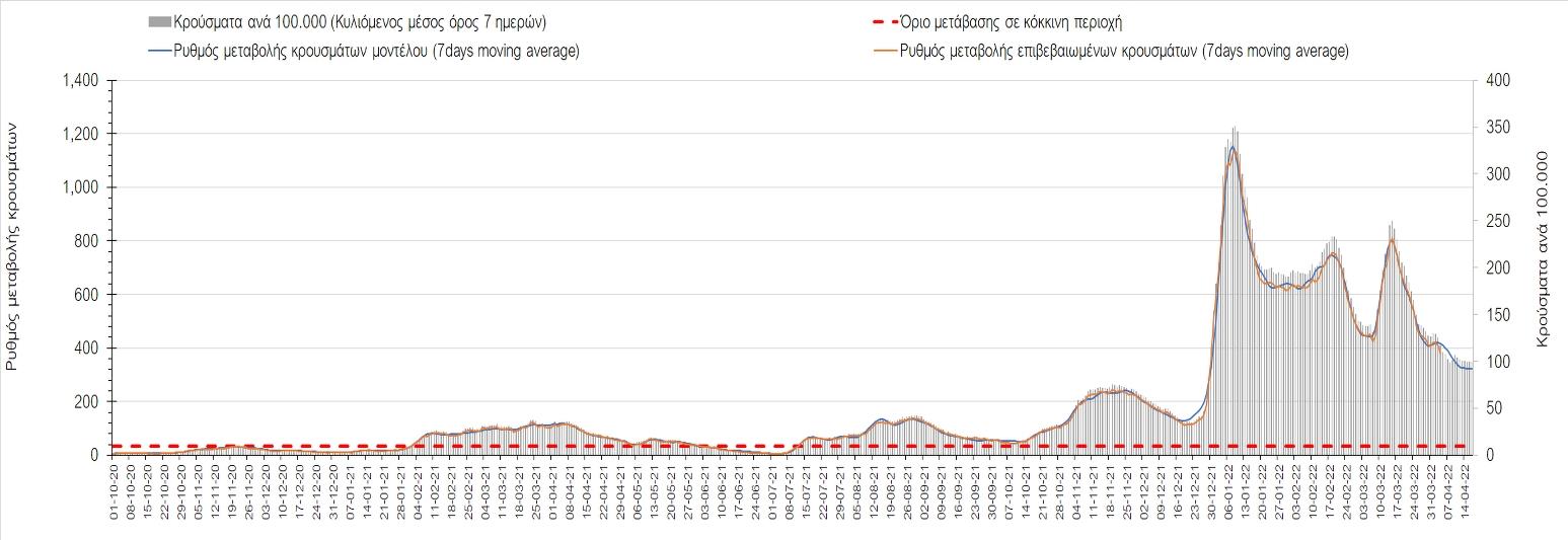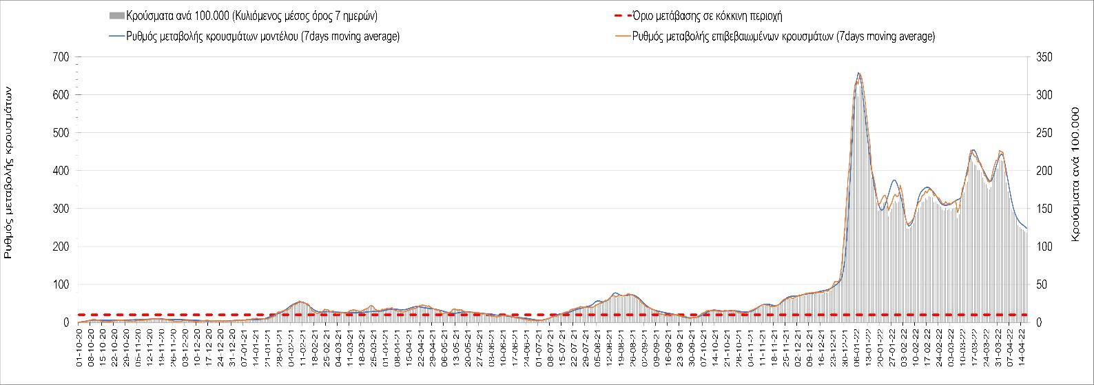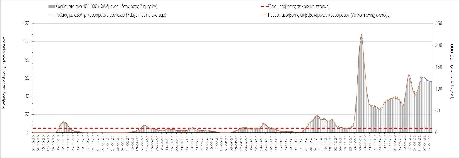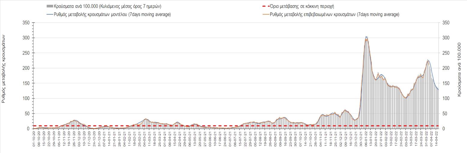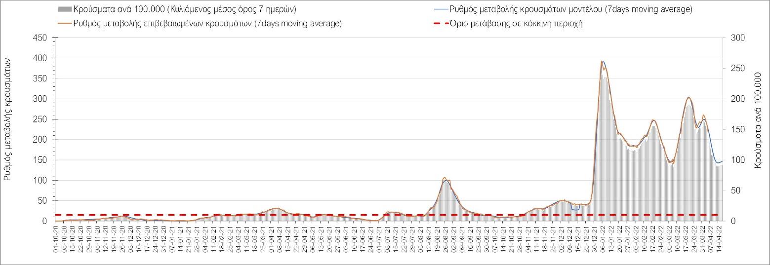 Η αποτύπωση των τάσεων στις επιμέρους περιοχές, παρουσιάζεται στο Σχήμα 61, όπου παρουσιάζεται ο ρυθμός μεταβολής των νέων κρουσμάτων ανά 100.000 κατοίκους (κυλιόμενος μέσος όρος 7 ημερών) των επιμέρους περιοχών. Θετικές τιμές του ρυθμού μεταβολής υποδηλώνουν άνοδο, ενώ αρνητικές τιμές υποδηλώνουν πτωτική πορεία.