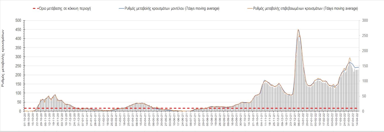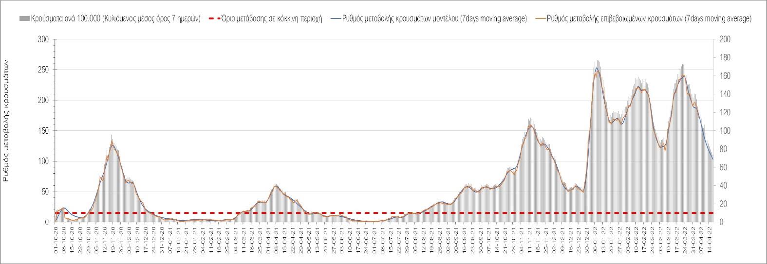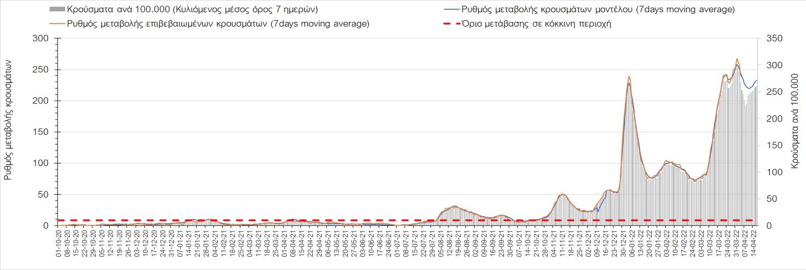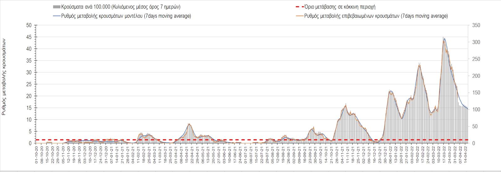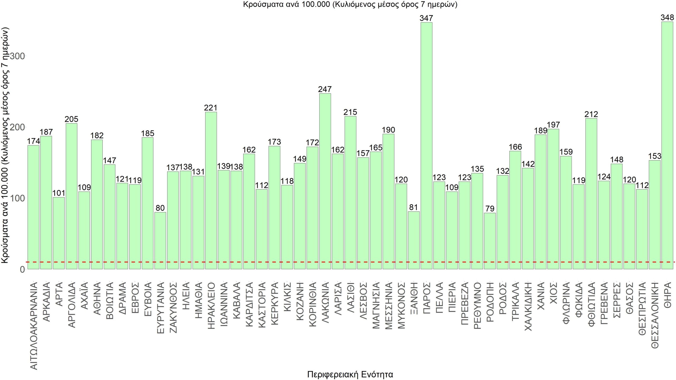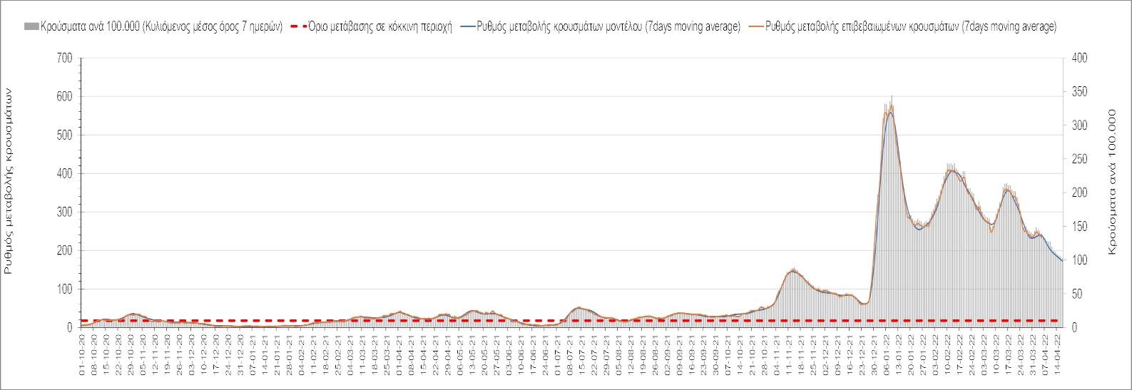 Η αποτύπωση των τάσεων στις επιμέρους περιοχές, παρουσιάζεται στο Σχήμα 61, όπου παρουσιάζεται ο ρυθμός μεταβολής των νέων κρουσμάτων ανά 100.000 κατοίκους (κυλιόμενος μέσος όρος 7 ημερών) των επιμέρους περιοχών. Θετικές τιμές του ρυθμού μεταβολής υποδηλώνουν άνοδο, ενώ αρνητικές τιμές υποδηλώνουν πτωτική πορεία.