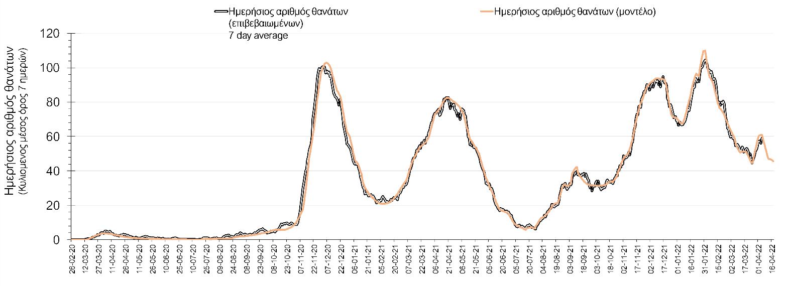 Ο αριθμός ημερήσιων θανάτων (70) που καταγράφηκε τη Δευτέρα είναι μεγαλύτερος σε σχέση με την Κυριακή (62). Όπως είχαμε προβλέψει ο κυλιόμενος εβδομαδιαίος μέσος όρος που είναι 59,0 παραμένει υψηλός, και τόσο ο αριθμός, όσο και η τάση του, δε συνάδει με τον αριθμό των νοσηλειών σε κρίσιμη κατάσταση (διασωληνωμένοι σε ΜΕΘ).