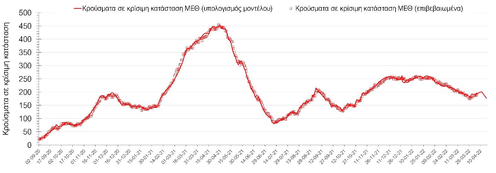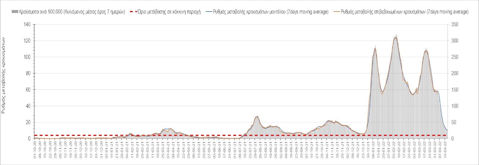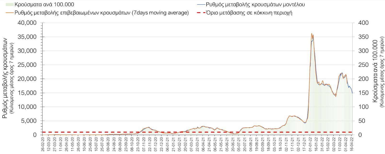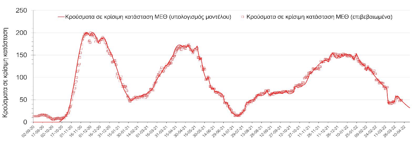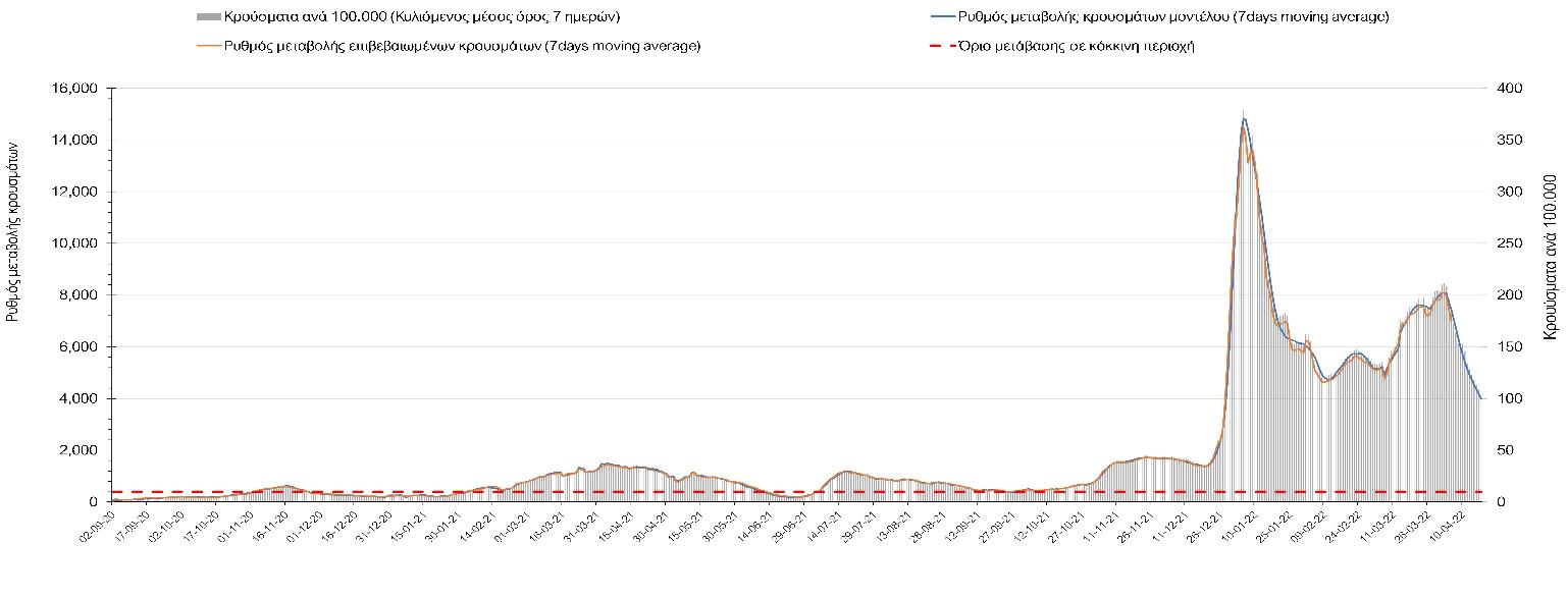 Η πορεία της μέσης εβδομαδιαίας τιμής των κρουσμάτων, καθώς και του κυλιόμενου μέσου όρου 7 ημερών του αριθμού των κρουσμάτων ανά 100.000 πληθυσμού, όπως έχουν καταγραφεί από τον ΕΟΔΥ και η αναμενόμενη πορεία τους, όπως προδιαγράφεται από την υπολογιστική πλατφόρμα CORE για την Ελληνική επικράτεια (όπως και στην Αττική και τη Θεσσαλονίκη) μέχρι τις 15 Απριλίου, αποτυπώνονται στο Σχήμα 4. Αυτή η προβλεπόμενη πορεία, που αφορά τα κρούσματα, τους νοσηλευόμενους σε απλές κλίνες, όσο και σε ΜΕΘ, καθώς επίσης και τους θανάτους, βασίζεται στις ακόλουθες παραδοχές:
