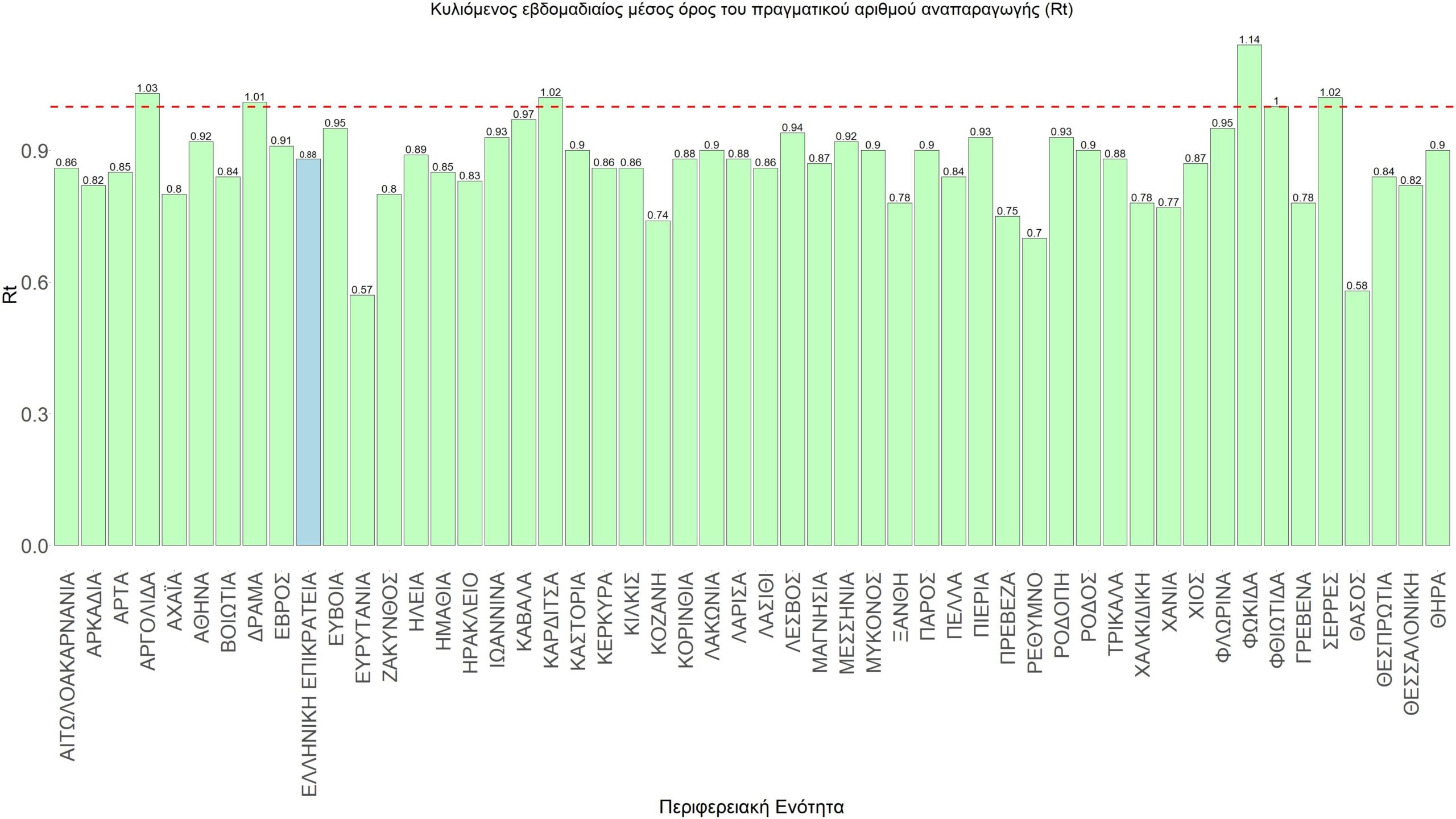O πραγματικός αριθμός αναπαραγωγής Rt ανά περιφερειακή ενότητα της χώρας παρουσιάζεται στο Σχήμα 58.