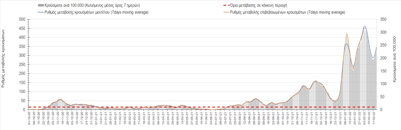 Η τάση σταθεροποίησης της διασποράς (παρά τις πτωτικές διακυμάνσεις που πιθανότατα αντικατοπτρίζουν το άτυπο lockdown της Αττικής λόγω της κακοκαιρίας της προηγούμενης εβδομάδας) που διαμορφώνεται εκ νέου αντικατοπτρίζεται και στον ημερήσιο αριθμό των κρουσμάτων (κυλιόμενος μέσος όρος 7 ημερών), ο οποίος βρίσκεται πάνω από τις 18.000 (18.045). Για να επανέλθει η ταχεία αποκλιμάκωση της πανδημίας, πέρα από την εφαρμογή των μέτρων (σε συνδυασμό με την σημαντική συνειδητοποίηση εκ μέρους του πληθυσμού ότι χρειάζεται προσοχή και σύνεση για την αντιμετώπιση της διασποράς της παραλλαγής Ο), θα πρέπει να στοχεύσουμε στη διατήρηση και την επέκταση της επίκτητης ανοσίας του πληθυσμού, αλλά και στον πολύ μεγάλο αριθμό των τεστ συνολικά (μοριακά, rapid και self-test) που πραγματοποιούνται καθημερινά, των οποίων ο αριθμός έχει φθάσει σε ημερήσια βάση τις 700.000. Αυτά σε συνδυασμό με τη φυσική ανοσία του πληθυσμού μετά από νόσηση, θα συντελέσουν στην συστηματική αποκλιμάκωση της πανδημίας. Αντίθετα, με τον υπάρχοντα ρυθμό εμβολιασμού αναμνηστικών δόσεων, θα υπάρξει ανοδική πορεία όλο το Φεβρουάριο.