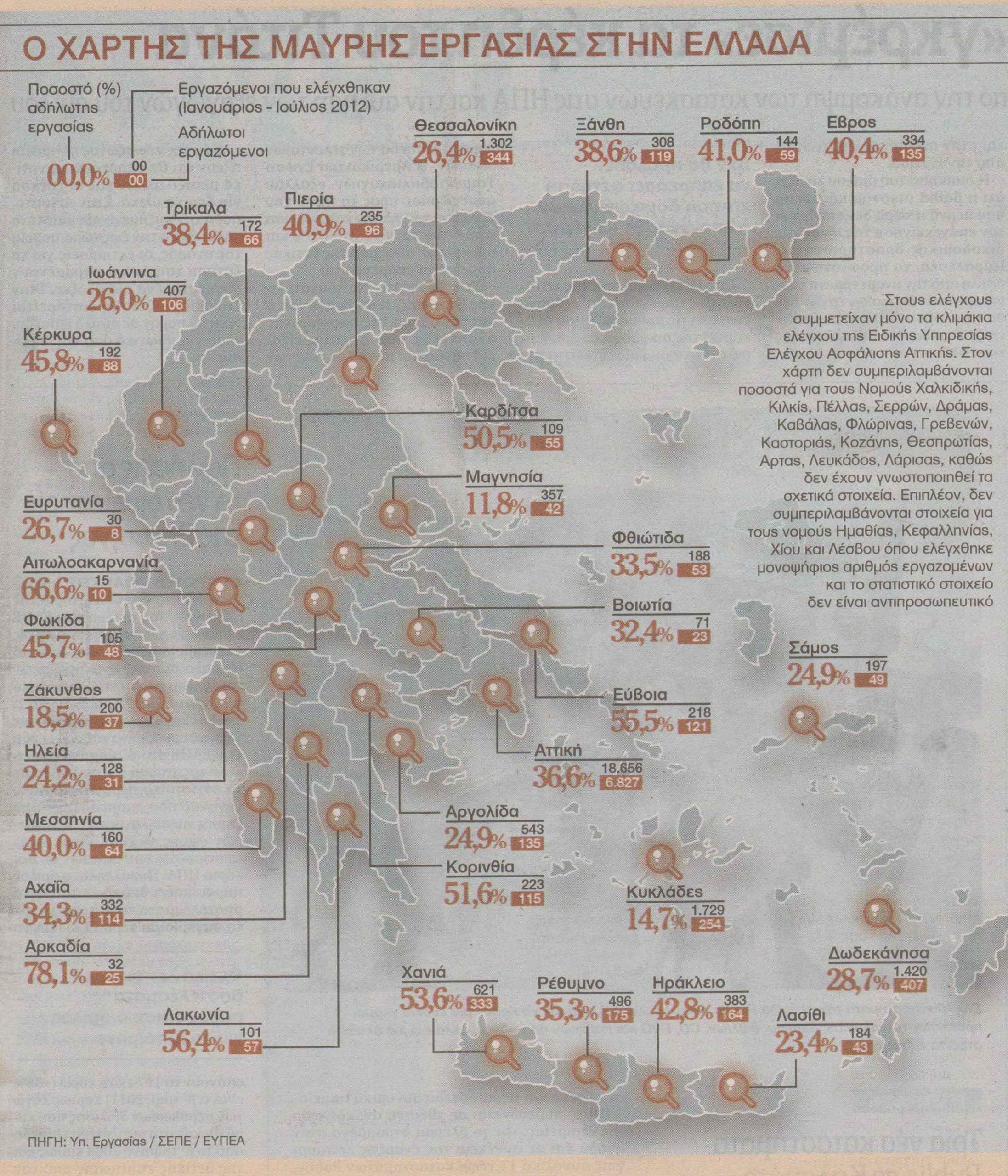 Ανασφάλιστο είναι το 50% των εργαζομένων σε επτά νομούς της χώρας, σύμφωνα με στοιχεία του Υπουργείου Εργασίας, για το διάστημα Ιανουαρίου-Ιουλίου 2012. Το ποσοστό των ανασφάλιστων σε όλη την Ελλάδα, φτάνει στο 35%.Ρεκόρ αδήλωτης εργασίας, σύμφωνα με το δημοσίευμα των Νέων, με ποσοστό 78,1% καταγράφεται στην Αρκαδία, στην Αιτωλοακαρνανία με 66,6%, στη Λακωνία με 56,4%, στην Εύβοια με 55,5%, στα Χανιά με 53,6% και στην Κορινθία με 51,6%.